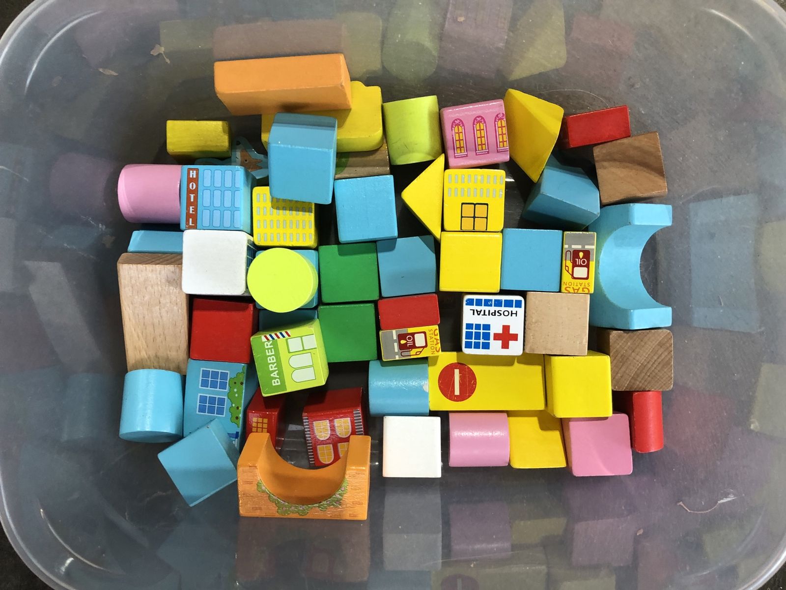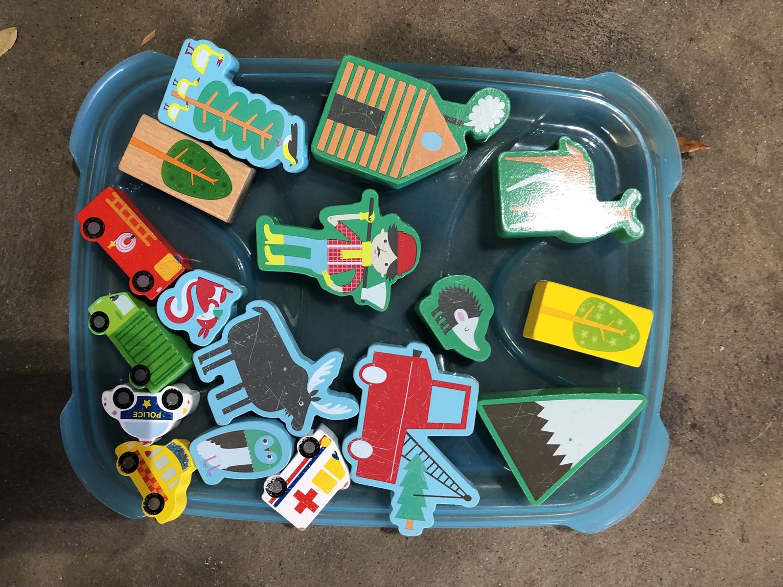 Set of wooden blocks that can be arranged in multiple ways to make a little city. Comes with some extra blocks that are not the same size. The people and animal figures are much bigger- fun for kids to play Godzilla with.