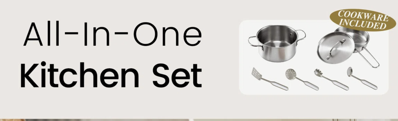 Includes a chef set with a pot, pan, and stainless steel utensils so imaginative cooking starts right out of the box.