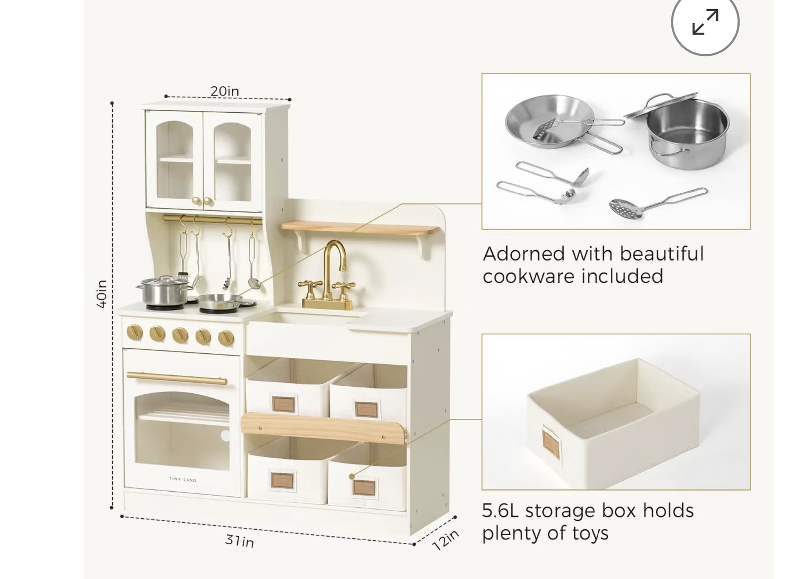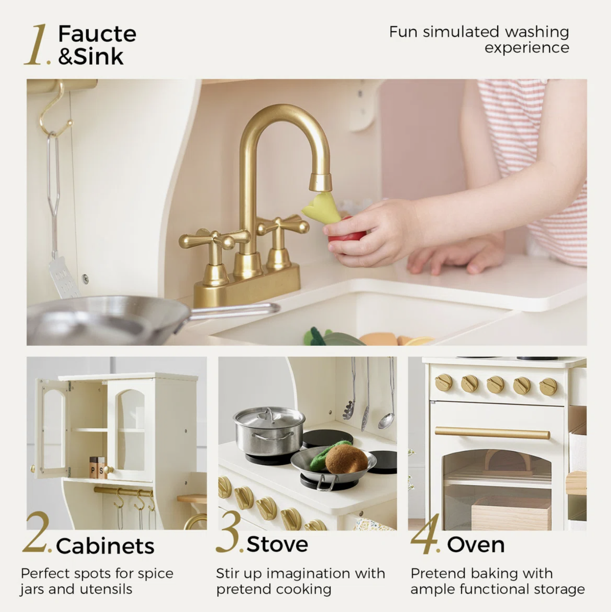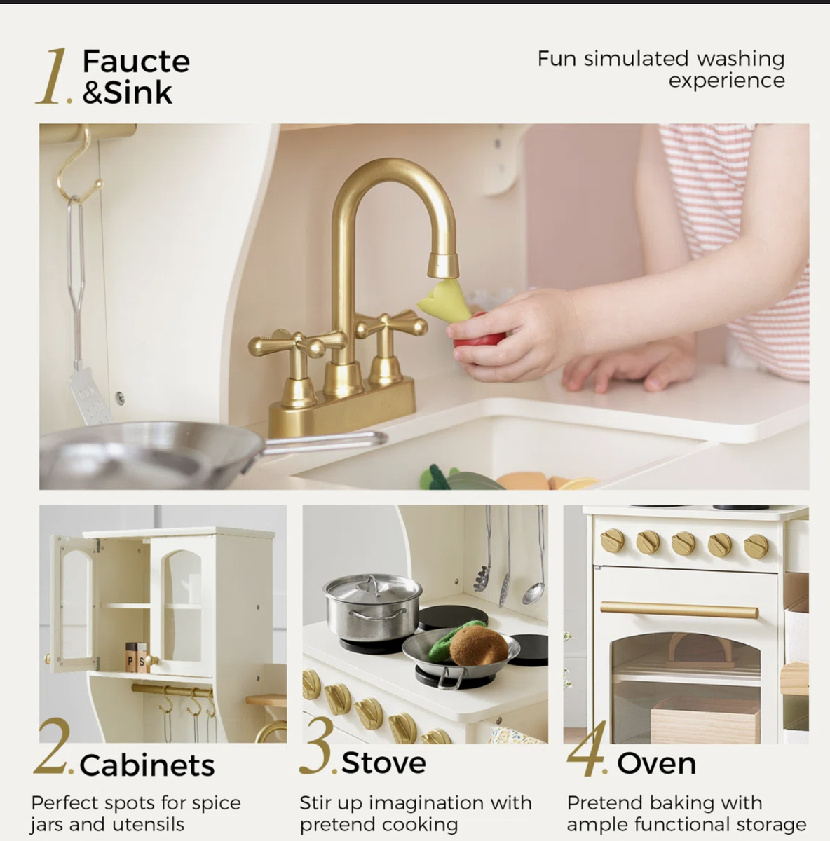 Accessories: a faucet, a covered stew pot, a frying pan, 4 stainless steel utensils, 4 storage bins, 5 label cards for the bins, and 4 hooks.
