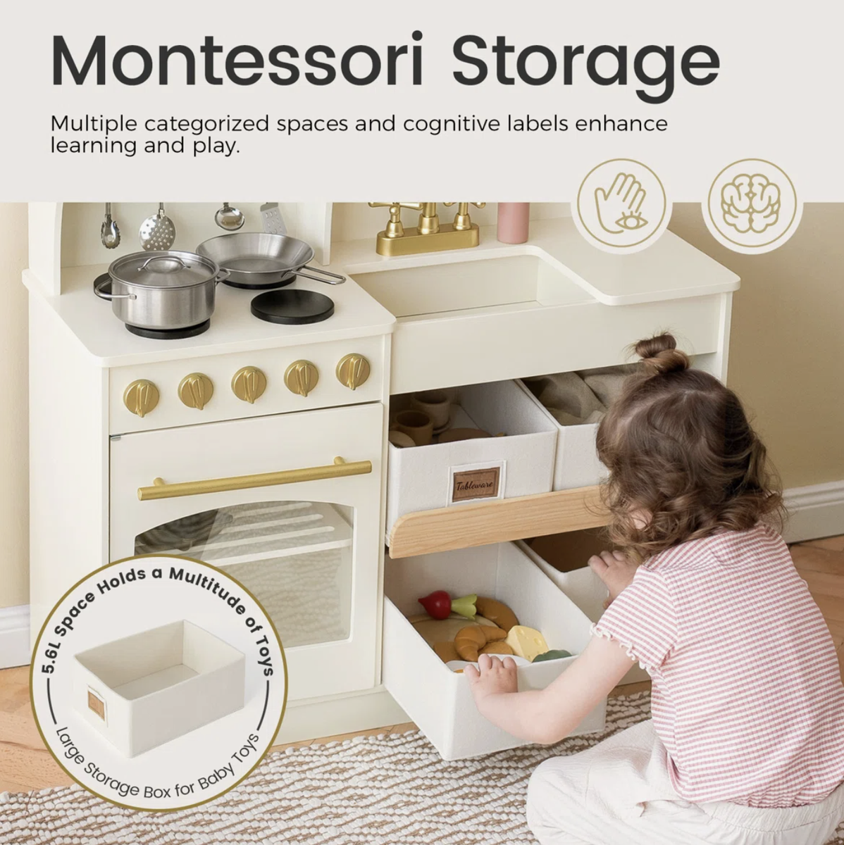 Teaches organization and motor skills as children categorize items into labeled bins while cooking up imaginative fun.