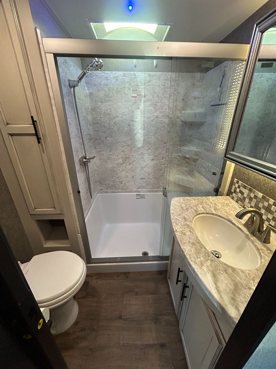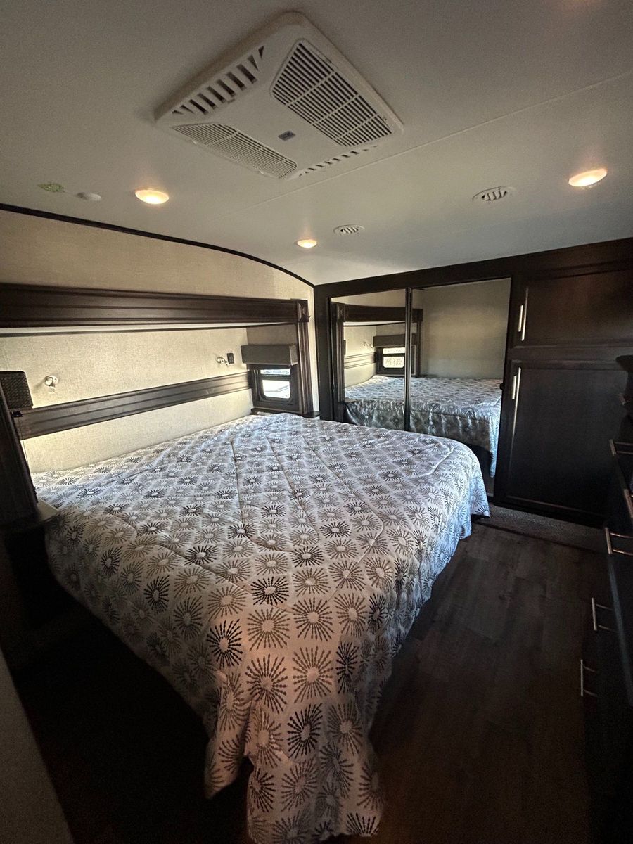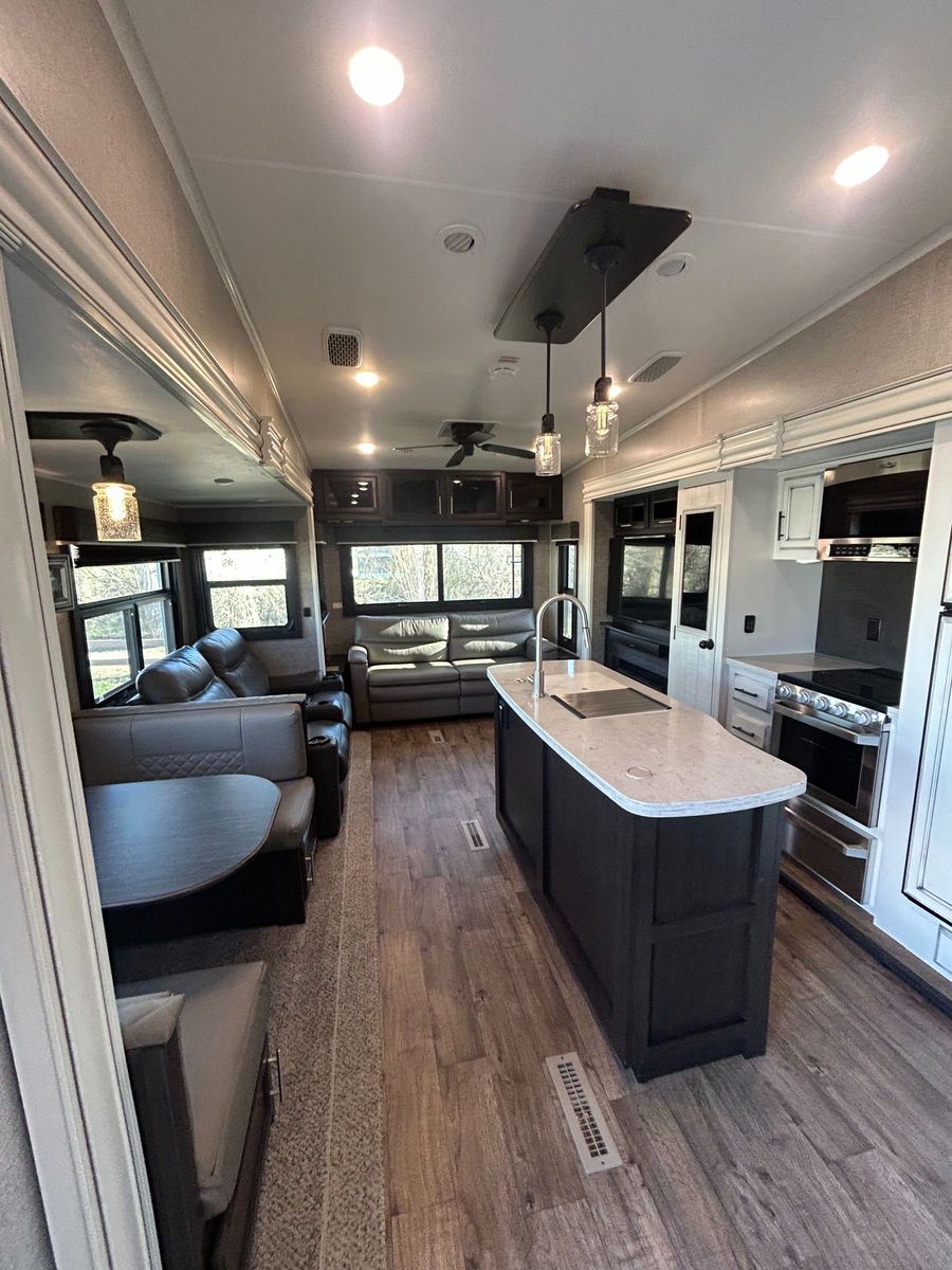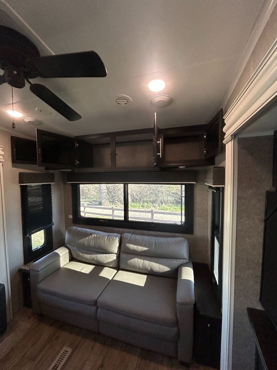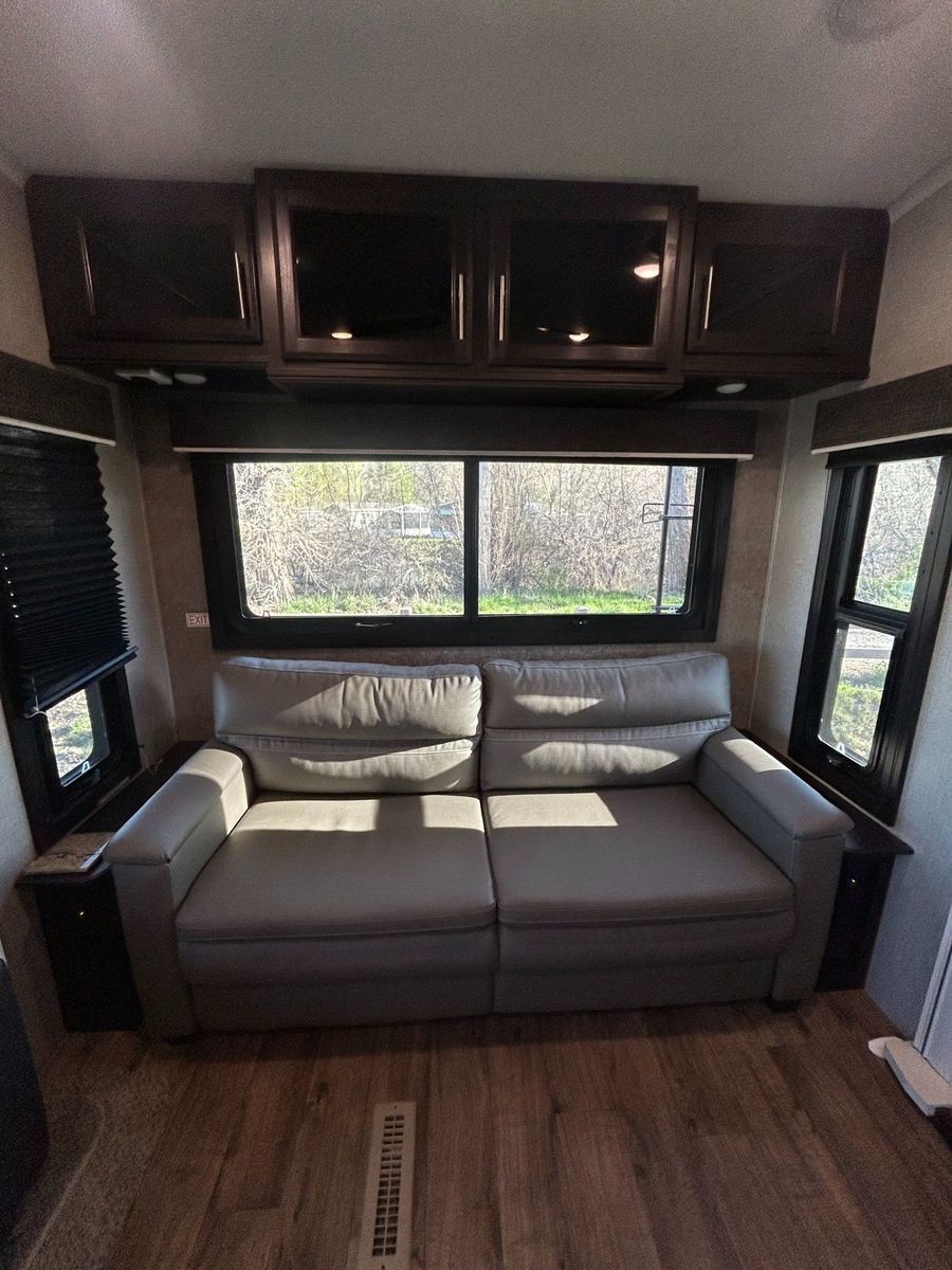 Fifth Wheel Experience true residential comfort on the road with this 2020 Jayco Eagle 321RSTS fifth wheel, a premium travel solution designed for extended stays, full-time RV living, and luxury camping experiences. The highly sought-after rear living (RSTS) floorplan with triple slide-outs creates a wide-open interior that feels more like a residential apartment than a traditional RV. The rear living area features theater seating, a tri-fold sofa, and an entertainment center with fireplace, making it the perfect space to relax after a day of travel or outdoor adventure. The kitchen is designed for real cooking, not just convenience. You will find solid surface countertops, a large refrigerator, microwave, oven, and plenty of cabinet space, along with a kitchen island that adds prep space and functionality. Whether you're hosting guests or cooking for extended stays, this layout delivers. Upstairs, the private master suite offers a walk-around King bed, large wardrobe, and washer/dryer prep, making this unit ideal for full-time RVers or long-term travelers. The spacious bathroom includes a large shower, vanity, and linen storage, providing comfort and convenience similar to a residential home. Jayco’s commitment to quality shows throughout with features like Goodyear tires, MORryde suspension components (on many builds), Climate Shield insulation package, and strong frame construction, giving you confidence whether you're parked long-term or traveling across the country.