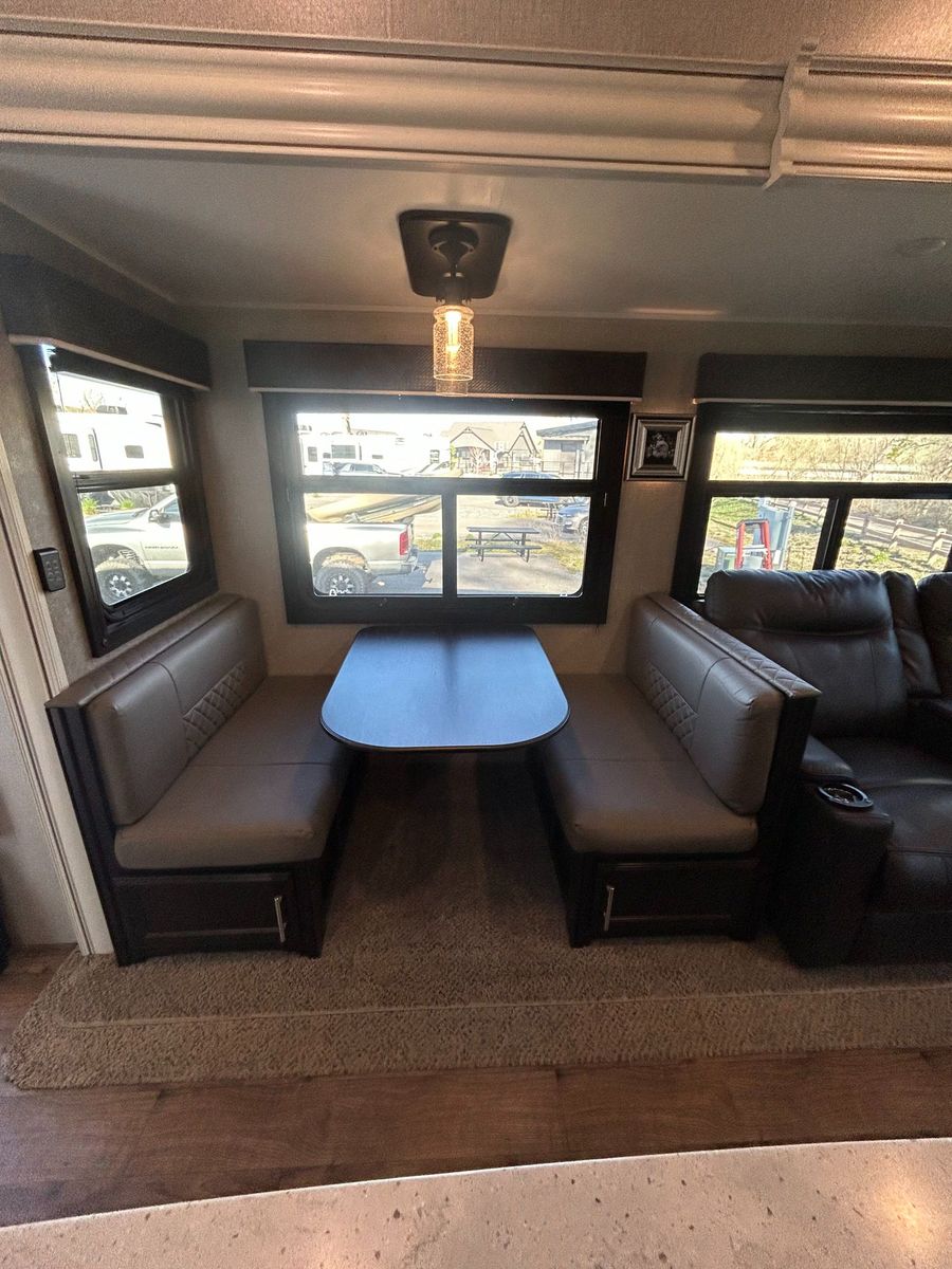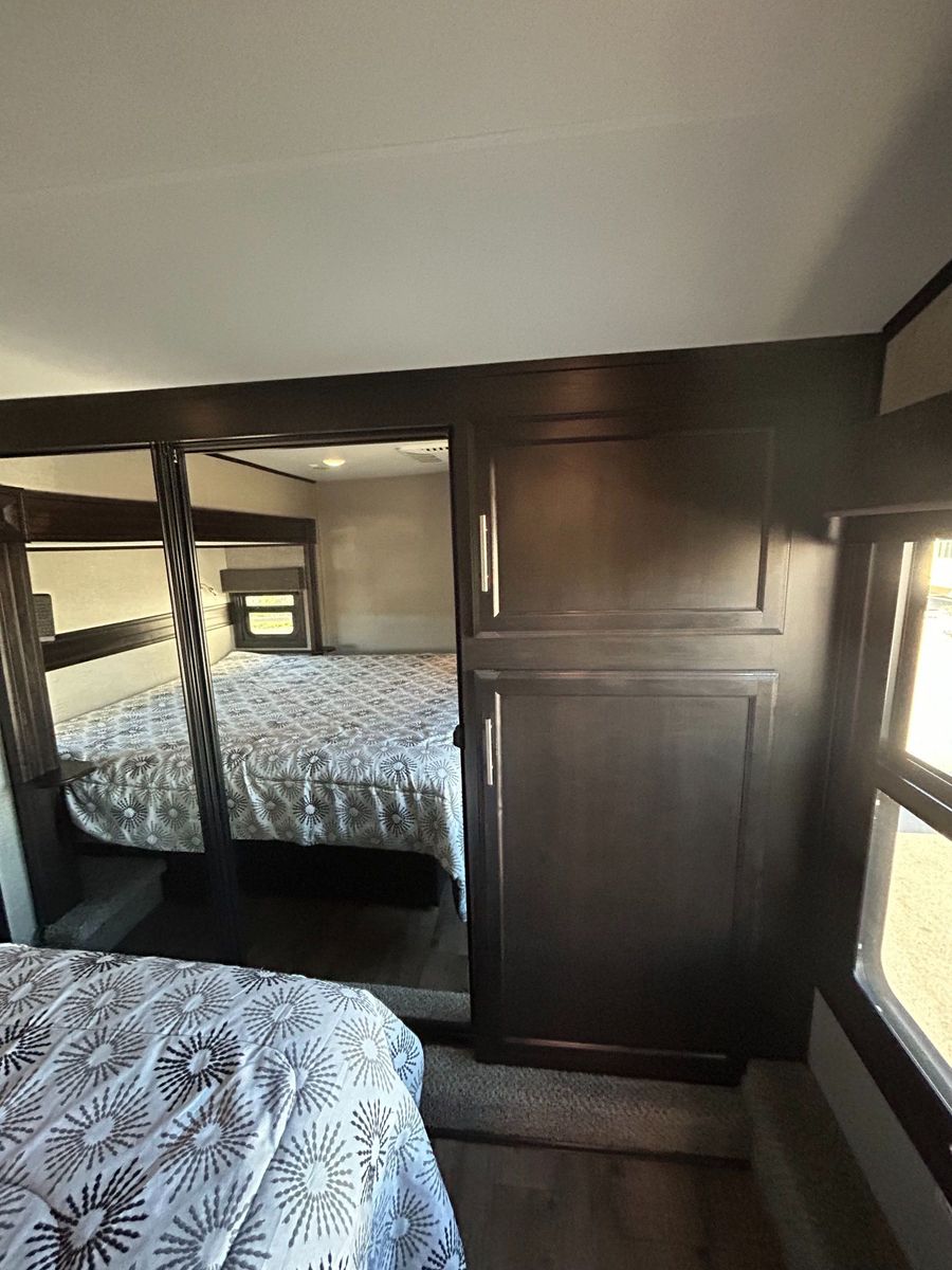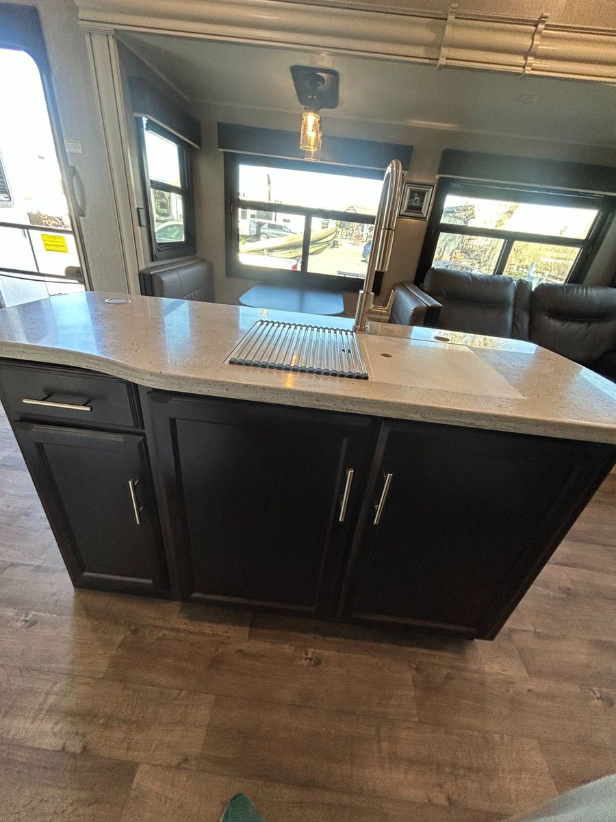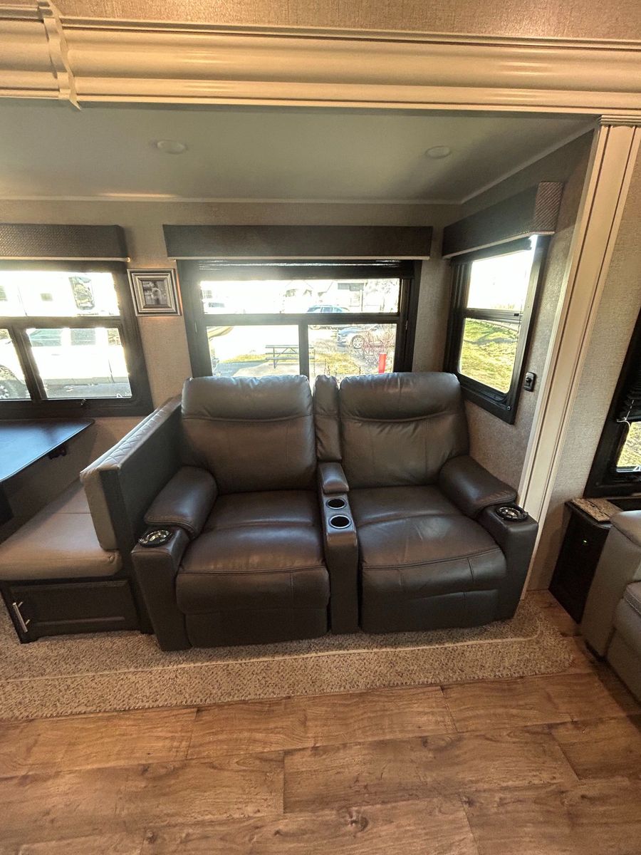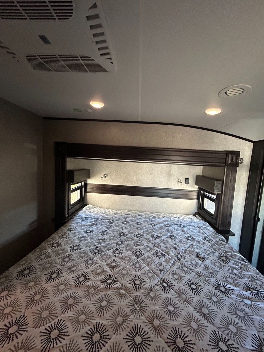 Fifth Wheel Experience true residential comfort on the road with this 2020 Jayco Eagle 321RSTS fifth wheel, a premium travel solution designed for extended stays, full-time RV living, and luxury camping experiences. The highly sought-after rear living (RSTS) floorplan with triple slide-outs creates a wide-open interior that feels more like a residential apartment than a traditional RV. The rear living area features theater seating, a tri-fold sofa, and an entertainment center with fireplace, making it the perfect space to relax after a day of travel or outdoor adventure. The kitchen is designed for real cooking, not just convenience. You will find solid surface countertops, a large refrigerator, microwave, oven, and plenty of cabinet space, along with a kitchen island that adds prep space and functionality. Whether you're hosting guests or cooking for extended stays, this layout delivers. Upstairs, the private master suite offers a walk-around King bed, large wardrobe, and washer/dryer prep, making this unit ideal for full-time RVers or long-term travelers. The spacious bathroom includes a large shower, vanity, and linen storage, providing comfort and convenience similar to a residential home. Jayco’s commitment to quality shows throughout with features like Goodyear tires, MORryde suspension components (on many builds), Climate Shield insulation package, and strong frame construction, giving you confidence whether you're parked long-term or traveling across the country.