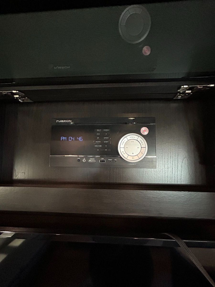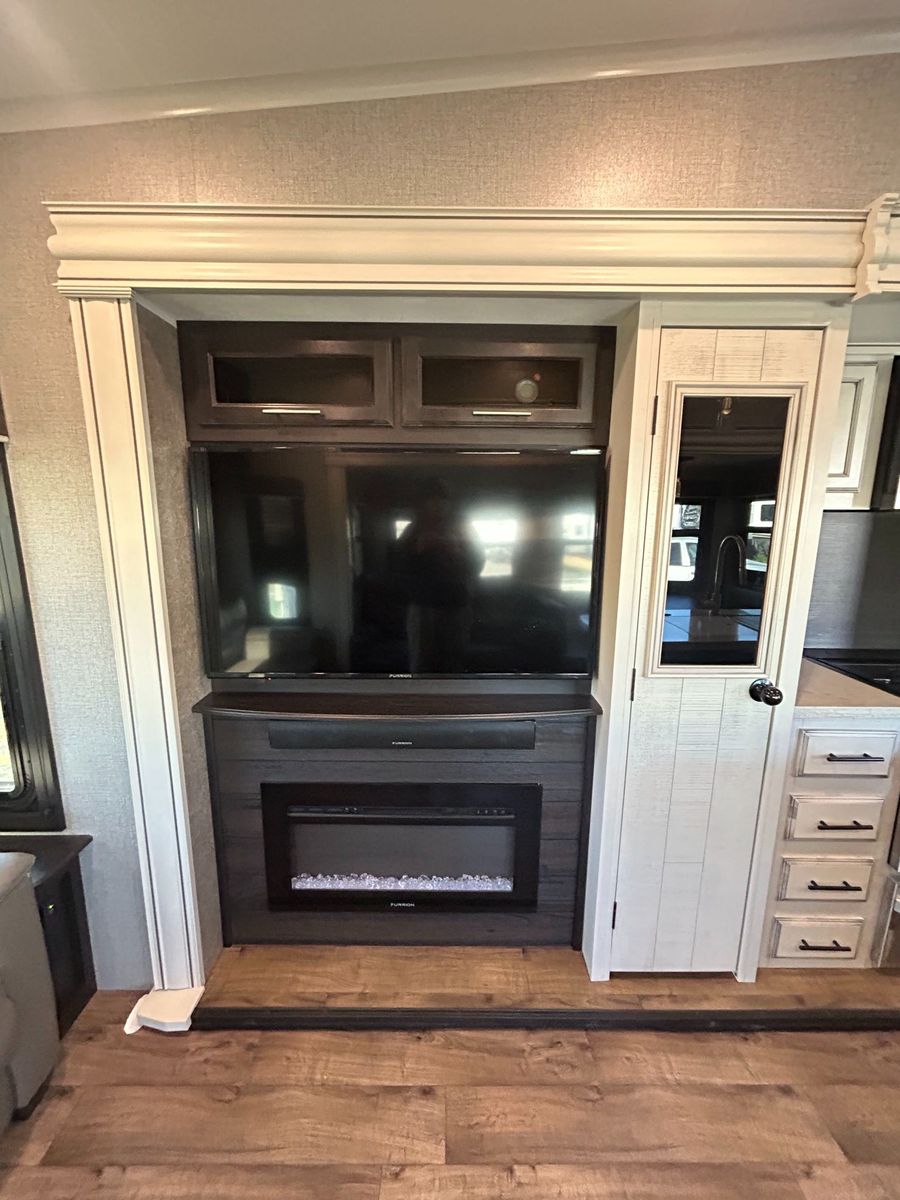 Rear Living Area: Opposing slides open up the living room, featuring theater seating, a tri-fold sofa, an entertainment center with a large TV, and a cozy fireplace. This area is designed for relaxing evenings or entertaining friends.