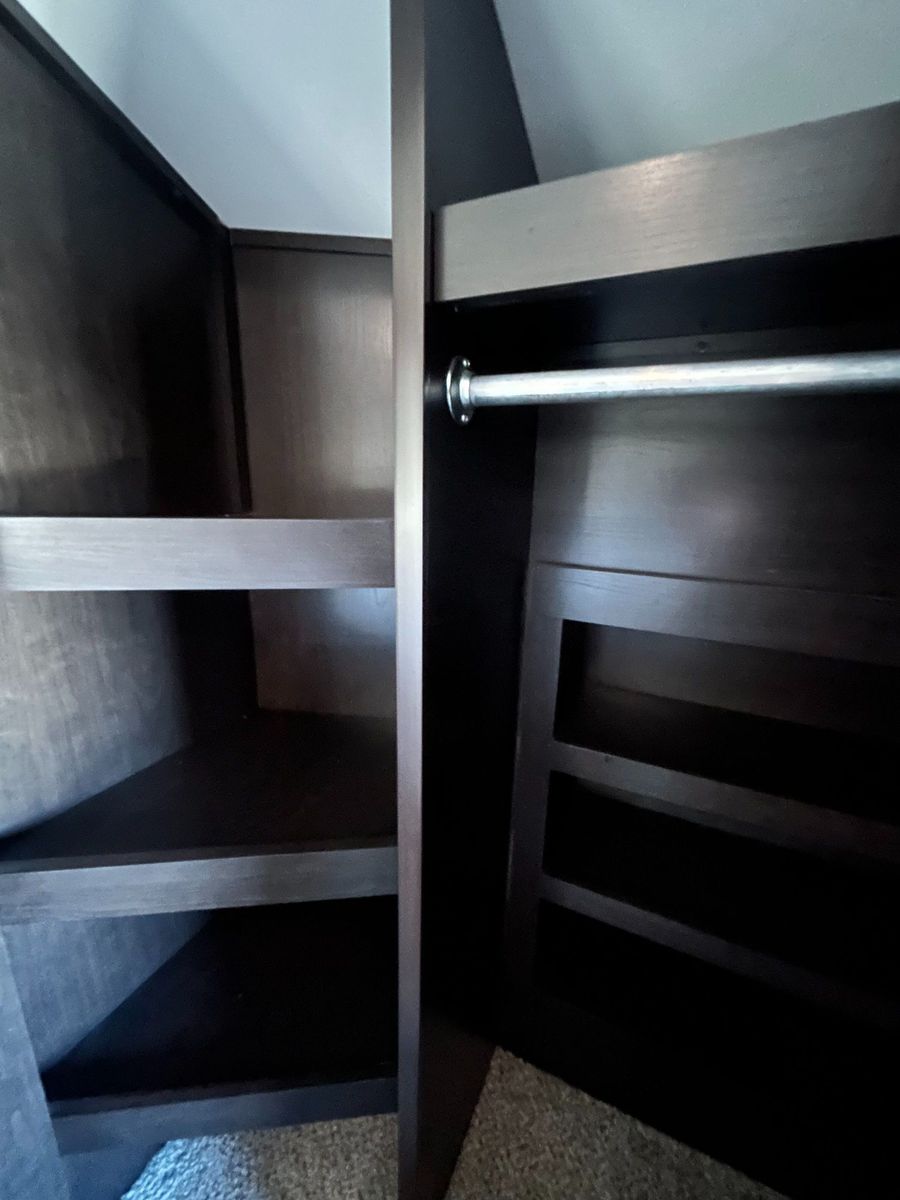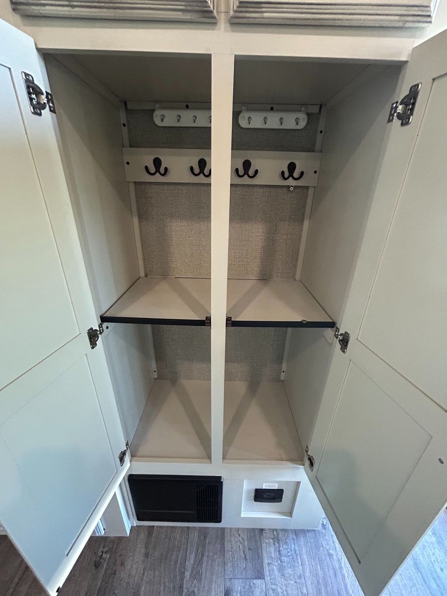 Master Suite: Up front, the private bedroom features a king bed, large wardrobe, and washer/dryer prep.