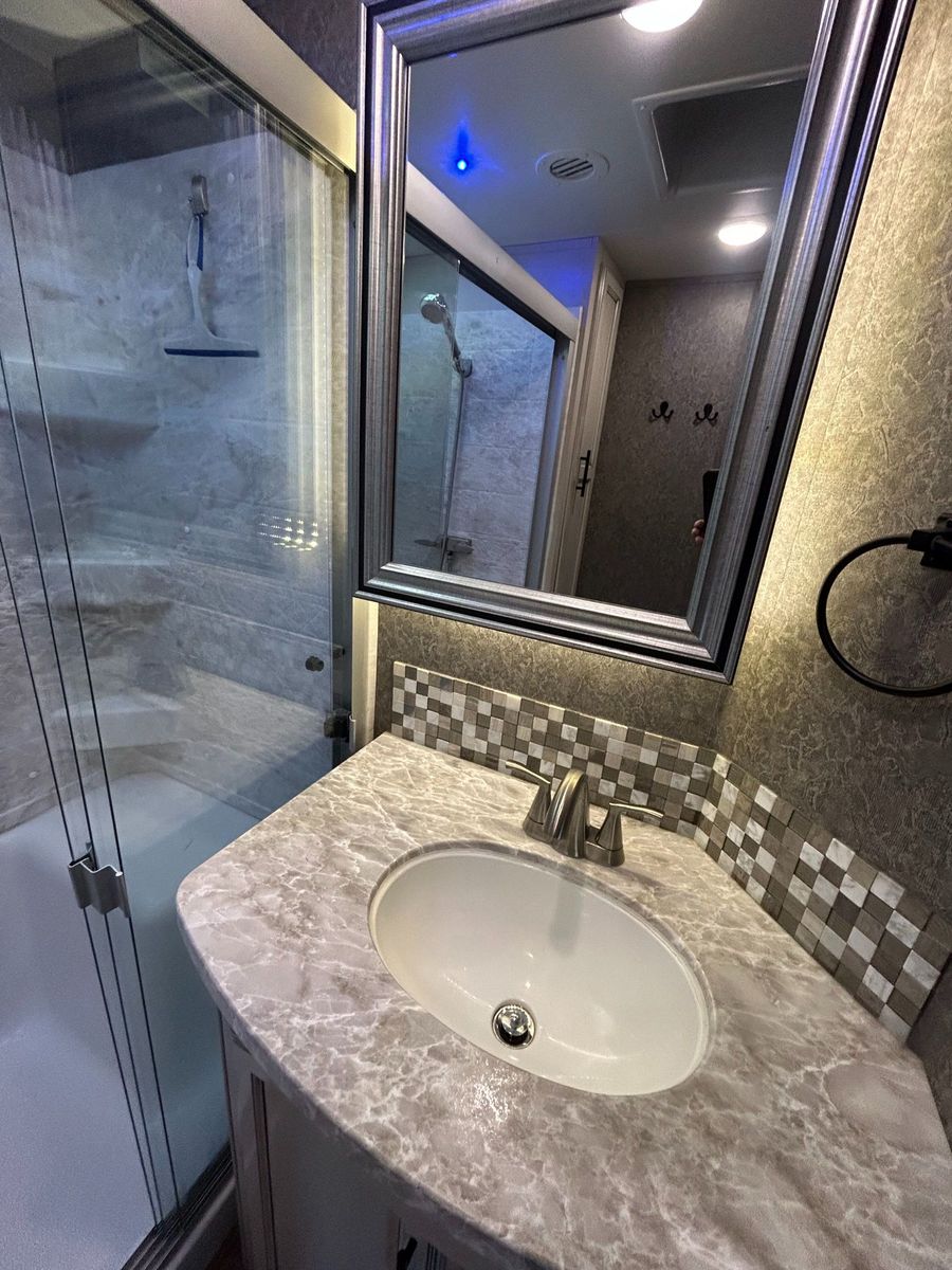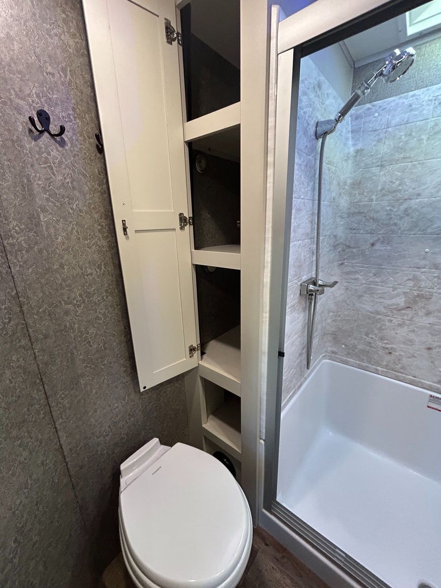 Bathroom: Mid-coach, the bathroom includes a walk-in shower with a glass door, vanity with sink, medicine cabinet, and a porcelain toilet—giving you all the comforts of home.