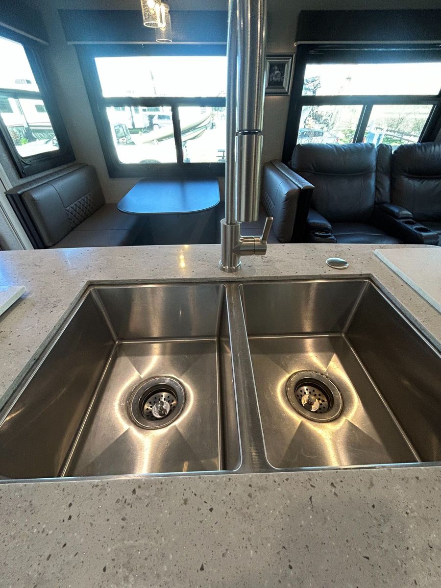 Kitchen: At the center of the coach, the island kitchen offers solid-surface counters, stove/oven, a microwave, and a Dometic RM1350 4-door gas/electric refrigerator. The free-standing dinette with benches provides a comfortable dining space.