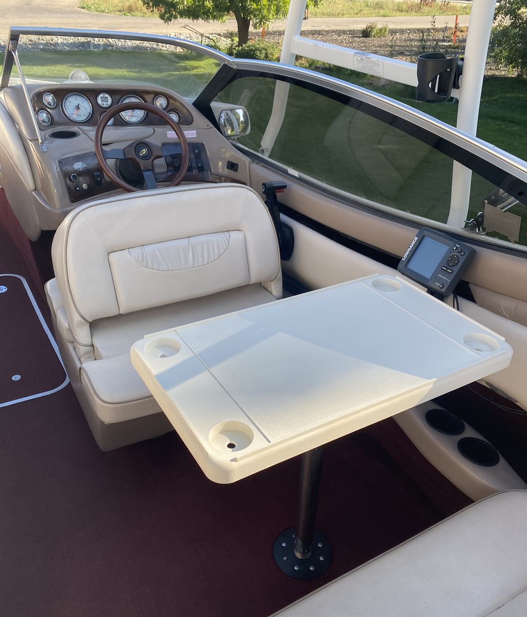 Has an amazing floor layout with great use of space and storage that includes a removable table, plenty of drink holders, and an integrated drink cooler that drains from the side of the boat.
