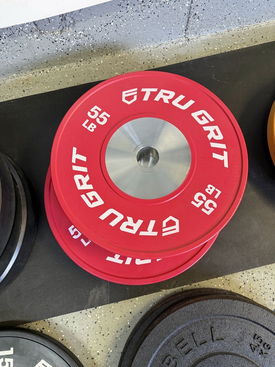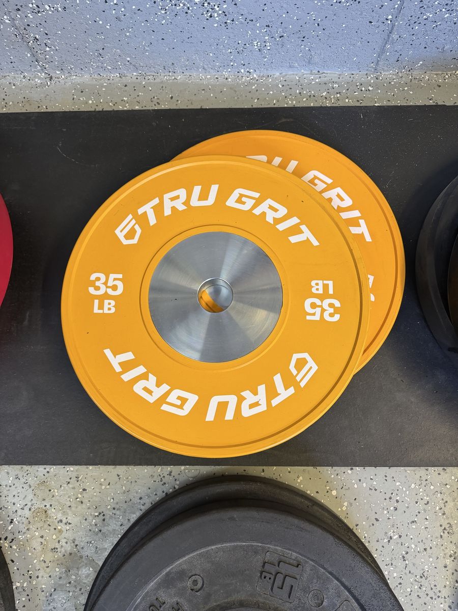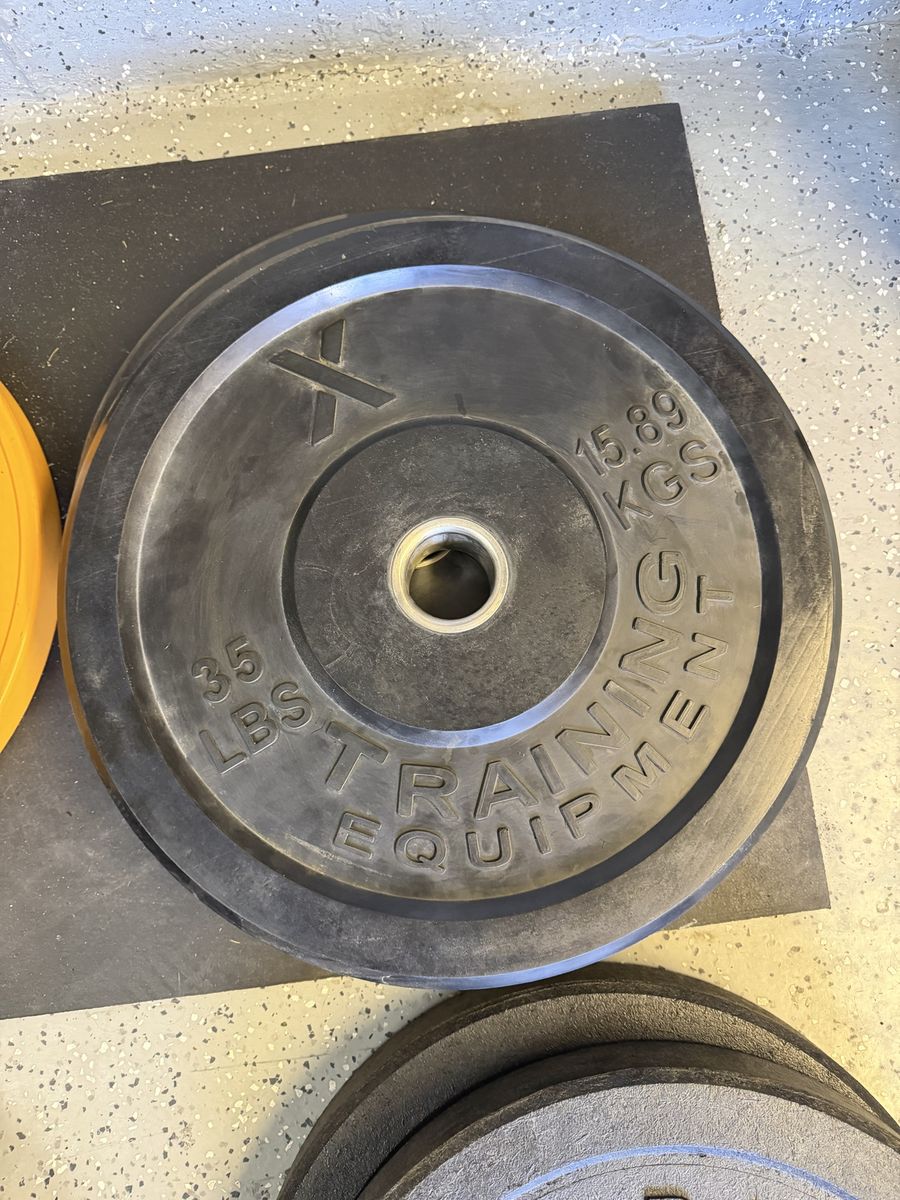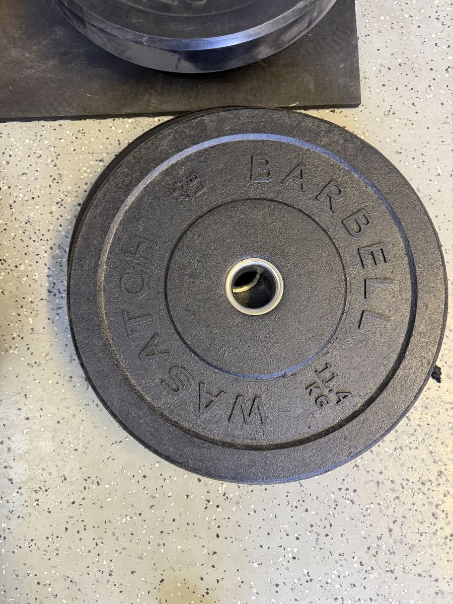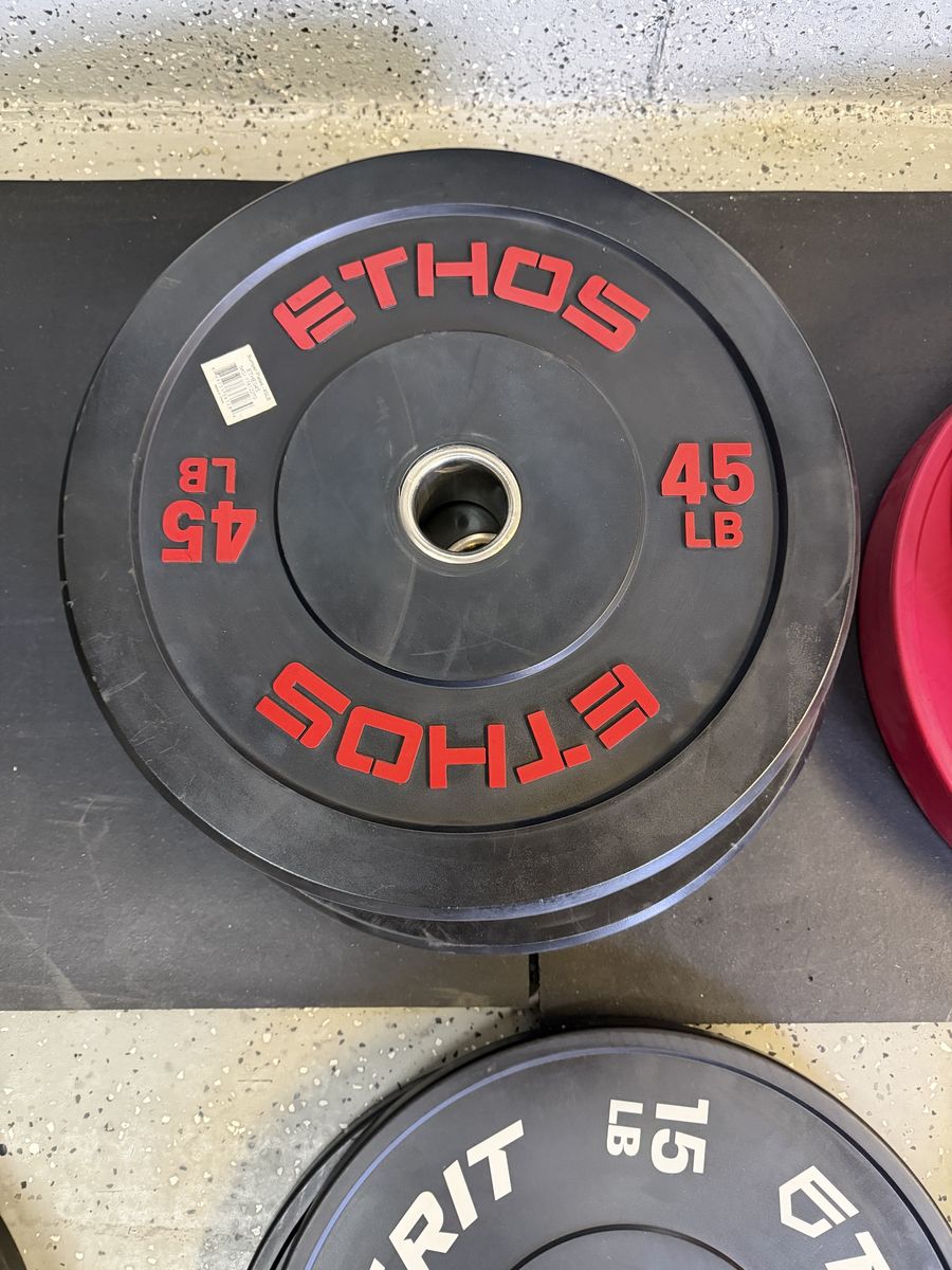 55# tru grit plates 45# ethos plates 35# tru grit plates 35# X training equipment plates 25# wasatch barbell plates 15# Rogue high temp plates 15# USA plates 10# Rogue high temp plates 10# wasatch barbell plates 10# ethos plates 5# standard plates 2.5# fitness gear plates