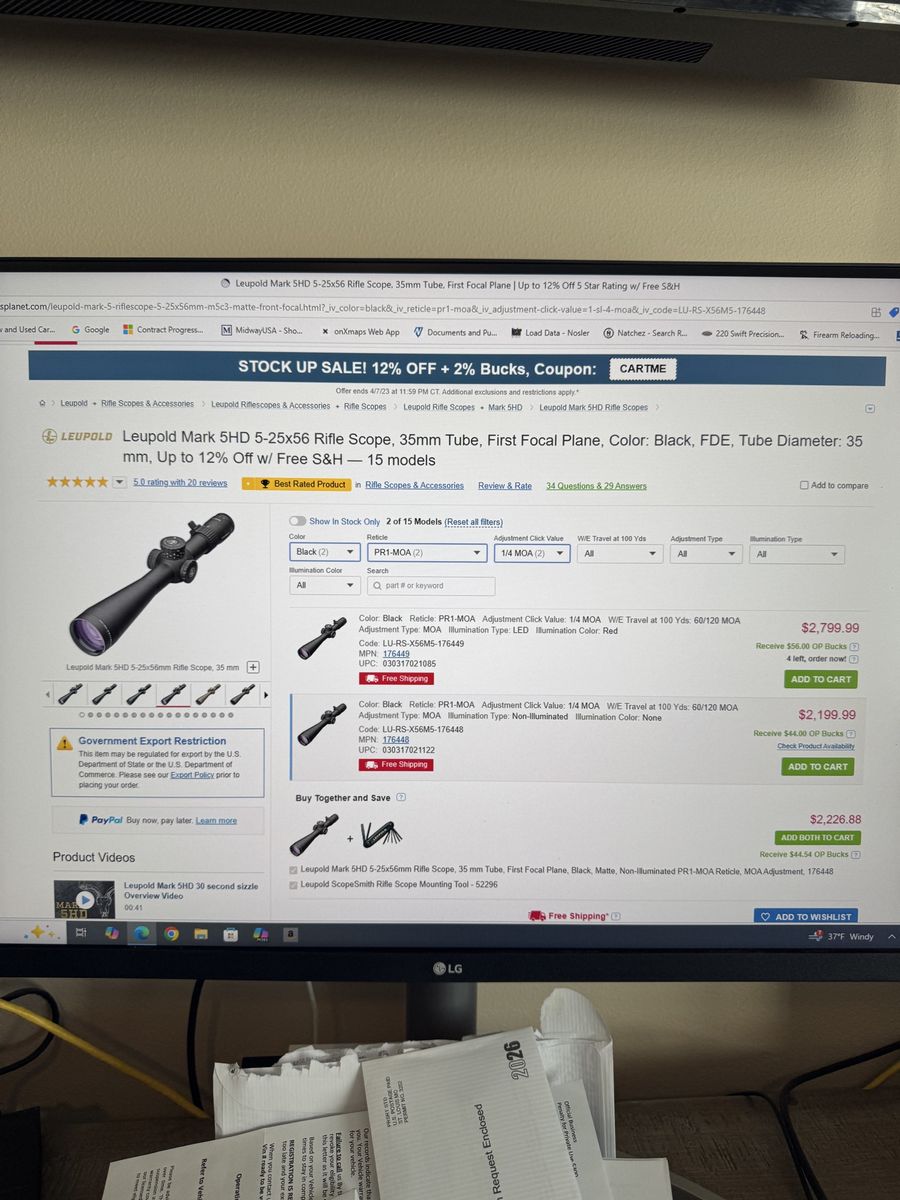 VenmoI have a Leupold Mark 5HD 5-25x56mm. Scope was mounted on a rifle and sighted in but never took it hunting. Scope is essentially brand new. This is a First Focal Plane scope in MOA. Amazing scope - phenomenal clarity! Paid $2000 plus tax. They sell for $2200 now at Scheels, Midway & Optics Planet.