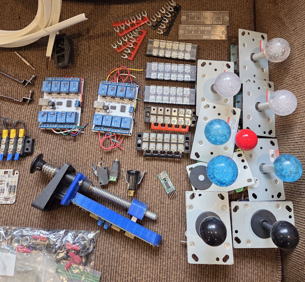 VenmoMassive lot of DIY arcade and Virtual Pinball (VPin) building components. I am selling this as a complete bundle. Perfect for someone building a MAME arcade cabinet, a custom fight stick, or a Virtual Pinball machine. Included in the lot: 8x Ball-top arcade joysticks with metal mounting plates (Clear, Blue, Red, Black). 40+ standard arcade push buttons (Red, Blue, Yellow/Green) with microswitches and nuts. 2x 8-Channel USB Relay boards (great for VPin force feedback/toys). 1x Custom 3D-printed analog Virtual Pinball plunger assembly with slide potentiometer. Assorted terminal blocks (barrier strips) with jumper forks. 1x Roll of white cabinet T-molding. Miscellaneous wiring harnesses, daisy chains, power sockets, and mounting hardware (screws, crimp spades, etc.). Everything is in great condition and ready for your next custom build. Selling as a complete lot only, not looking to separate out individual pieces right now. Local pickup in Herriman. Cash or Venmo preferred. Send me a message if you're interested!