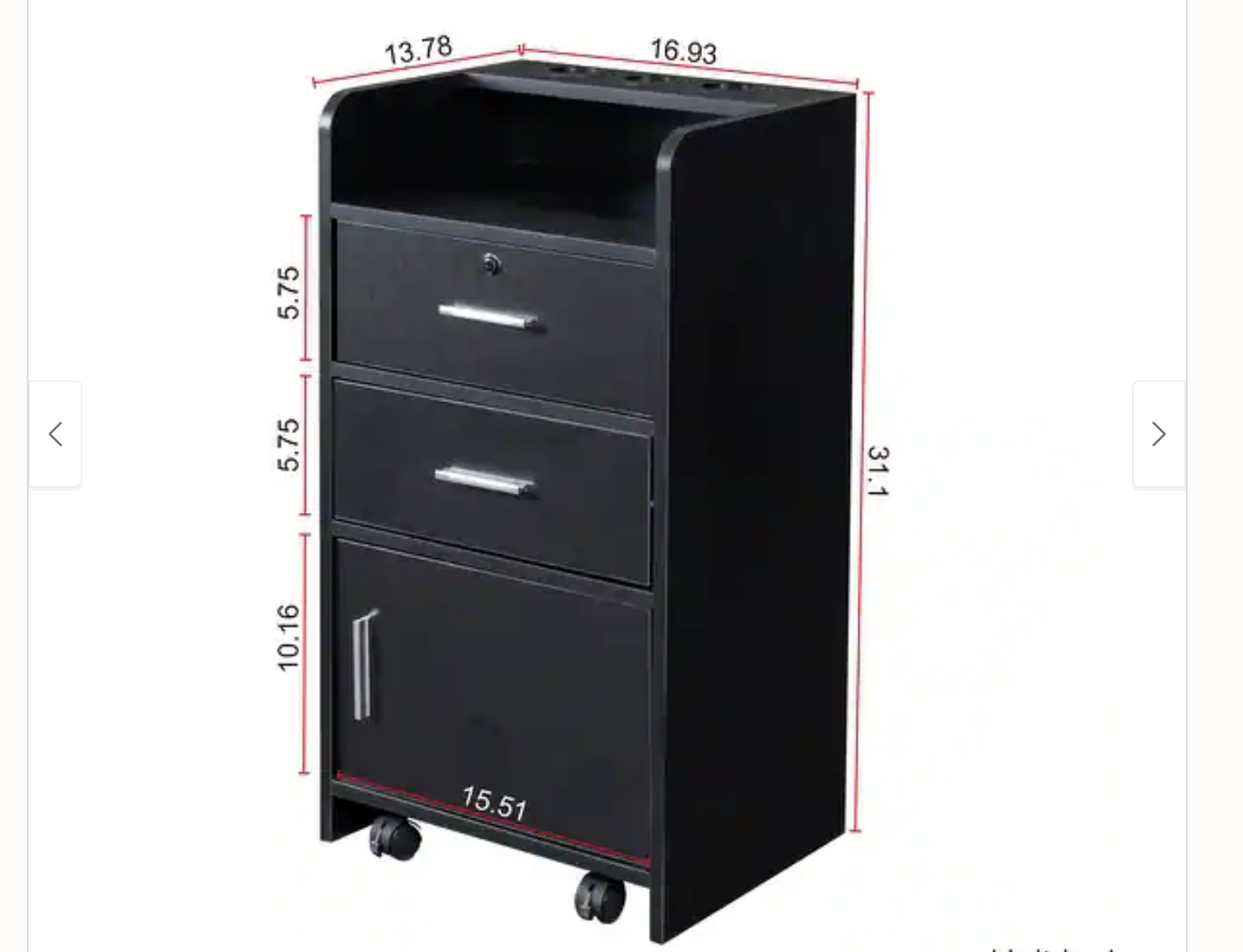 this commercial-grade beauty cabinet with 2 drawers, 1 cabinetProduct size: W16.93D13.78H31.10 Net weight: 39.68lbs Two enclosed drawers and a cabinet add storage space for various items and eliminate clutter from the desk Cabinet top with 3 round holes for hair dryer and other items Overall simple atmosphere, can be placed in the bedroom, toilet and other places, can also be used as a barber shop 2 Drawers 1 cabinet: Our salon beauty station has 2 smooth drawers and 1 spacious cabinet. the spacious cabinet is designed for storing large items With a modern minimalist silhouette, this commercial-grade beauty cabinet with 2 drawers, 1 cabinet, are an excellent storage solution for your salon, barber, beauty shop, spa, cosmetic studio, and home with little space occupation The particleboard (melamine-faced board) surface is veneered in a slick uniform color. The veneer decorative board increases the brightness of the surface, protects the surface from wear, and is easy to clean Material:Material is 15mm particle bpard,back board is 3mm MDF.Made of wooden structure with melamine finish for durability and easy maintenance.