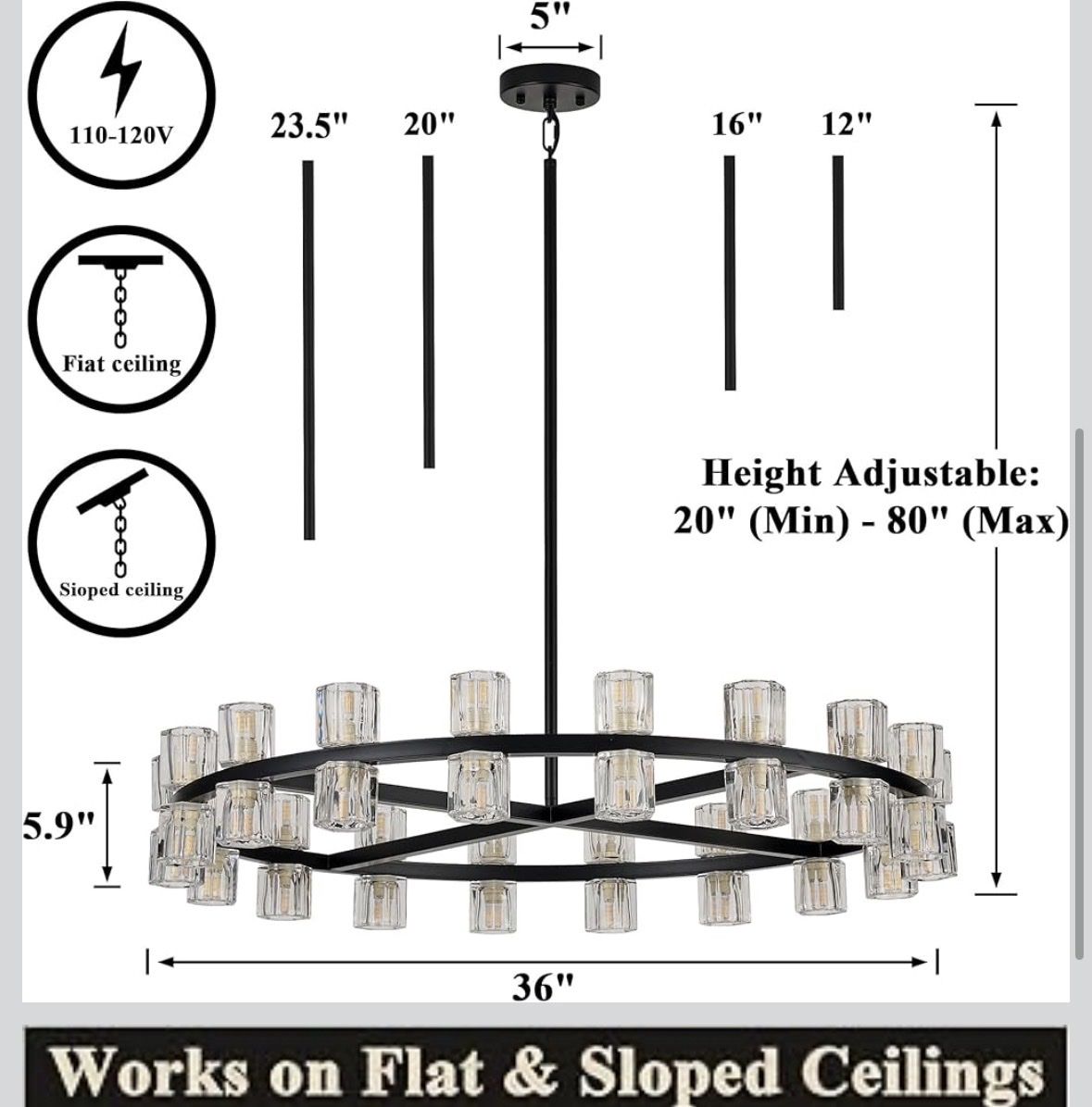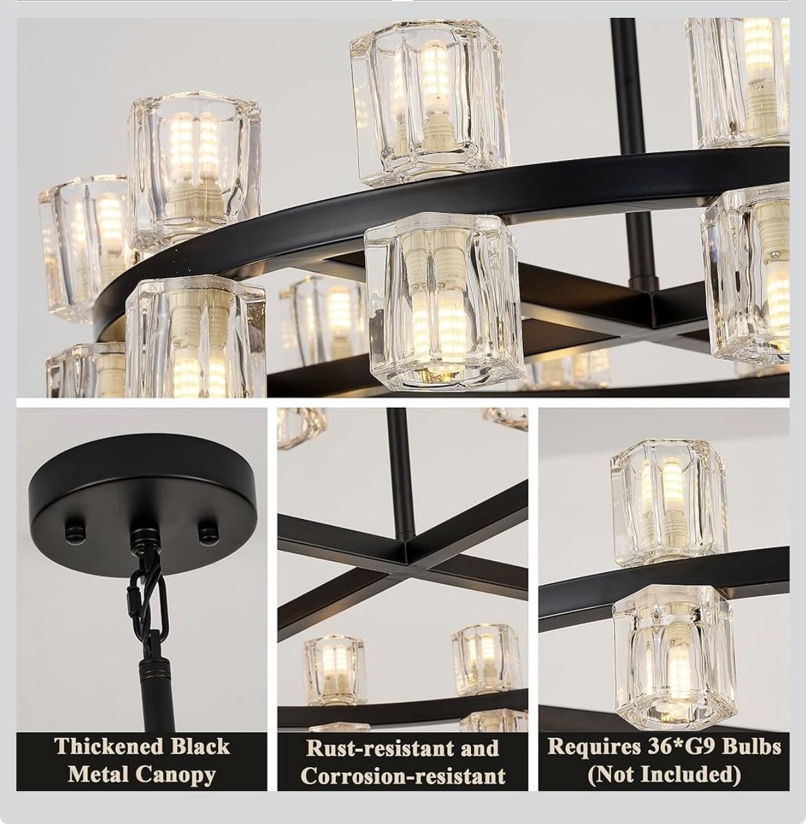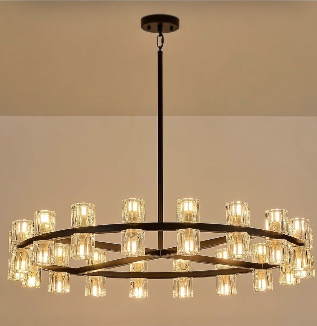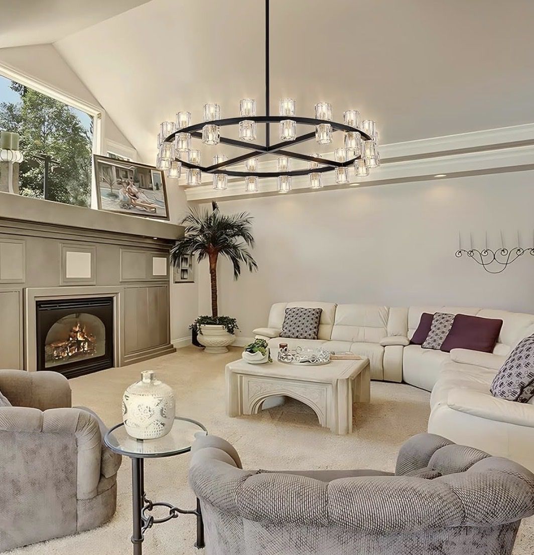 36-Light Black Farmhouse Wagon Wheel Chandelier – 36 Inch Rustic Round Lighting Fixture with Crystal Shades, Large Dining Room Chandelier for Kitchen, Foyer & Living Room