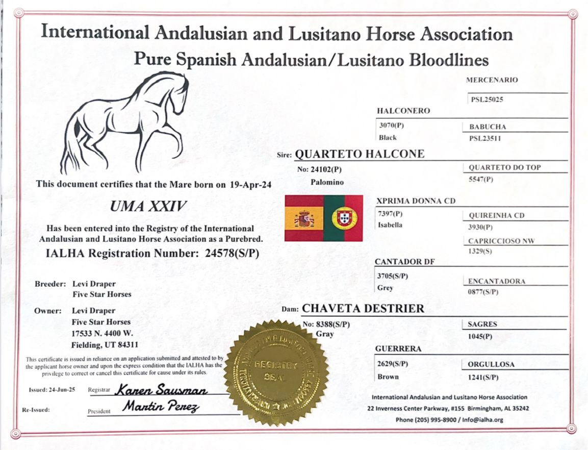 ZelleUma is an incredible prospect for any discipline, her pedigree features the record breaking International Dressage Champion Quarteto do Top. And one of the most athletic diverse Lusitano's in North America, Halconero, who excelled in bull fighting, jumping, and dressage. With that athletic pedigree, size, color, temperament, and disposition, she is set up to become the ideal prospect for any enthusiast that enjoys these Iberian horses. She is halter broke, easy to catch, she comes to you in a pasture and really enjoys human interaction. Estimated to be 15.2-16.2 HH tall. She is IAHLA registered.