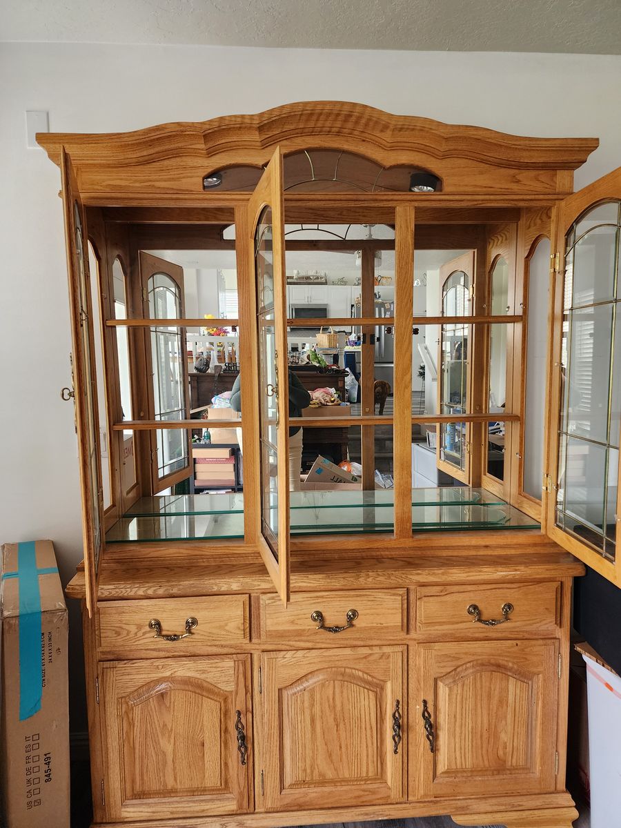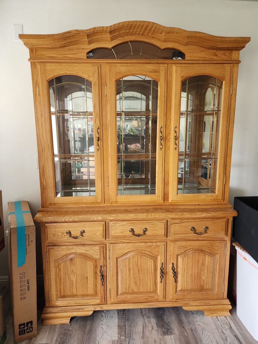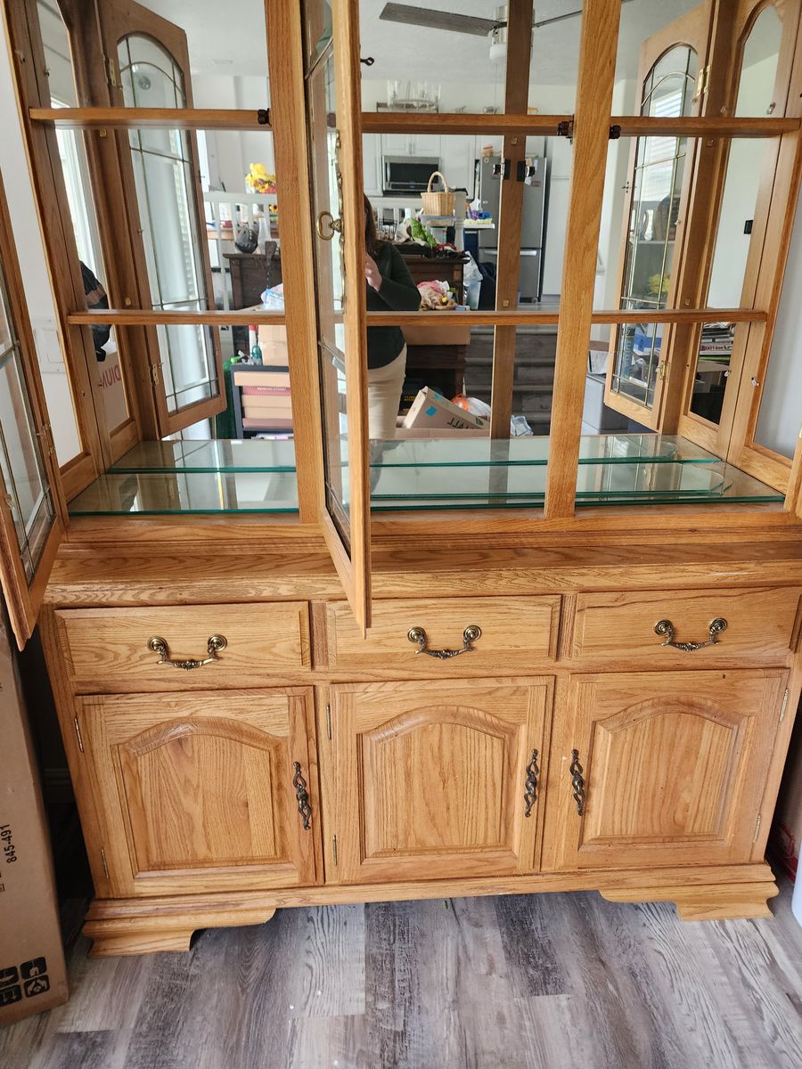 They are both in very good condition. All glass pieces in the hutch are intact.