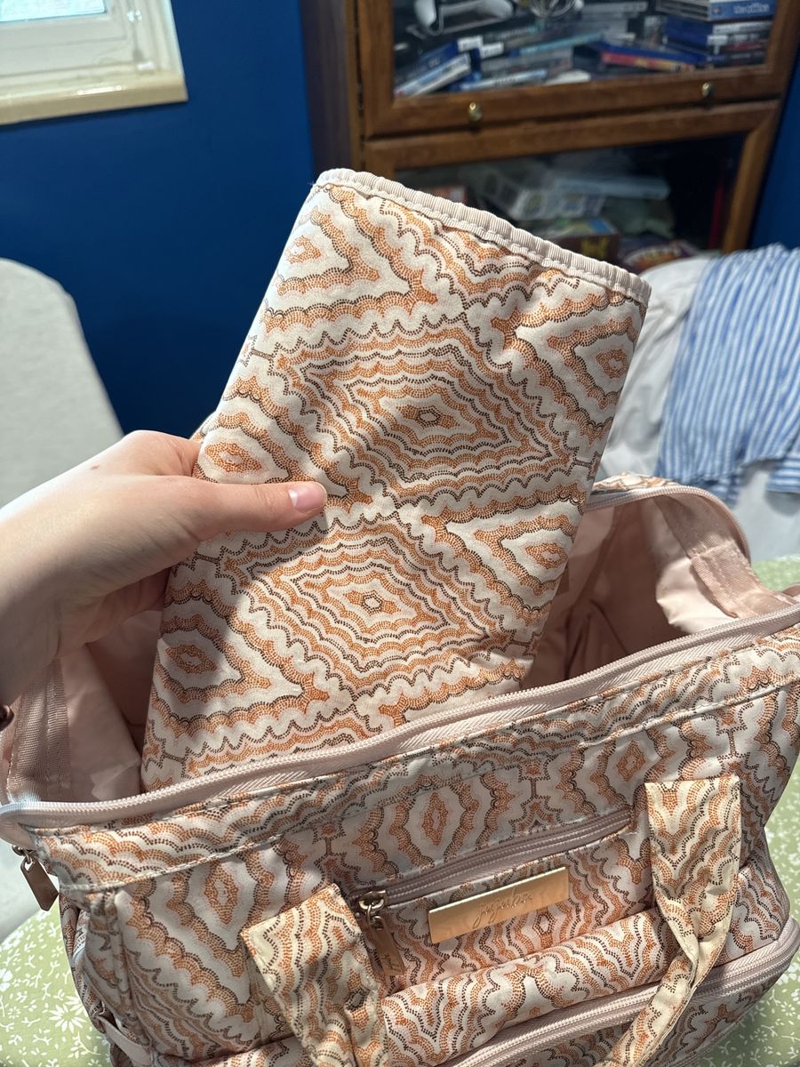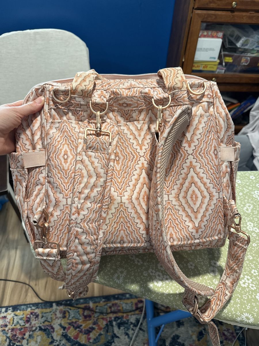 VenmoSuch a cute color! Would probably go well in the washing machine on delicate. Shows some small signs of wear. Had backpack straps or one long sling strap. LOTS of pockets and lots of space!!