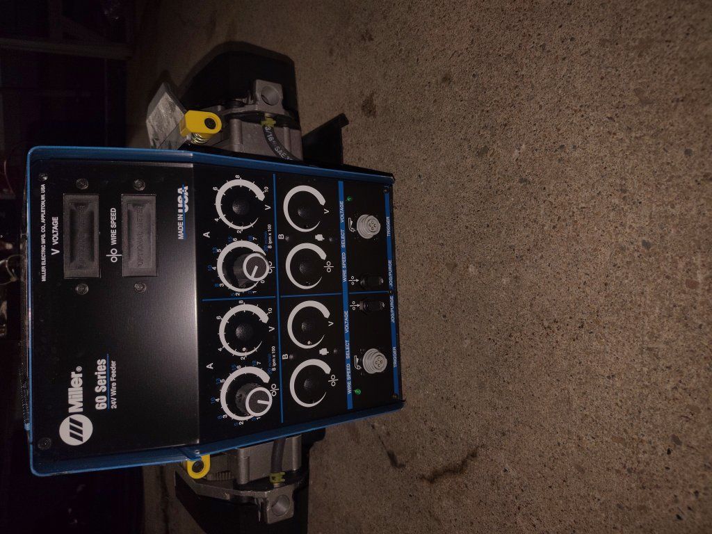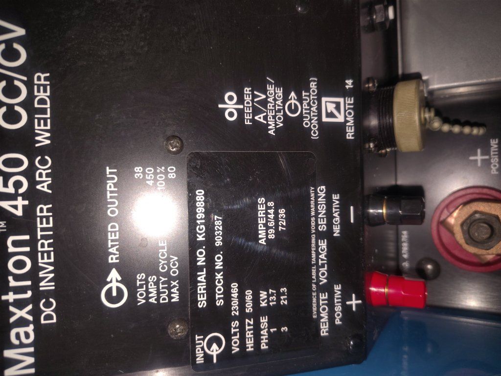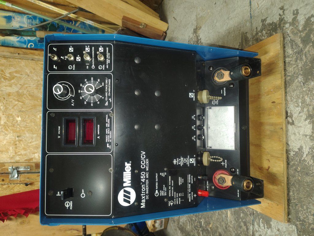 Miller Maxtron 450 CC/CV DC Inverter rated at 450 ampers and 38 volts at 100% duty cycle constant current CC and constant voltage CV for Mig, and Flux- Cored,Stick,and Tig Welding 14 pin and 17 pin remote control receptacle Miller D64 wirefeeder Miller electric foot pedal 2 Tweco Mig Guns 160 to 600 amps