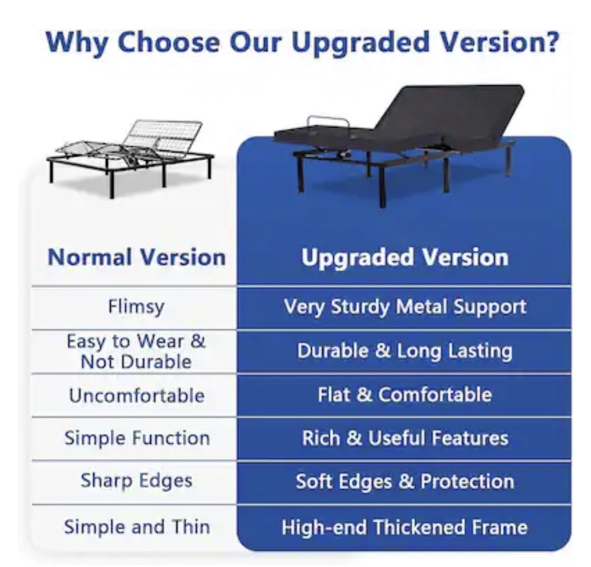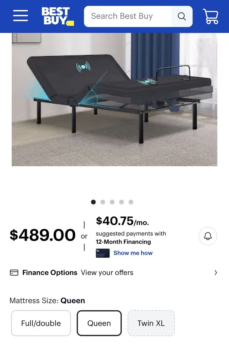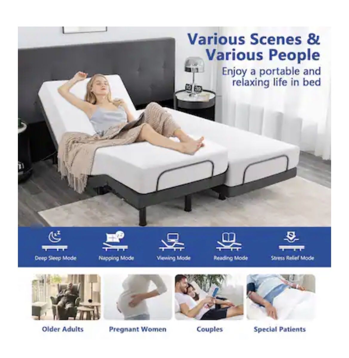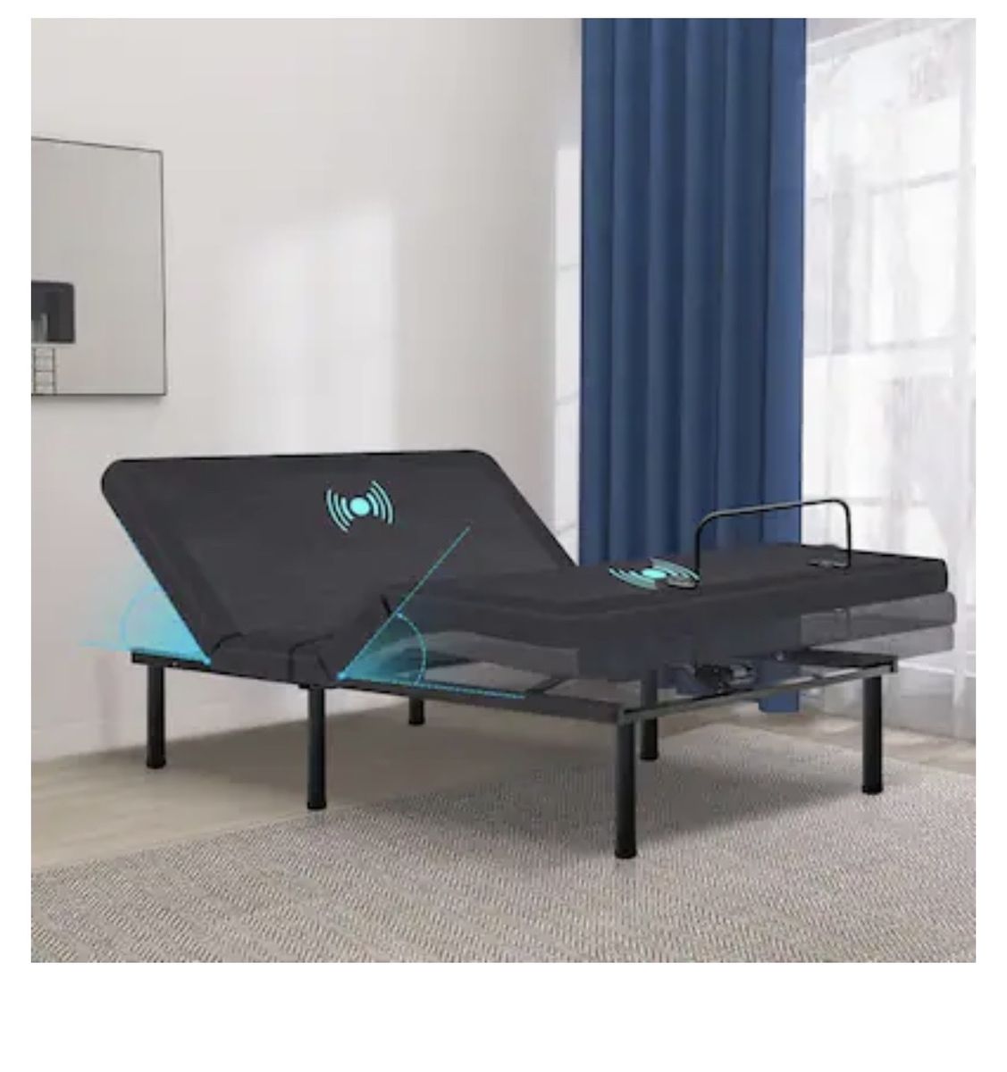 Comfortable adjustable bed frame. Has independent head and foot incline for reading, napping, or just chilling. Comes with a voice remote for easy control. Super sturdy metal support and a mattress guard so your mattress stays put. Zero clearance design means you can use it without legs too. Great for anyone wanting a comfy setup.