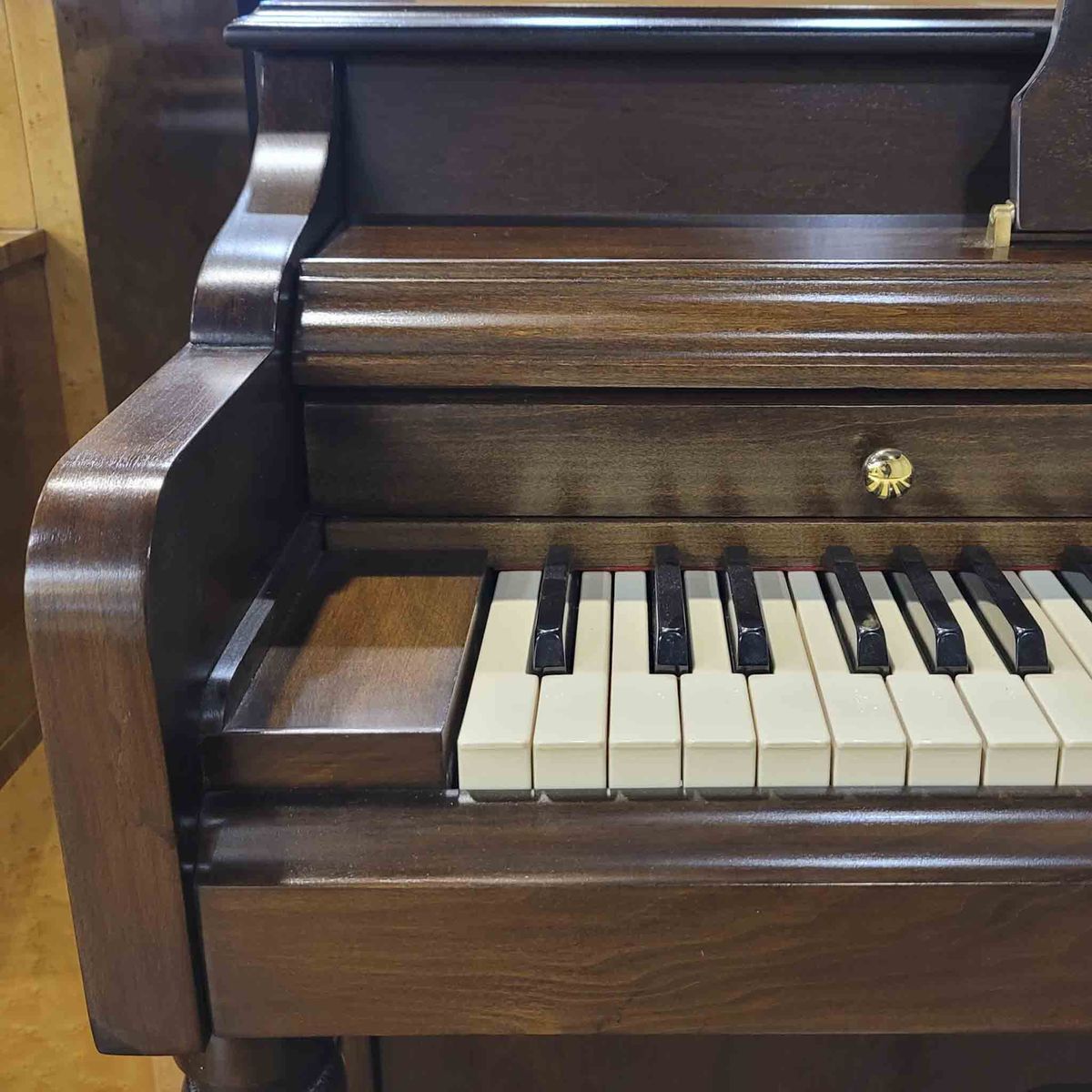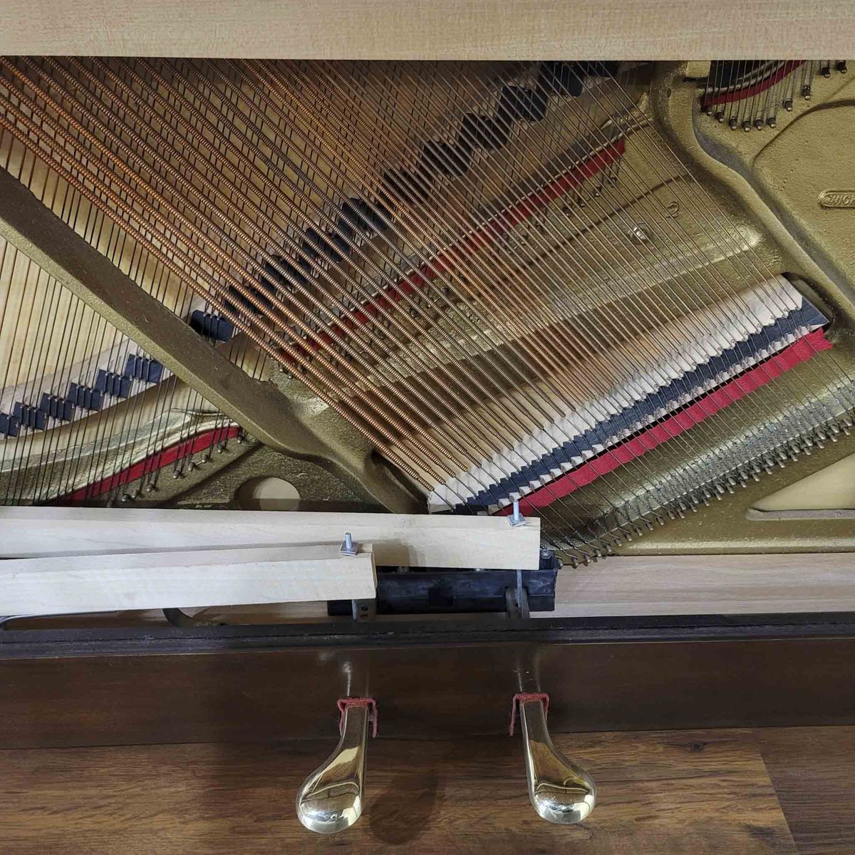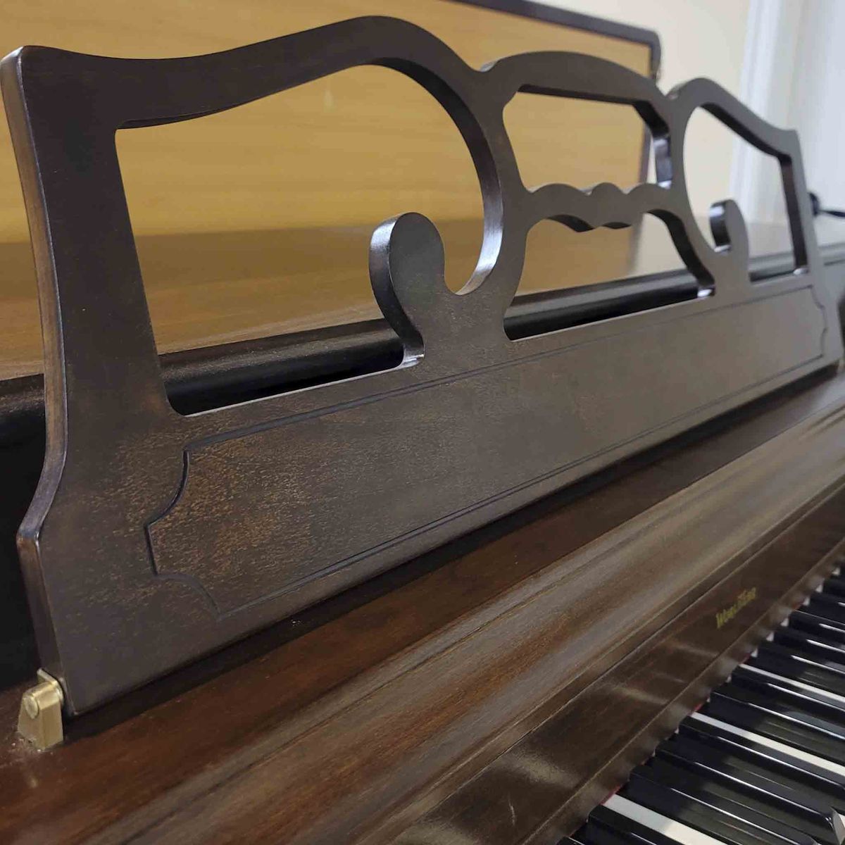 Mechanically, the piano has been thoroughly refurbished. We performed a deep internal cleaning, tightened and aligned the entire action, lubricated moving parts, reshaped the hammers, completed a full action regulation, voiced the tone, and performed a pitch raise followed by fine tuning to A-440. The result is a compact instrument that plays consistently and feels responsive. This piano is now in excellent playing condition and ready for everyday use.