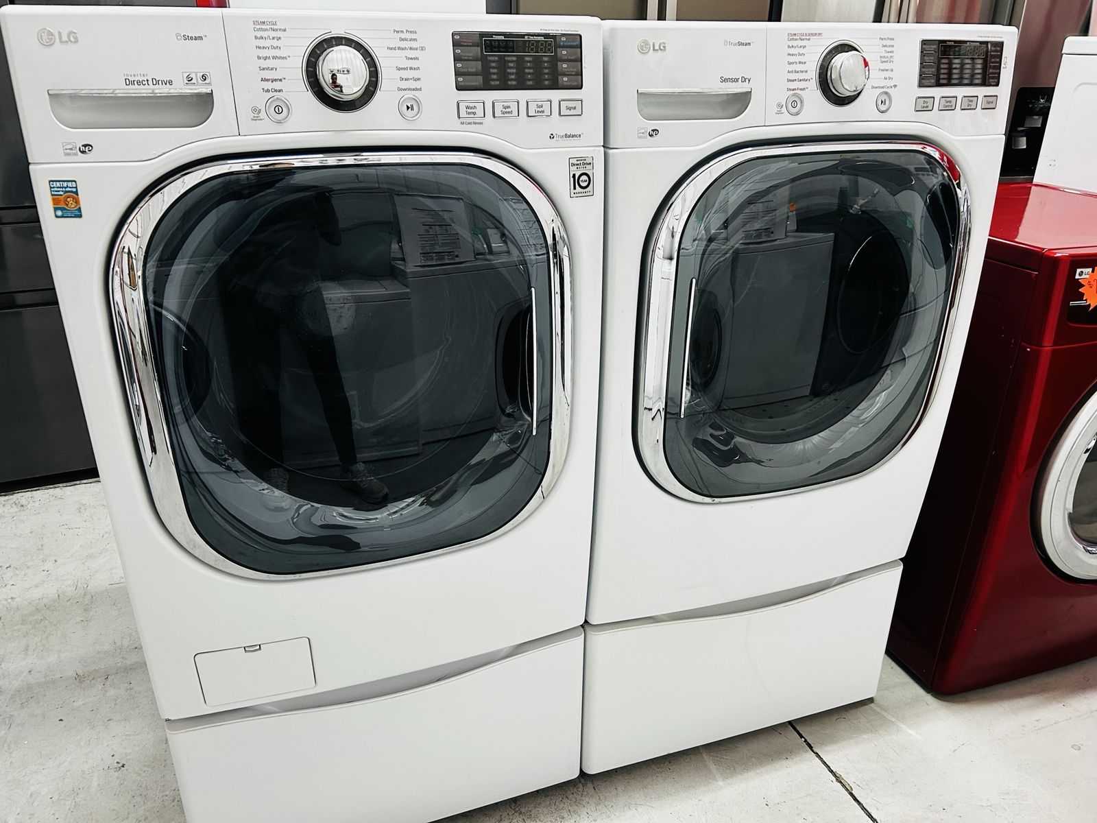 Lg Steam washer inverter direct drive motion 6 turbo wash energy star high efficiency stainless steel drum heavy duty cotton normal bulky large sanitary allergiene tub clean towels speed wash steam fresh care prewash delay wash extra rinse etc...Lg True Steam Electric Dryer sensor dry high efficiency stainless steel drum heavy duty cotton normal bulky large small load steam sanitary steam fresh speed dry air dry reduce static easy iron wrinkle care damp dry time dry etc..They're in great working order. Clean. 45 day warranty. Delivery available.