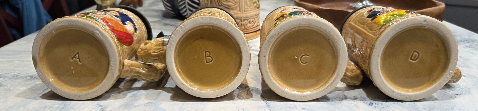 VenmoBeautiful set of 4 vintage ceramic beer steins featuring classic German "Tavern Scenes." Each stein has a unique hand-painted raised relief scene on a deep cobalt blue background and a decorative ornate metal lid. These are a matching set, marked A, B, C, and D on the bottom—perfect for a complete bar display or man cave. They are in excellent vintage condition with no chips or cracks. The hinges are sturdy and the lids open/close smoothly. Set includes: 4 matching steins Features: Hand-painted relief, ornate metal lids, traditional Brauhaus motifs Condition: Excellent vintage condition Price: $50 for the full set (will not separate) Pickup: Herriman
