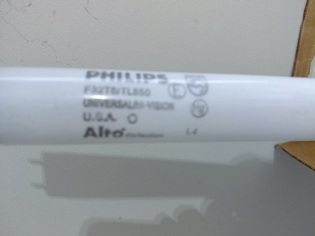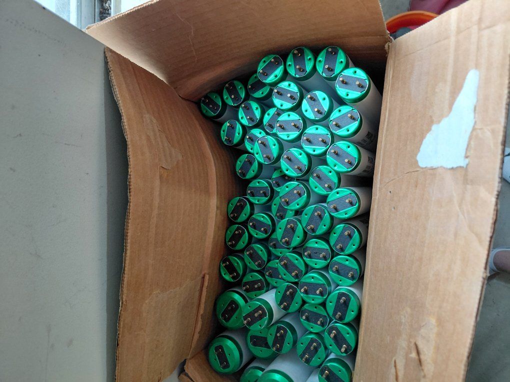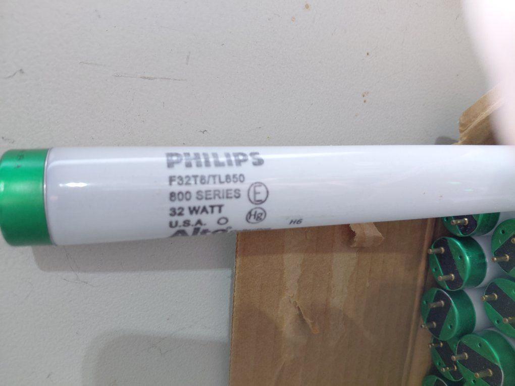 A box of over 50 48inch 32 watt bulbs. Philips F32T8/TL850 800 series