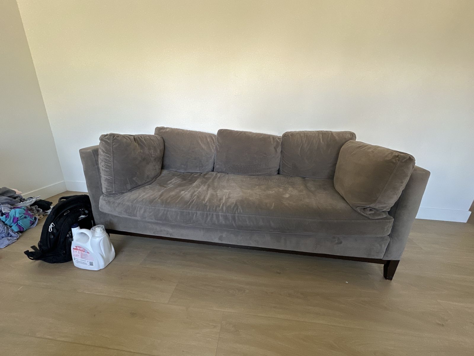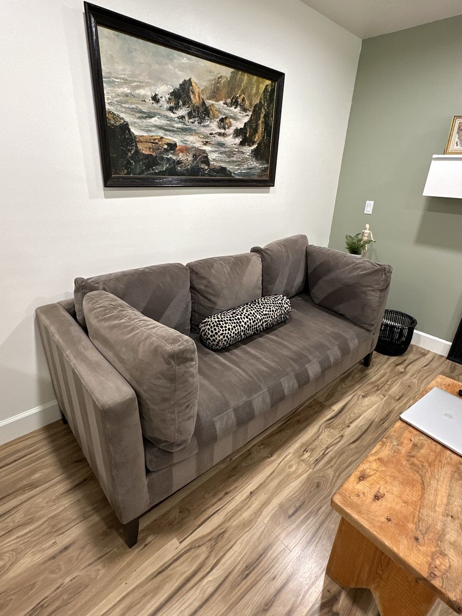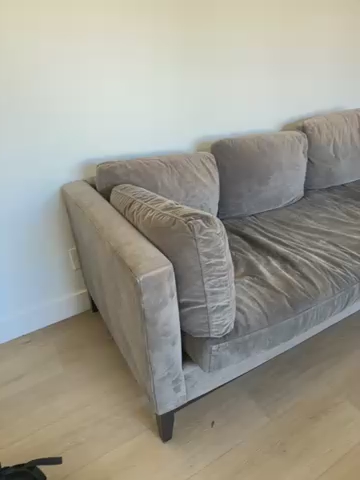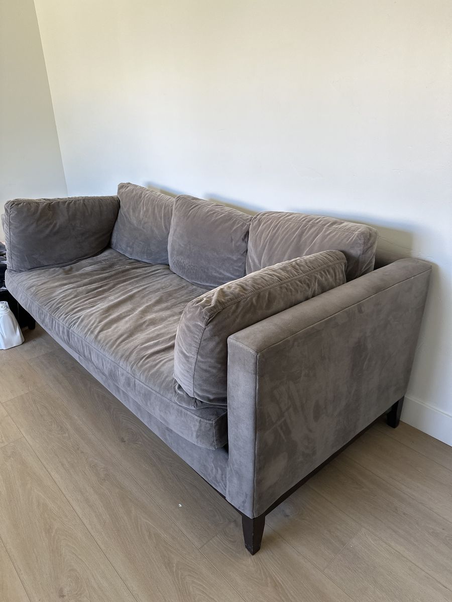 ZelleBeautiful Midcentury Modern Grey Couch with Down Feather filling and a very soft chenille fabric. This is a couch you can stretch out on and sink into its very comfortable - not firm there’s no springs. Couch is 35.5 inches deep, 81 inches wide, and 29 inches high with a seat depth (including the cushions) of 24inches. Excluding the cushions the depth is 33 inches. Seat covers are removable and washable - I would wash it for you but we just moved and don’t have a washer yet but we’ll clean this up with our upholstery cleaner - no pet household. Willing to consider offers.