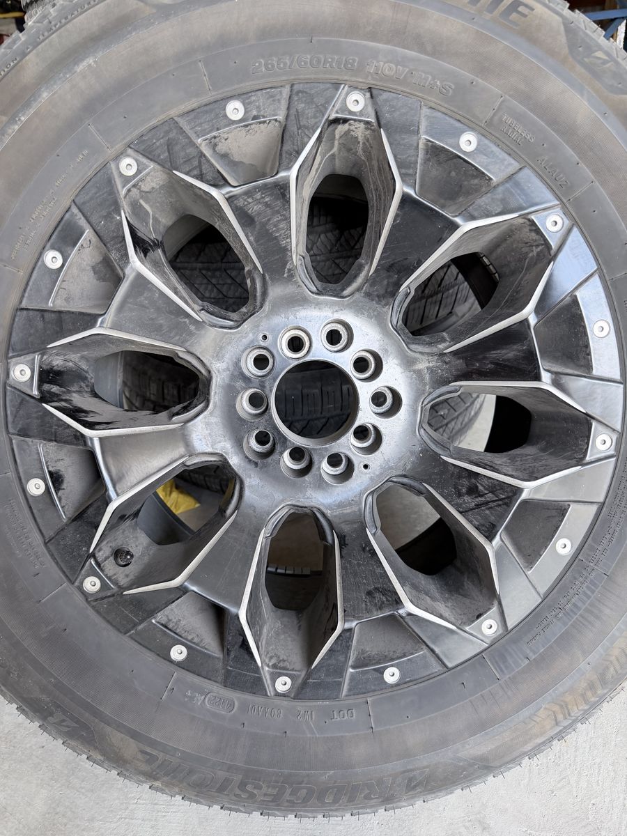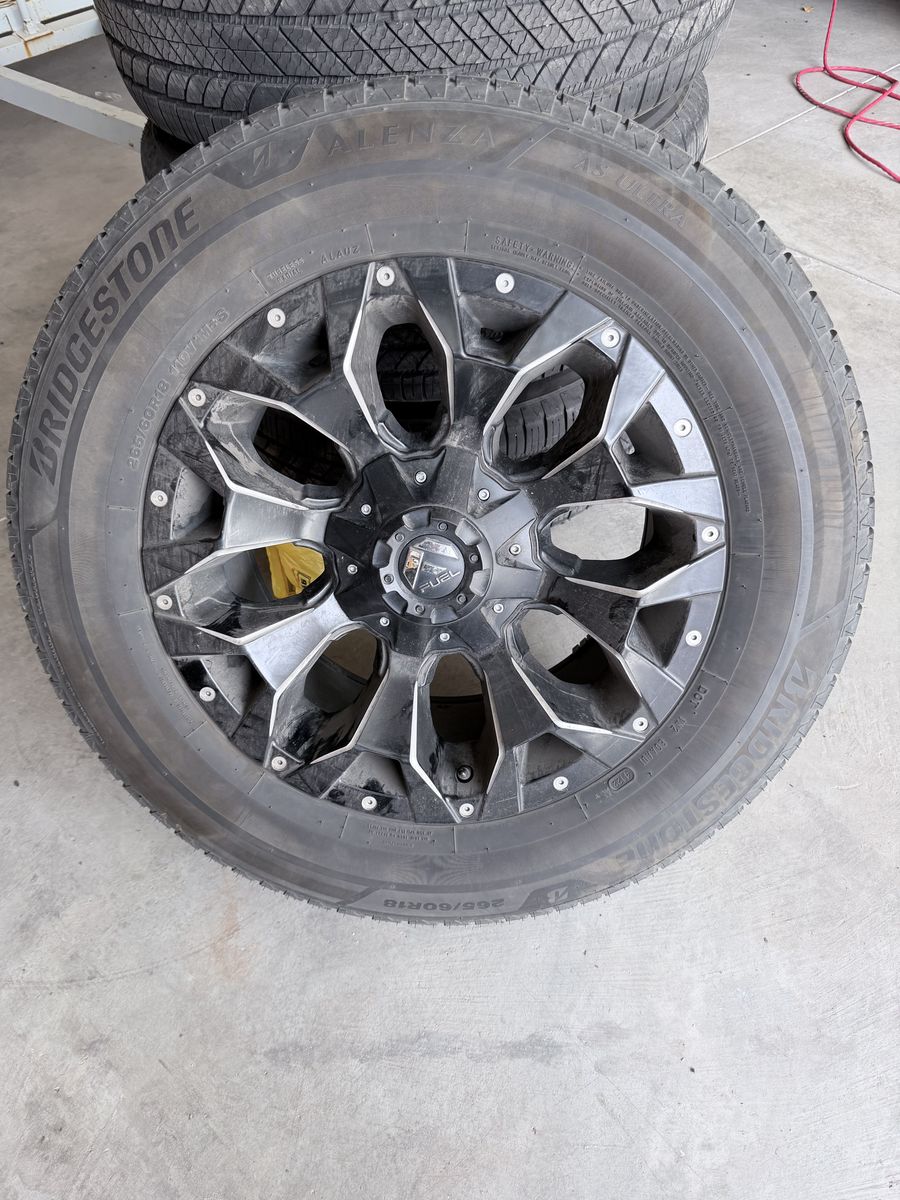 VenmoBridgestone 265/60r18 tires with fuel rims. Tires still have a lot of tred on them and the rims are in excellent shape no chips or scratches. 1200.00.