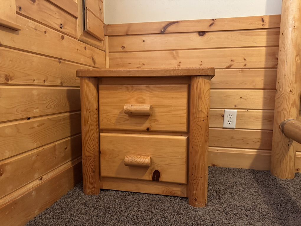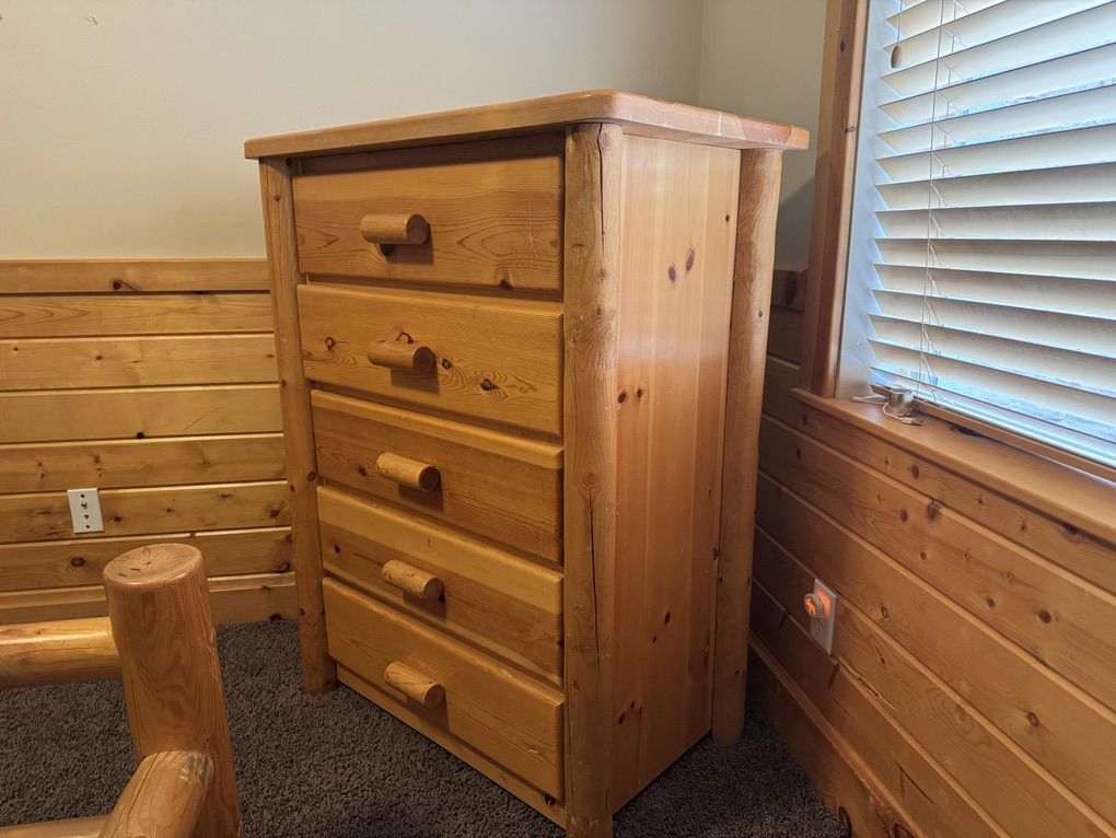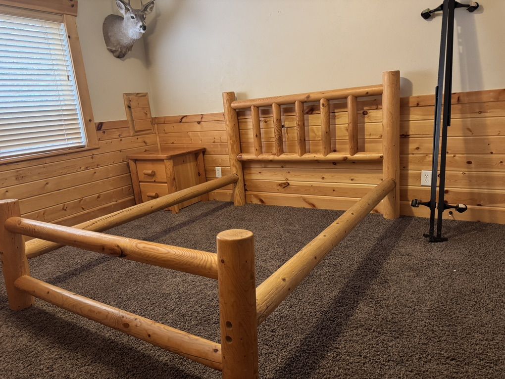 ZelleRustic log bedroom set includes full size bed frame, two-drawer night stand and 5-drawer dresser. Free - just come pick it up.