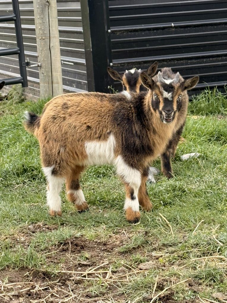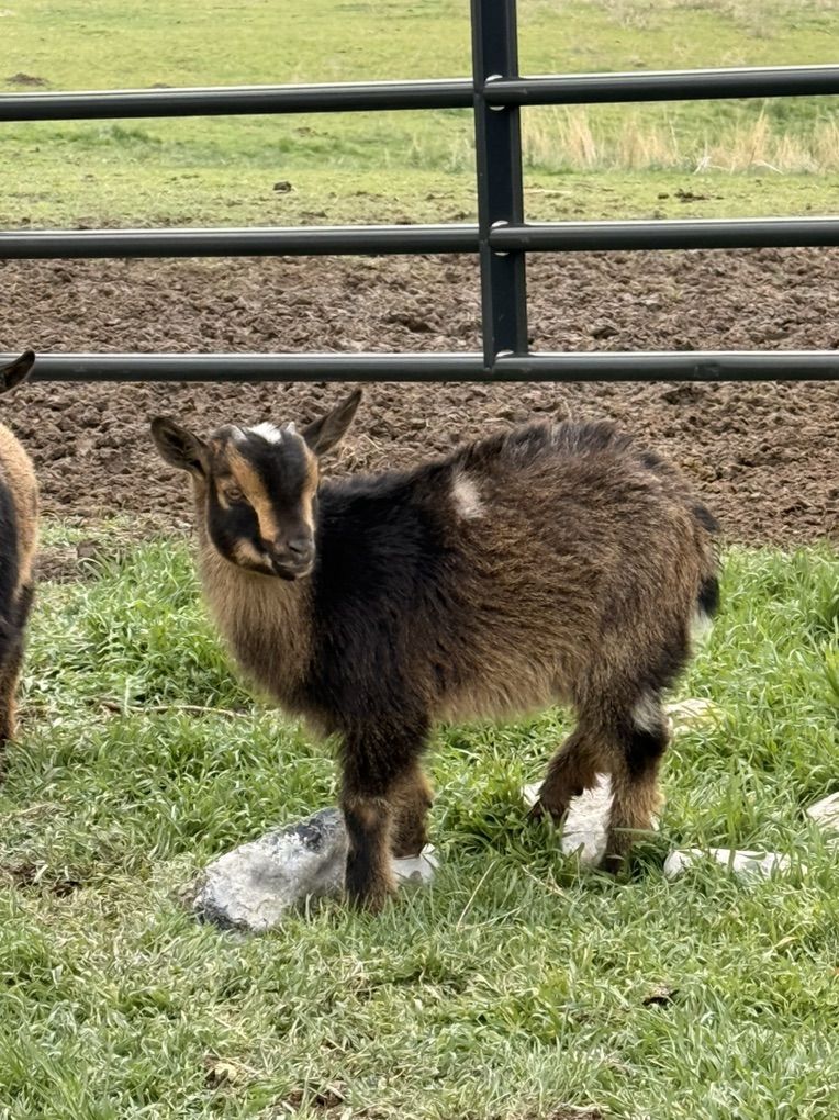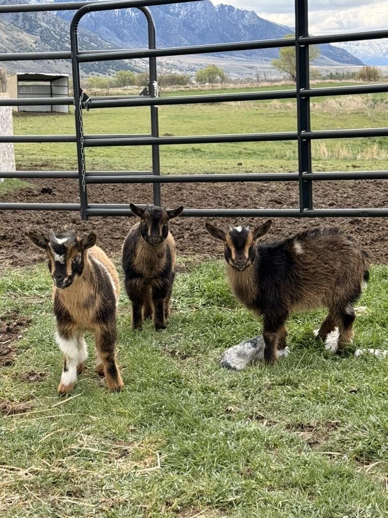 I have two bucklings and one doeling ready to go. They’re about 8 weeks old. The two on the left are the boys and they’re both blue eyed. The girl is on the right. $75 for the boys and $125 for the girl.