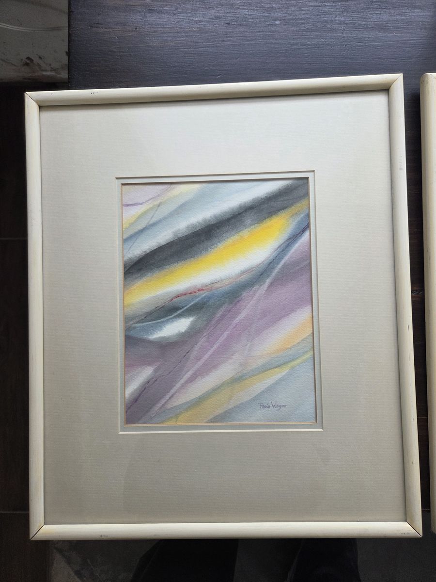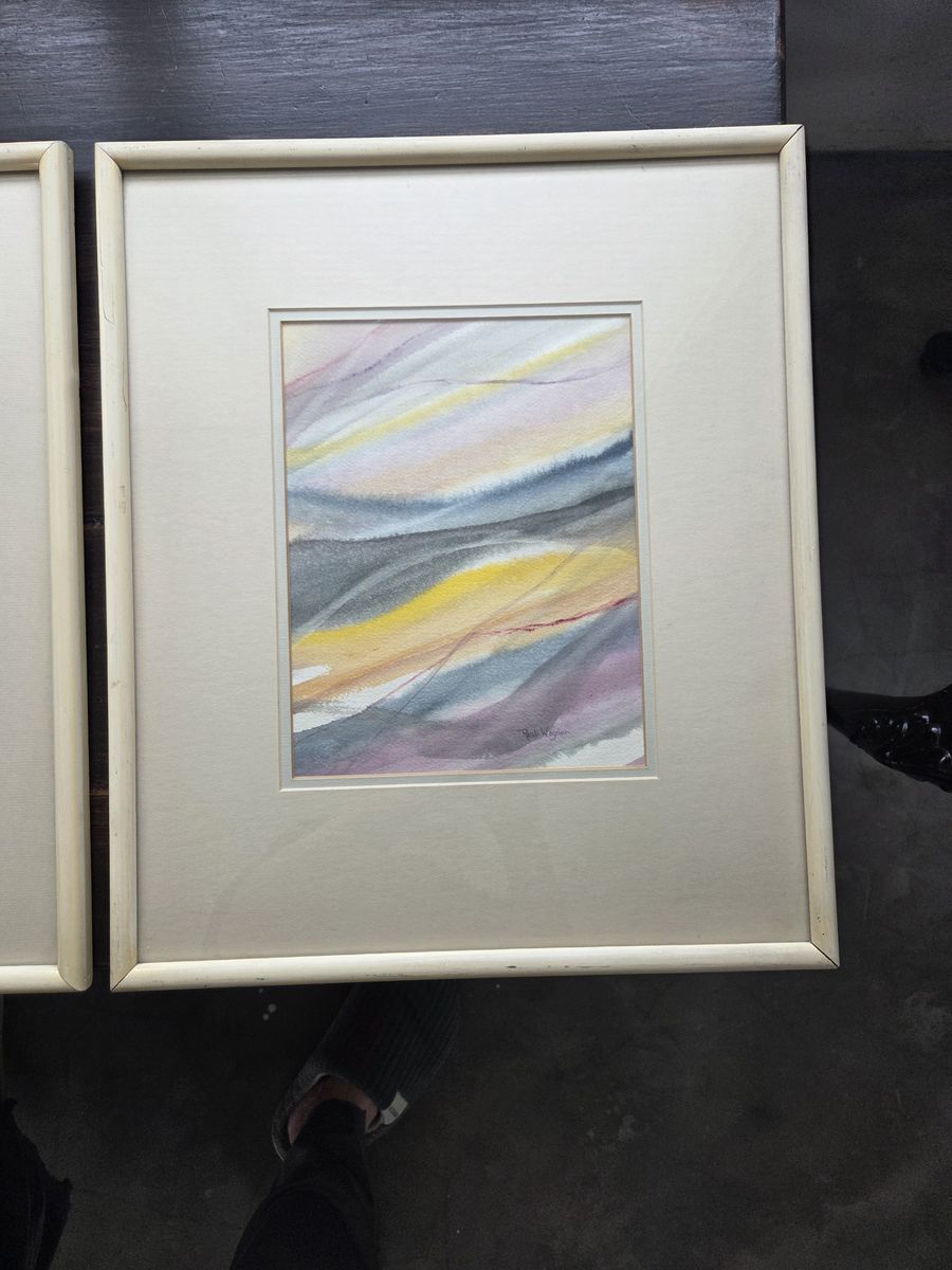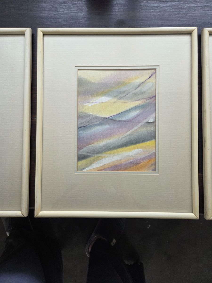VenmoBeautiful set of three (3) original watercolor paintings by listed artist Randi Wagner. These are not prints! They are hand-painted originals featuring Hansen’s signature ethereal, flowing abstract style. The color palette is a gorgeous, soothing mix of soft yellows, lavenders, and greys that would look incredible as a focal point in a living room, bedroom, or hallway. Details: Artist: Randi Wagner (Signed on the front) Medium: Original Watercolor Style: Atmospheric Abstract / Mid-Century Modern feel Format: Triptych (Set of 3) Condition: Great vintage condition. They come professionally matted and housed in matching gallery frames, ready to hang right on the wall. The mats show a slight, natural vintage warmth. Selling as a complete set of 3. These look amazing hung together to fill a large wall space! Pickup: Herriman