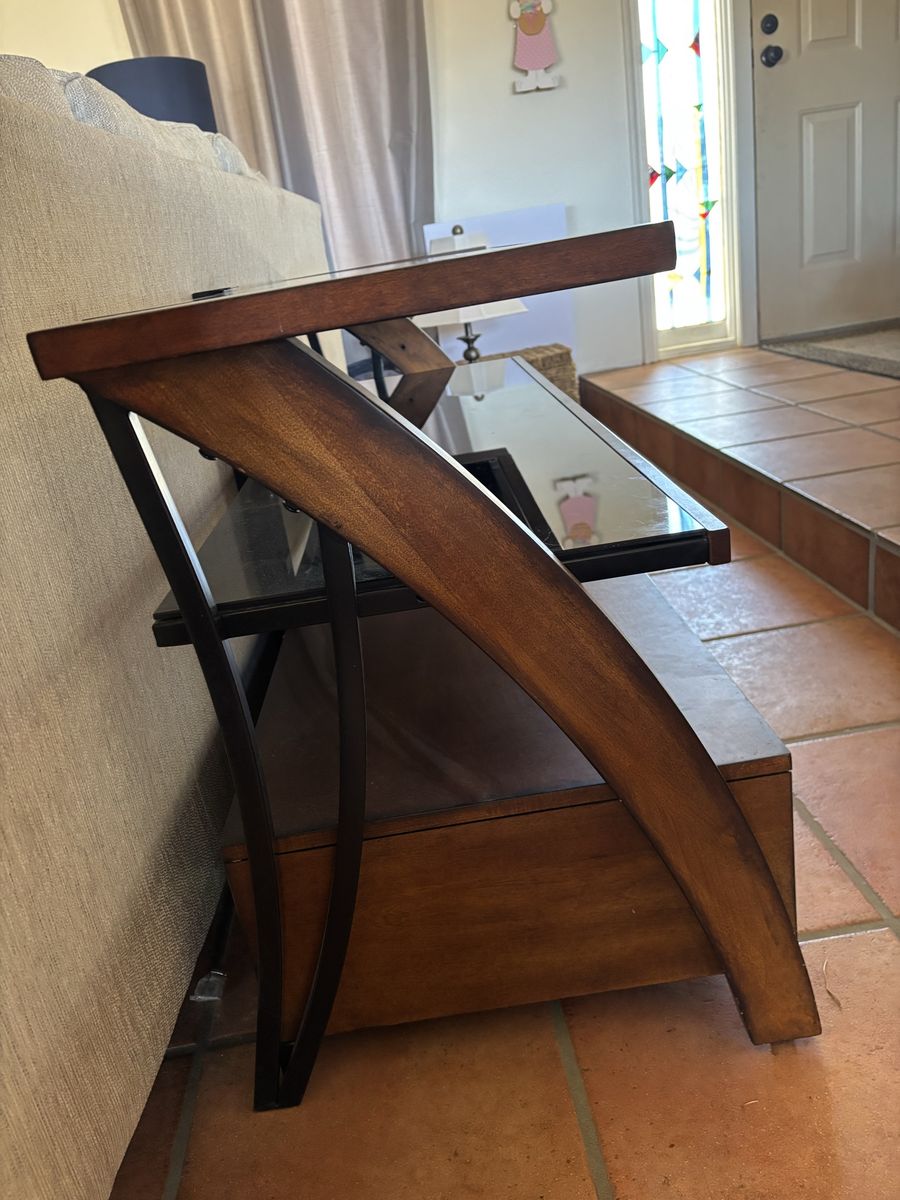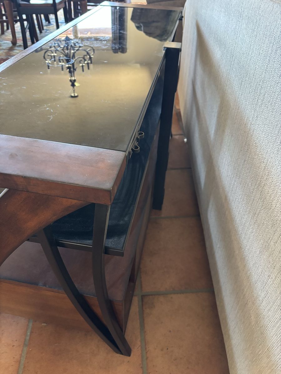 VenmoSolid wood. Glass top. Two drawers for two open shelves for storage. Beautifully crafted. Stylish design. Available for pick-up today.