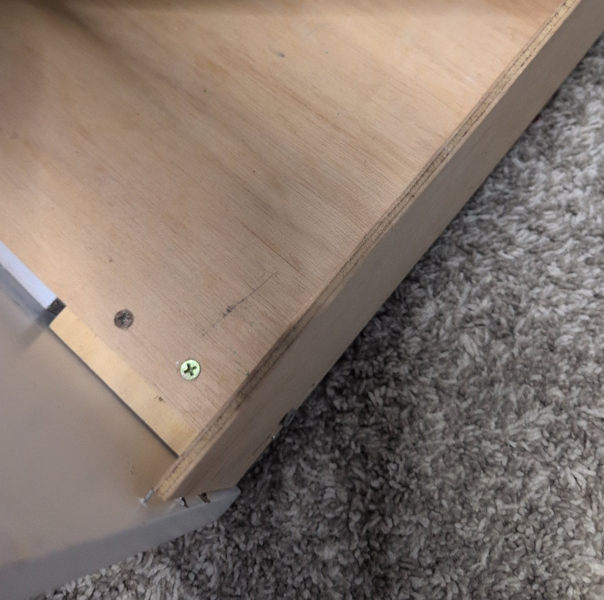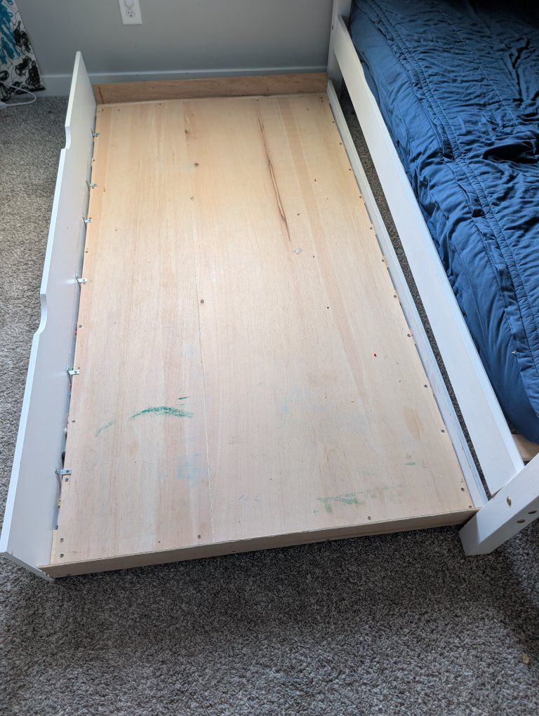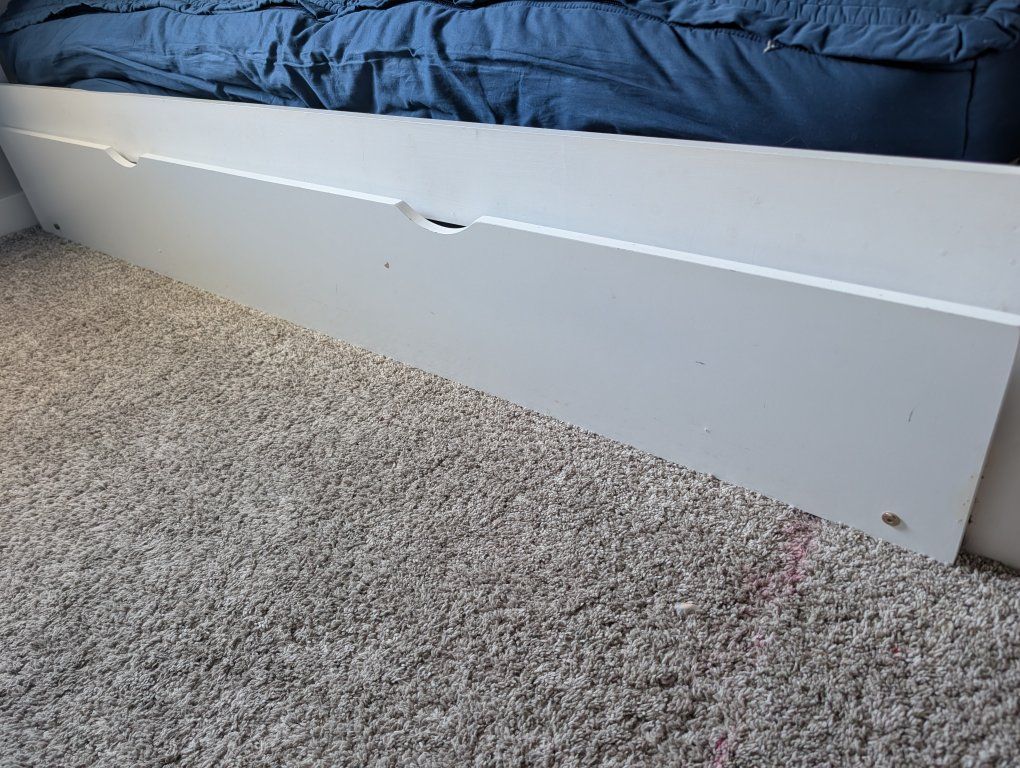 This bed has been well-loved over the last few years and shows signs of use, which is reflected in the price. Bottom bunk front support board cracked and has been reinforced—currently sturdy and functional Cosmetic wear including filled holes, scuffs, and marks Trundle has been modified for storage (flat base + sides) and shows some wear/looseness in areas