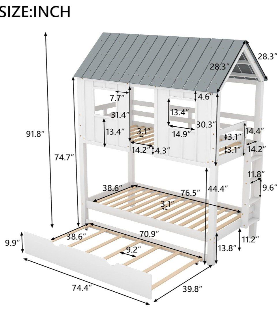 Adorable house design with roof + window details Space-saving (3 sleeping areas in one footprint) Solid wood frame (pine + MDF) Built-in ladder + full guardrails on top bunk Fits standard twin mattresses (not included)
