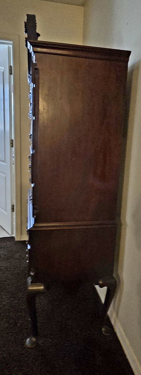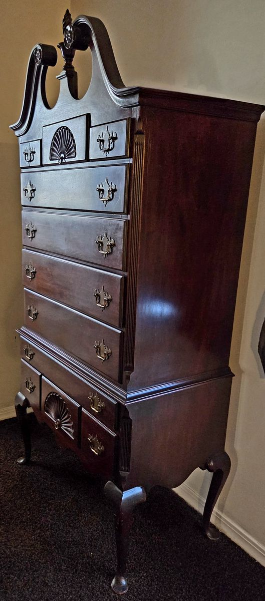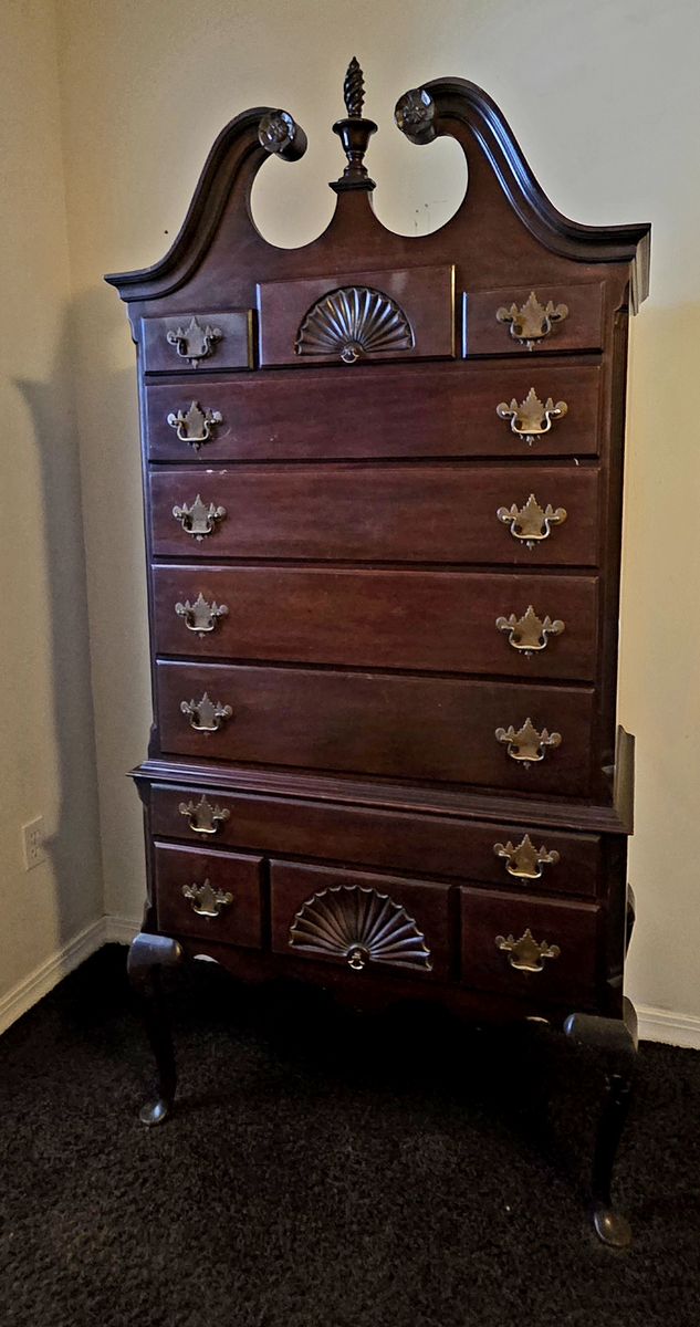 VenmoStunning vintage Queen Anne style highboy (chest-on-chest) in excellent condition. This is a stately, two-piece statement piece with high-quality craftsmanship and classic colonial revival details. Features: Design: Elegant Bonnet Top (broken pediment) with a center turned-flame finial. Details: Features two beautiful fan/shell carvings—one on the top center drawer and one on the bottom apron drawer. Legs: Classic cabriole legs with pad feet. Storage: 11 drawers total (top and bottom sections). All drawers feature traditional batwing brass pulls and move smoothly. Construction: Two-piece design for easier transport (the top chest sits securely into the bottom lowboy base). Condition: Excellent vintage condition. Very minor surface wear consistent with age, but no major scratches, chips, or structural issues. From a clean, smoke-free home. Dimensions: 35" wide x 74" tall x 19" deep
