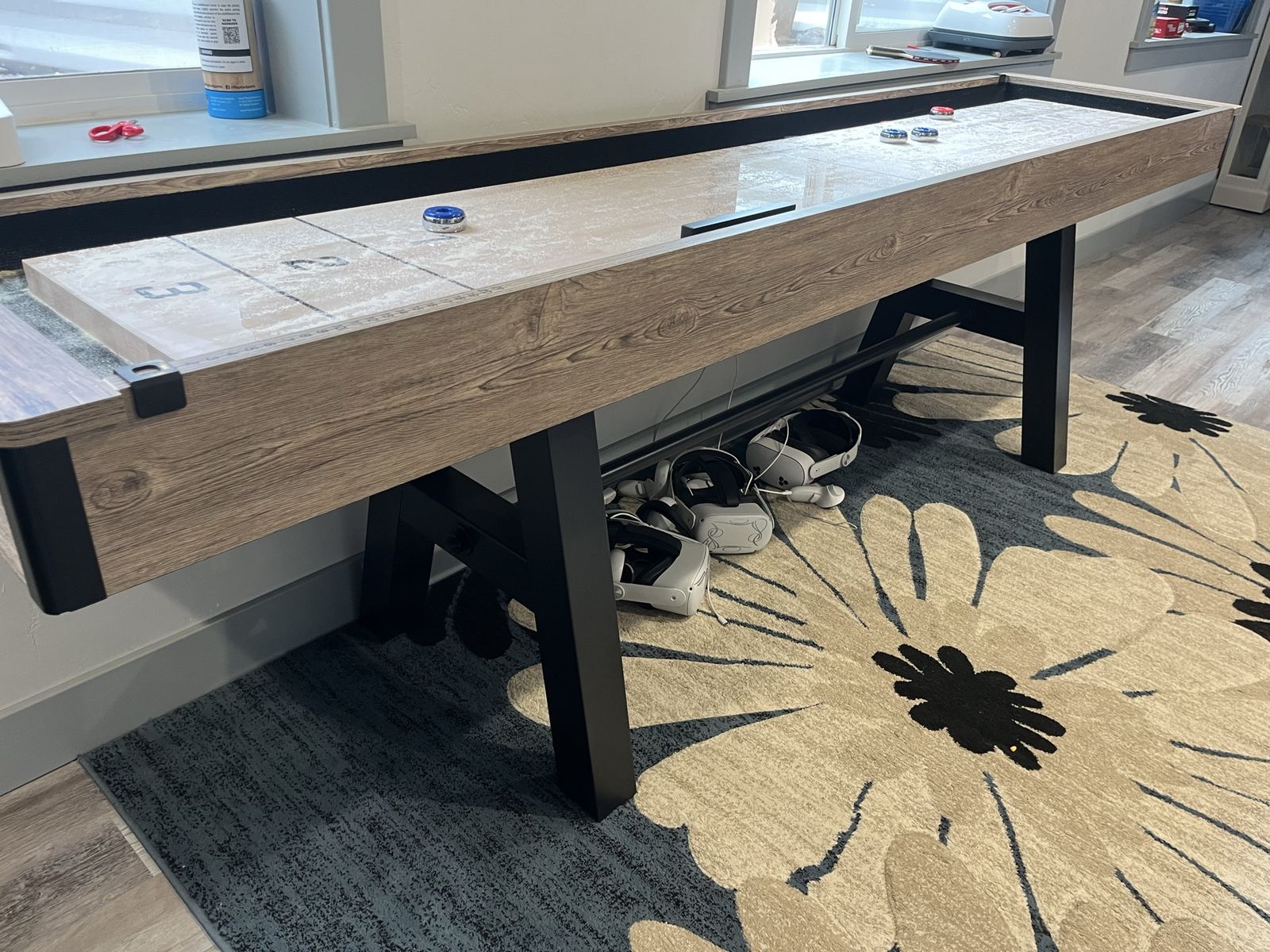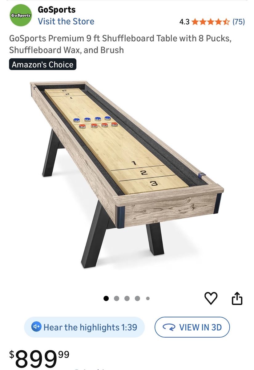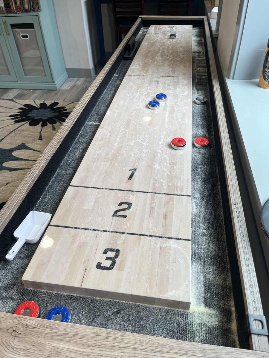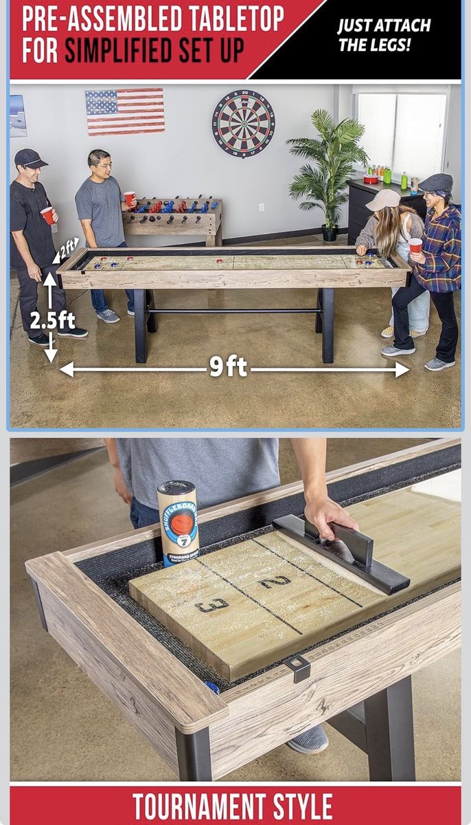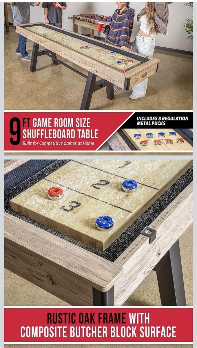 9 FT SHUFFLEBOARD TABLE: Premium game room size shuffleboard is large enough for competitive games and plays like a professional table; Assembled size measures 9 ft L x 2 ft W x 2.5 ft H MODERN DESIGN: Features a rustic oak finish frame, composite butcher block playing surface (8 ft x 14 in) and powder coated steel legs for a modern look that complements any room; Enjoy a high-end shuffleboard that will not break the bank PREMIUM MATERIALS: Table is built from sturdy composite wood and features a slick game surface with a butcher block veneer for smooth gameplay; Heavy-duty steel legs with built-in levelers add extra stability on any surface ACCESSORIES INCLUDED: Comes with 8 (4 red, 4 blue) regulation metal pucks (1.75 in. diameter), 16 oz. cannister of sand-like shuffleboard wax, shuffleboard brush, and built-in score trackers