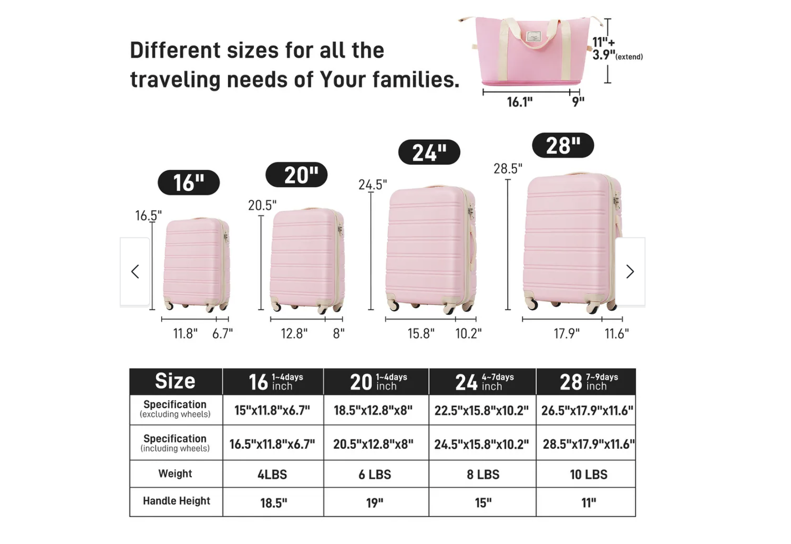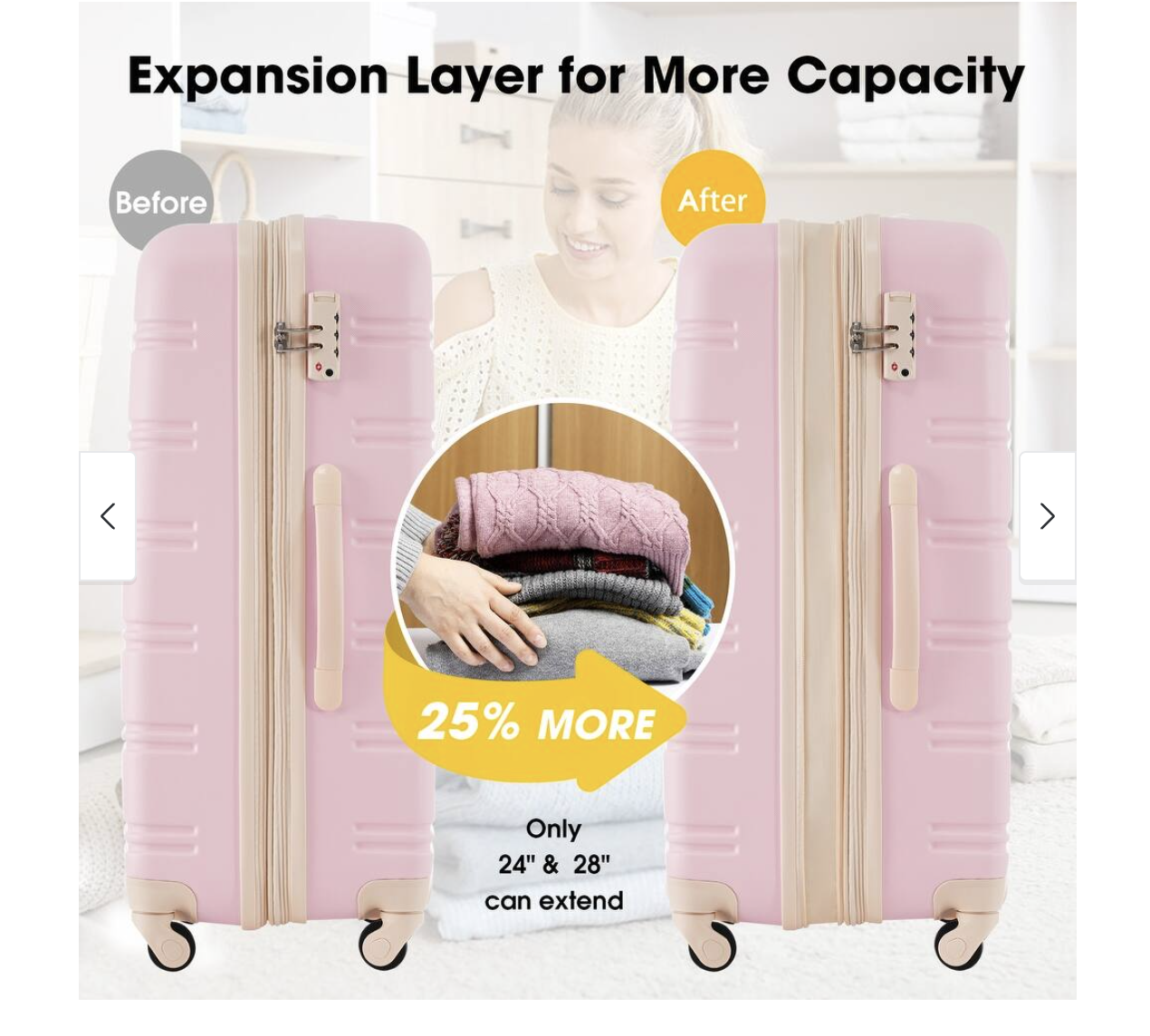 Coming in a complete uniform set, enjoy a matching small and large luggage to travel with together or separately depending on how much you decide to bring with you on your trip.The 24inches and 28inches Suitcases,can expand for extra storage room while needed. [Suitable Luggage Set] Coming in a complete uniform set, enjoy a matching small and large luggage to travel with together or separately depending on how much you decide to bring with you on your trip.The 24inches and 28inches Suitcases,can expand for extra storage room while needed. [Lightweight and Durable] Keep your load as lightweight as possible while traveling with our luggage pieces manufactured with feather light ABS material formulated for high durability while not weighing the luggage down.The surface resists scratches,won't be scratched easily, keeping your suitcase still keeping great after travel. [Safeguard 3 Digit Lock] High security performance and comprehensive protection of your privacy.Rest easy while traveling and know that your belongings are under safe keeping with the built in customizable 3-digit lock that keeps out potential thieves. [360° Spinner Wheels & Comfort Handle] Each luggage is fitted with quad smooth-glide base 360 degree swivel spinner wheels for easy transportation through terminals, on concrete, cobblestone and more.One-button locking handles provides easy maneuverability when extended from the suitcas, and stores neatly inside when not in use. The 3 positions adjustable handle can help you change to your suitable length