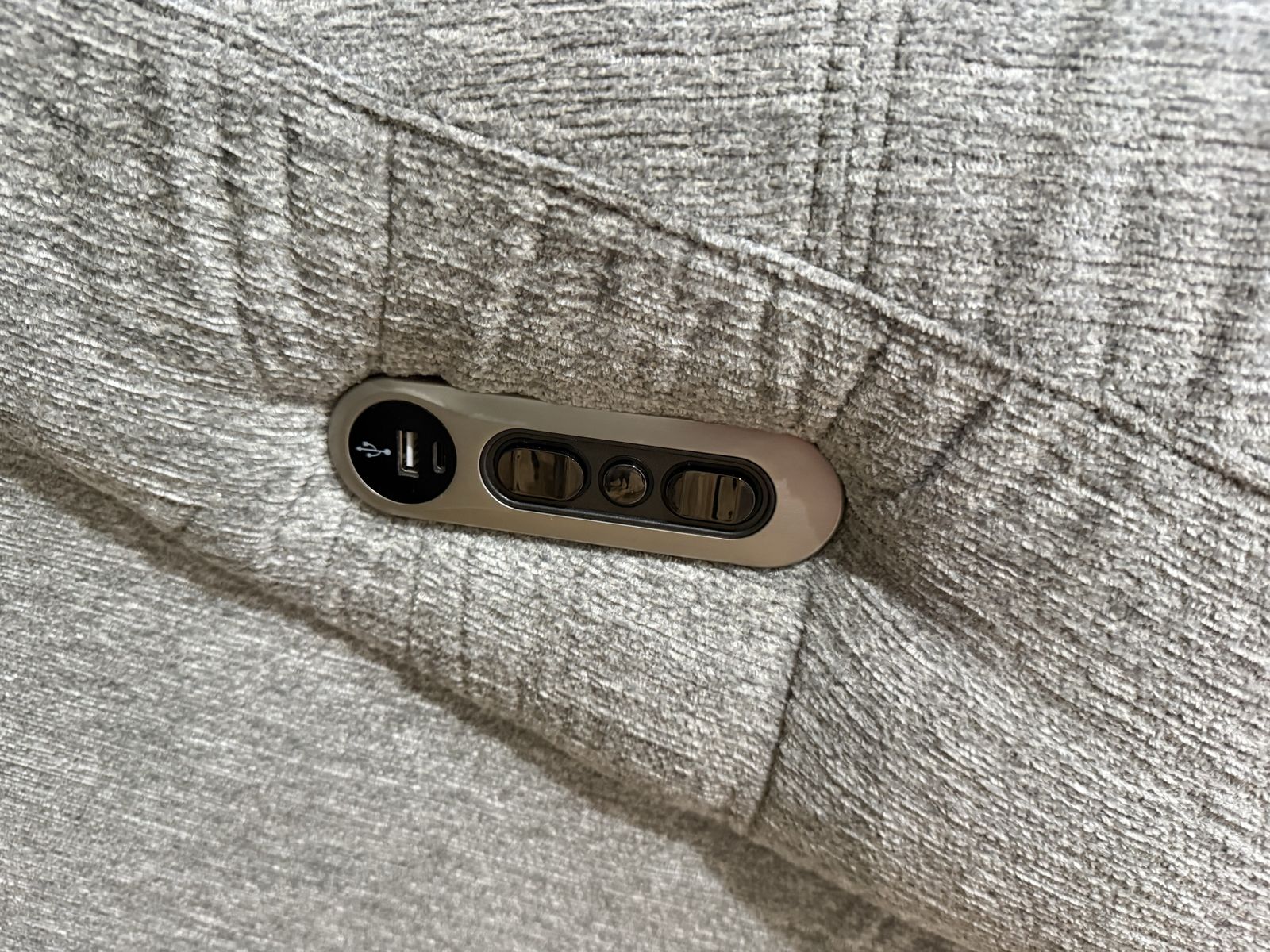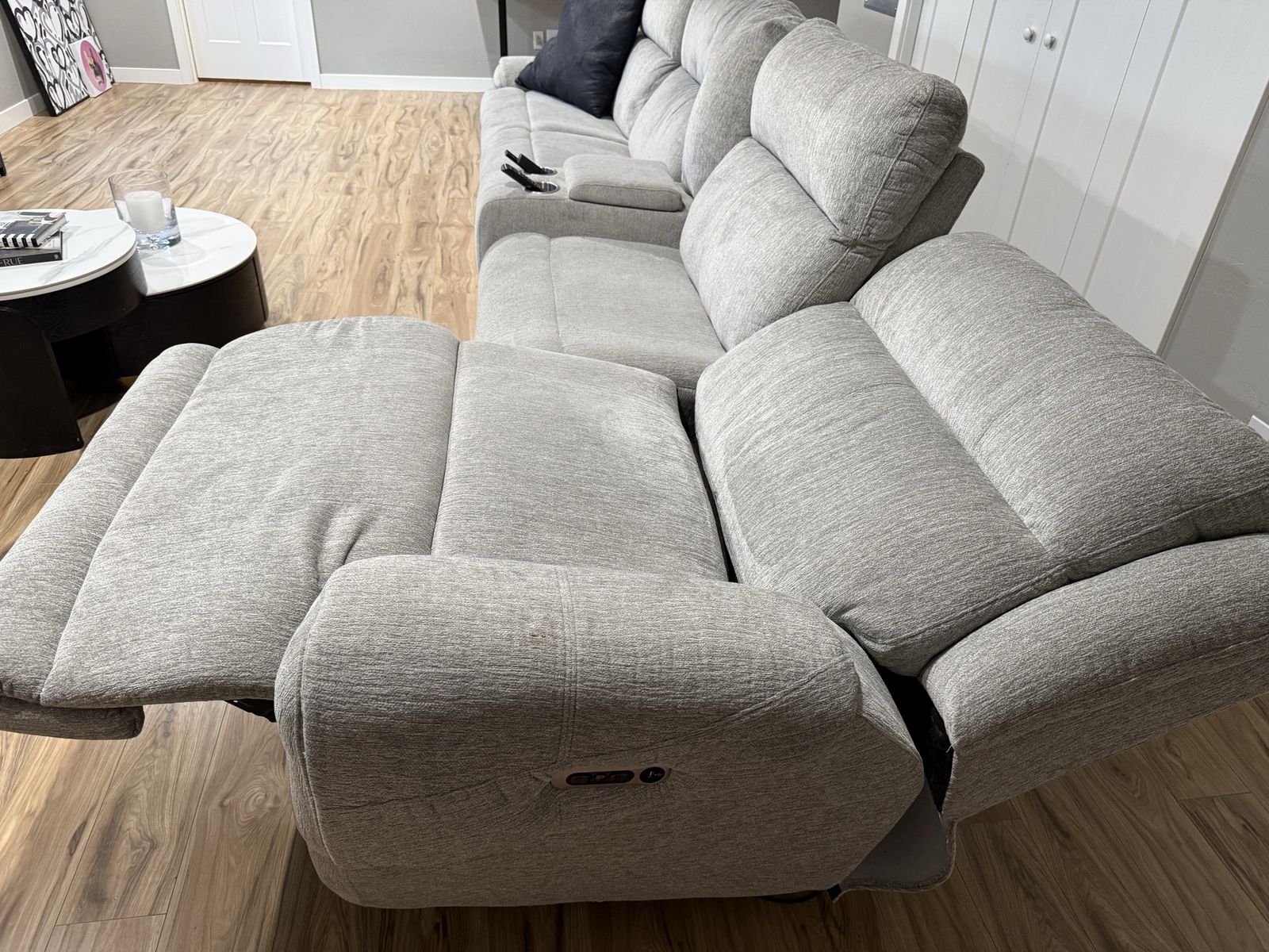 From Living spaces in Draper. Both ends are power recliners and have USB ports. Center console has two more USB ports and a normal power source plug for your laptop etc. There is another recliner that has pull lever (not powered). In good shape. A light grey color. Very comfortable. $600 OBO.