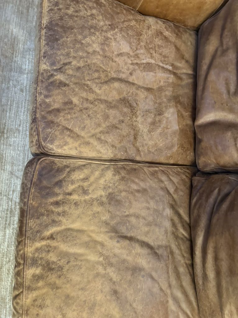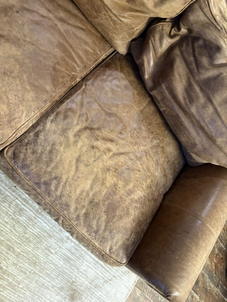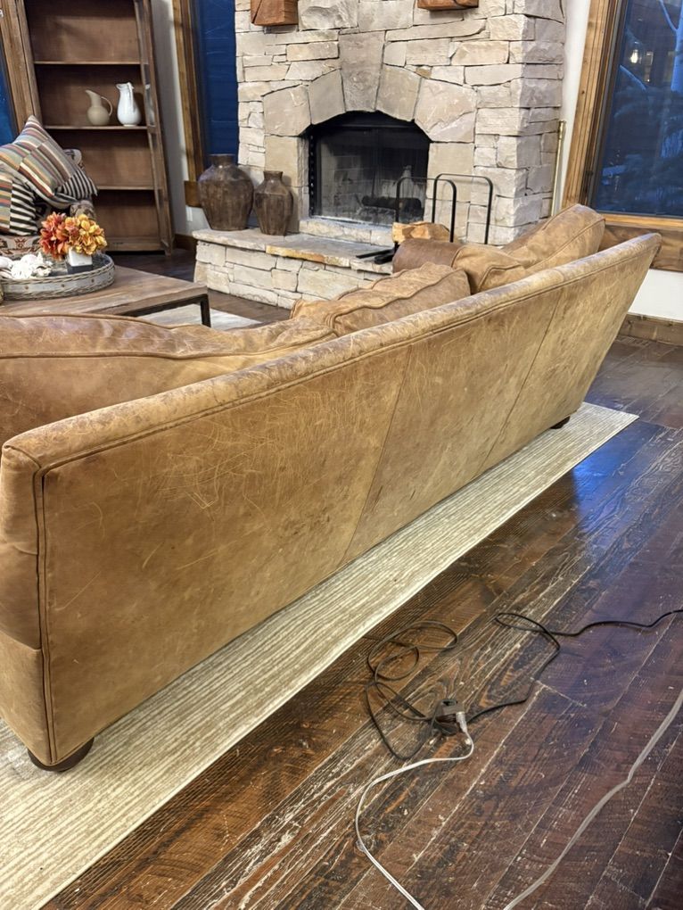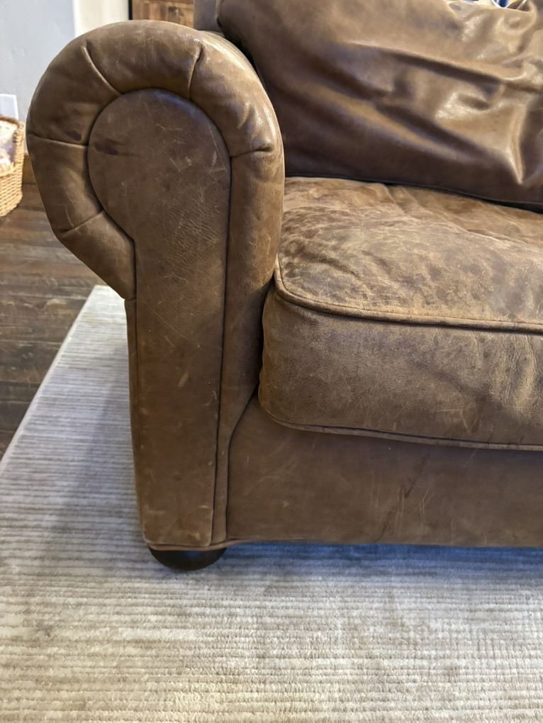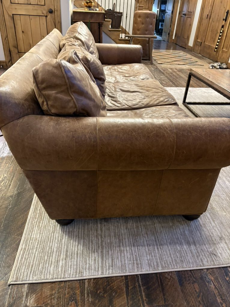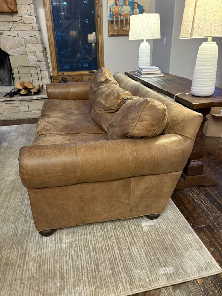 ZelleThis is a 12 year old custom Restoration Hardware Sofa that is leather with down cushions. Great used condition! 93” wide, 43” deep and 31” high.