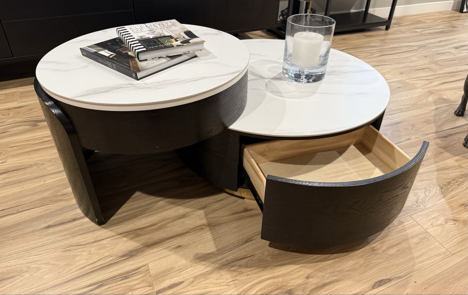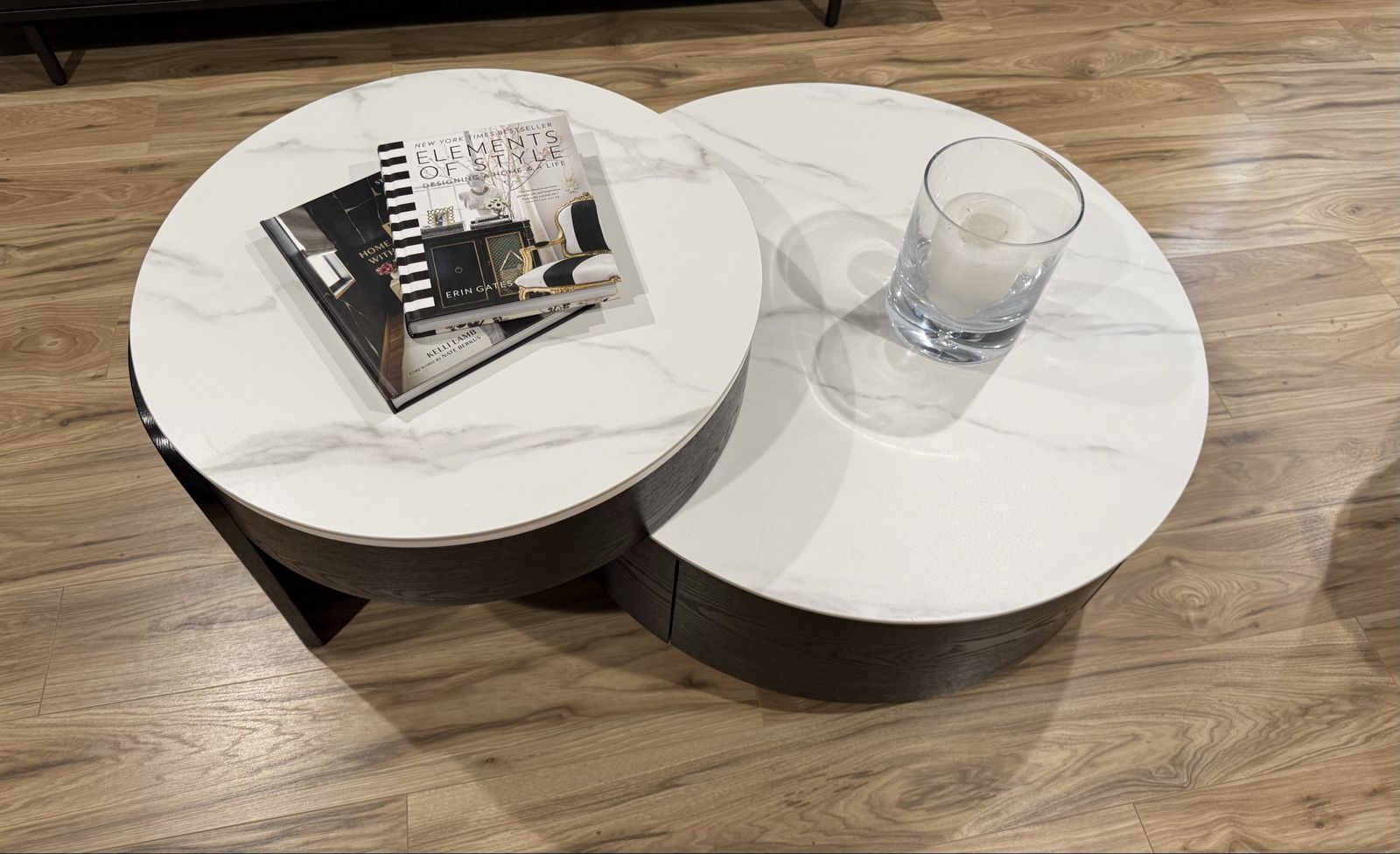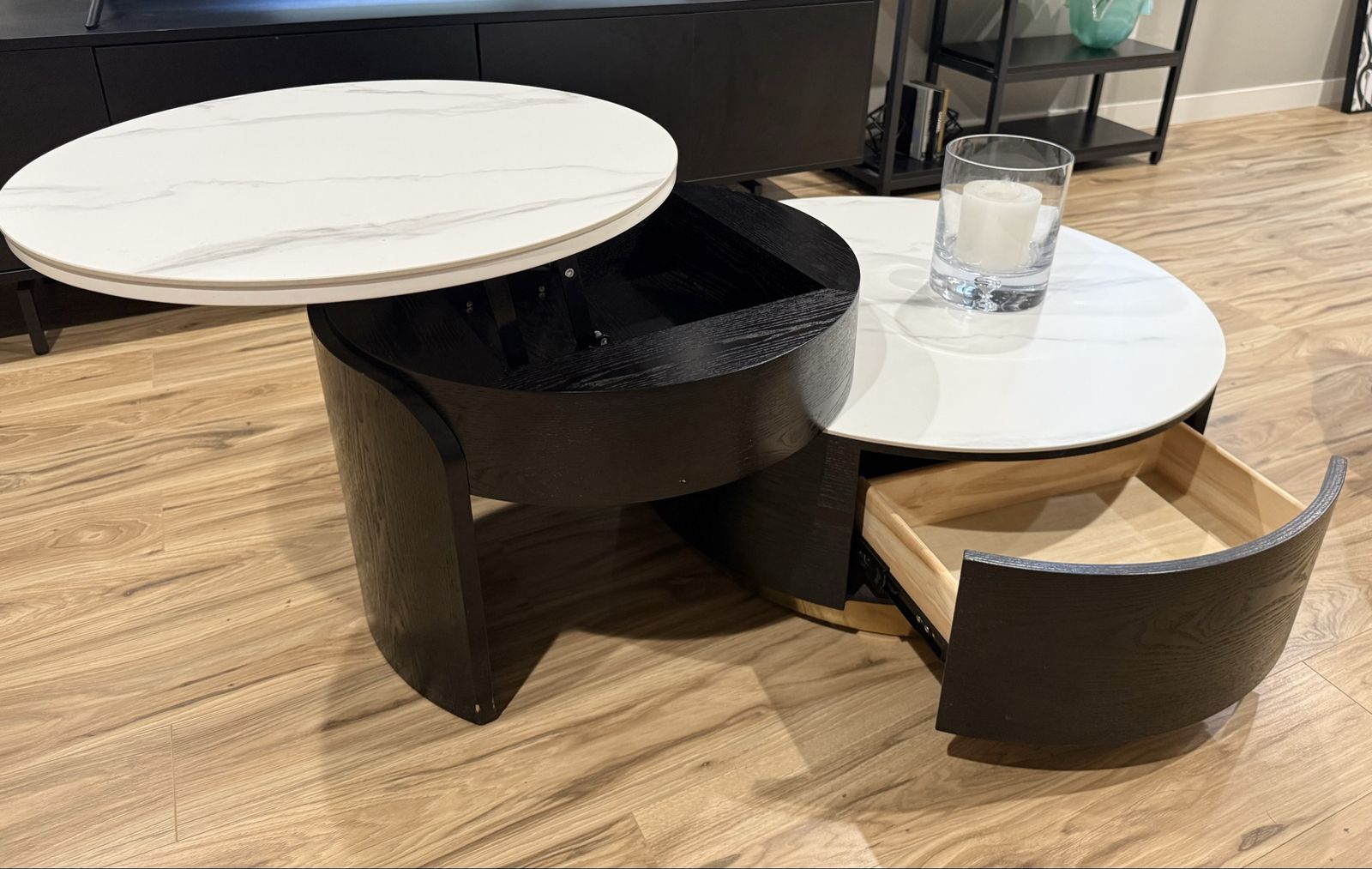 Very aesthetically pleasing. Marble type top with wood base. Gold trim at very bottom. In great shape. Opens up for storage.