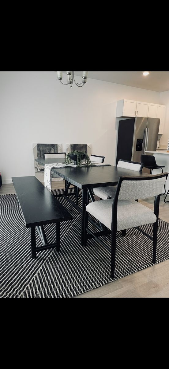 From Living Spaces in Draper. 4 seats plus large bench seat. Black wood with grey upholstery on chairs. Very nice table set!
