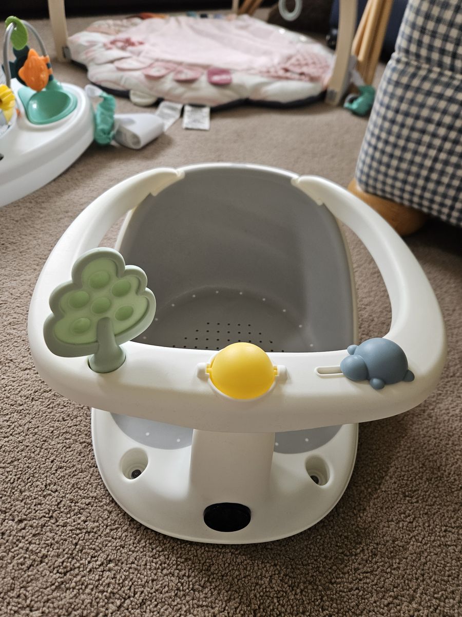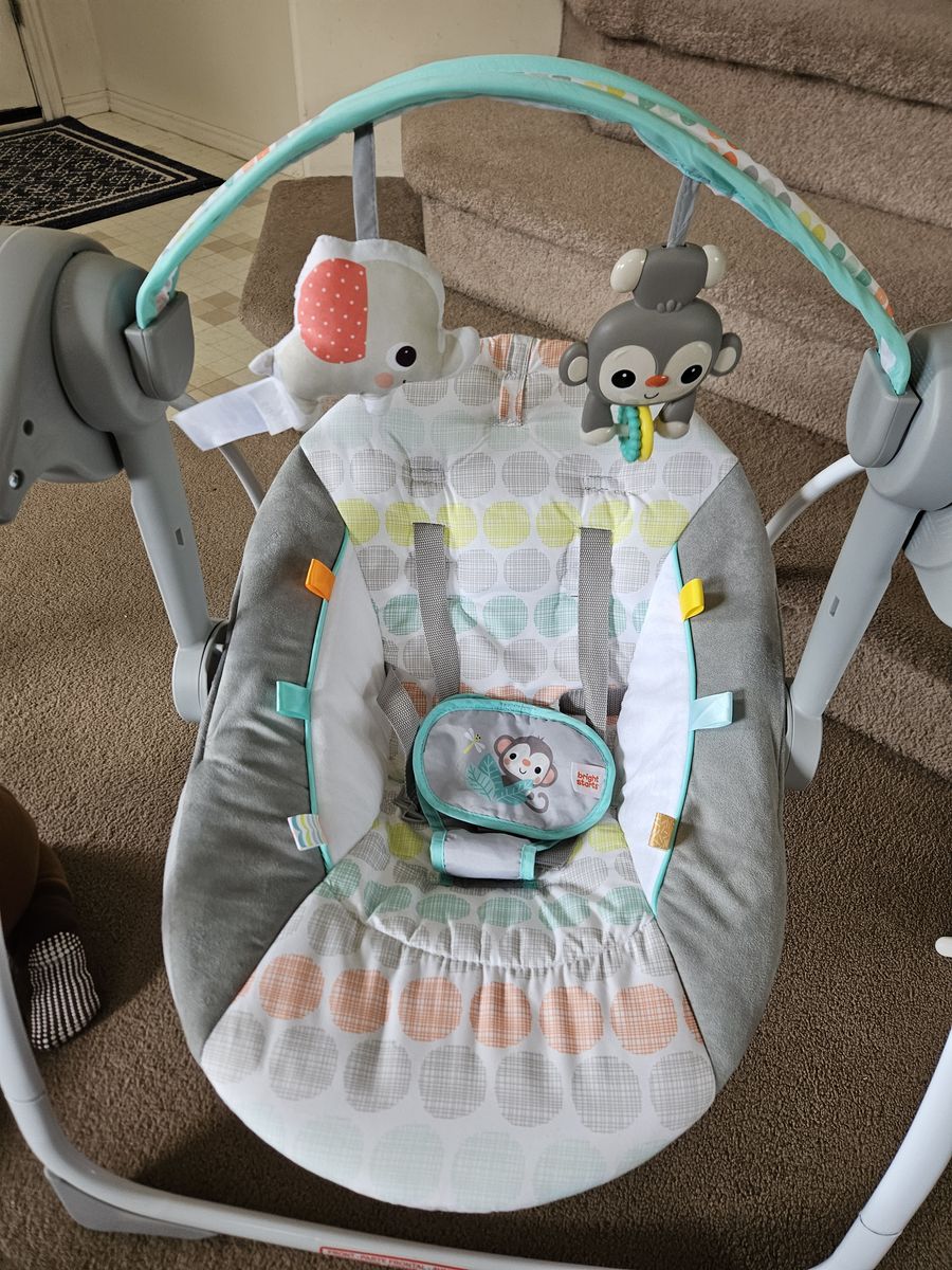 I have 2 swings, a bath seat, a bassinet, and a jumper thing (I honestly don't know what they're called). All but one of the swings are very lightly used and look almost brand new. The bath seat has been used about 4 times. Feel free to text me if you want measurements or have any questions!