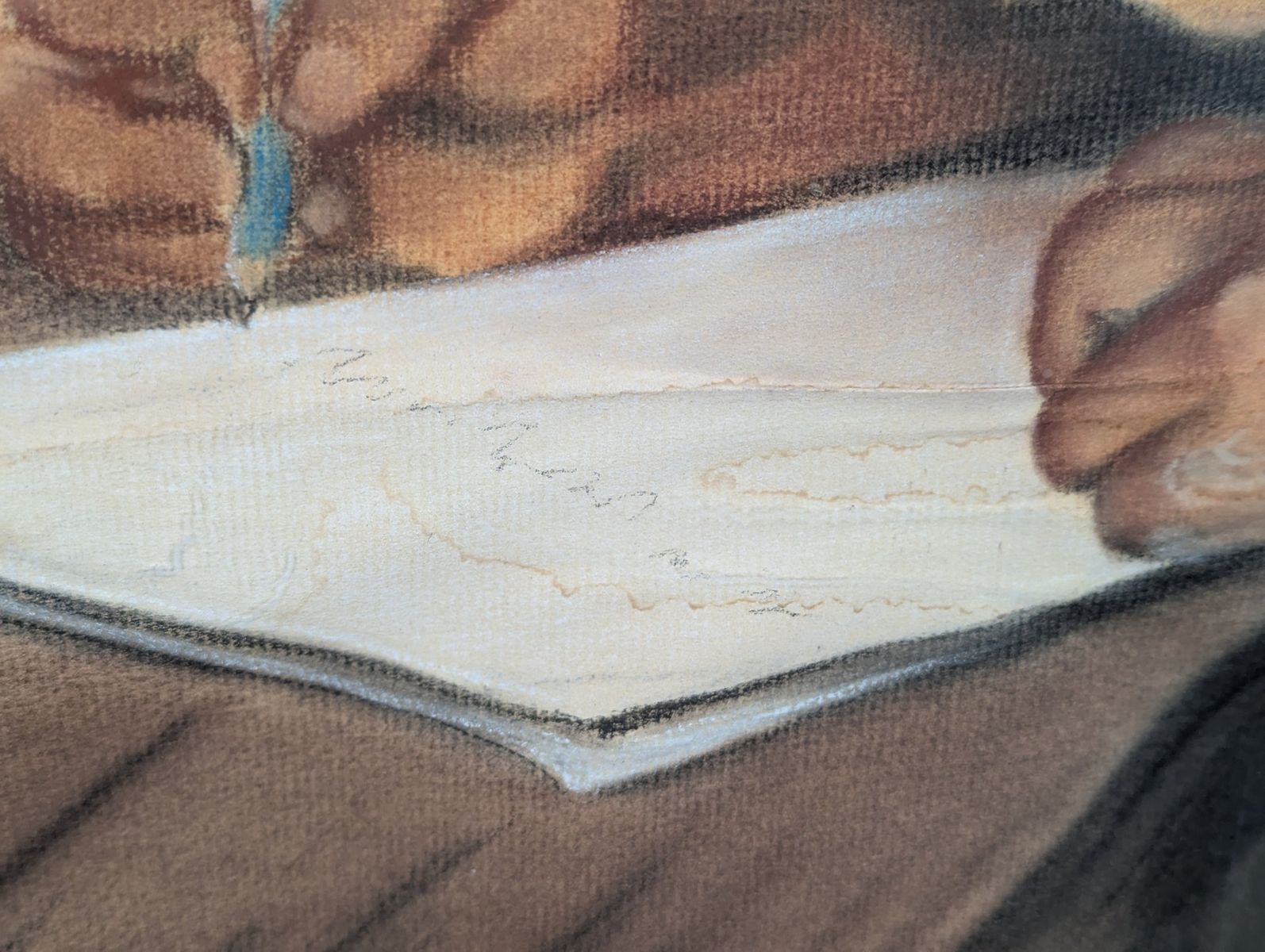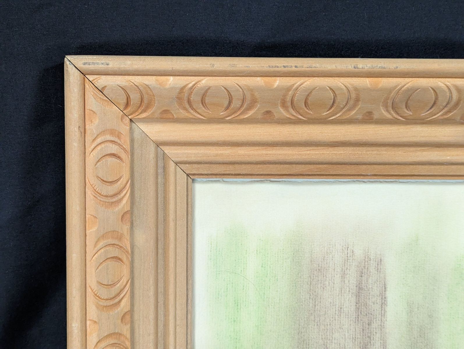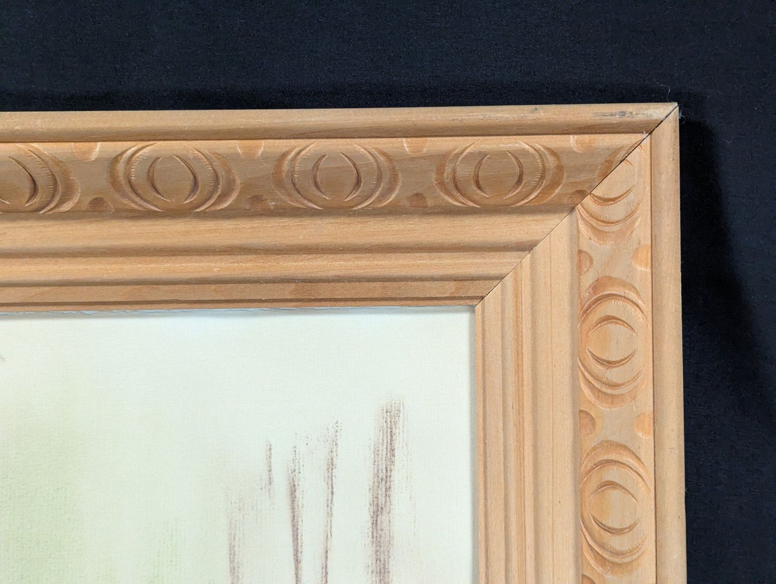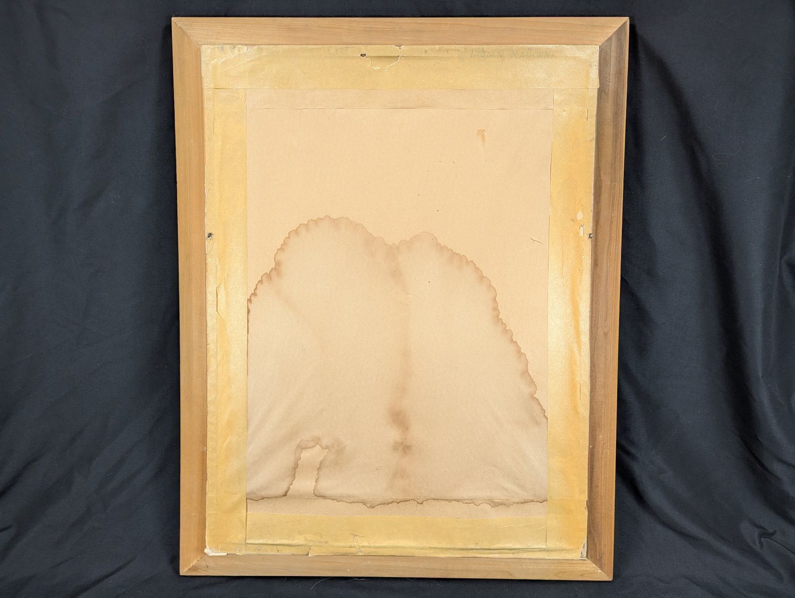 Good; the frame shows minor surface wear on the corners. The artwork exhibits potential water damage and warping on the lower portion of the drawing surface, and there is visible water staining on the paper backing. The artwork has not been removed from the frame to determine the full extent of the damage.