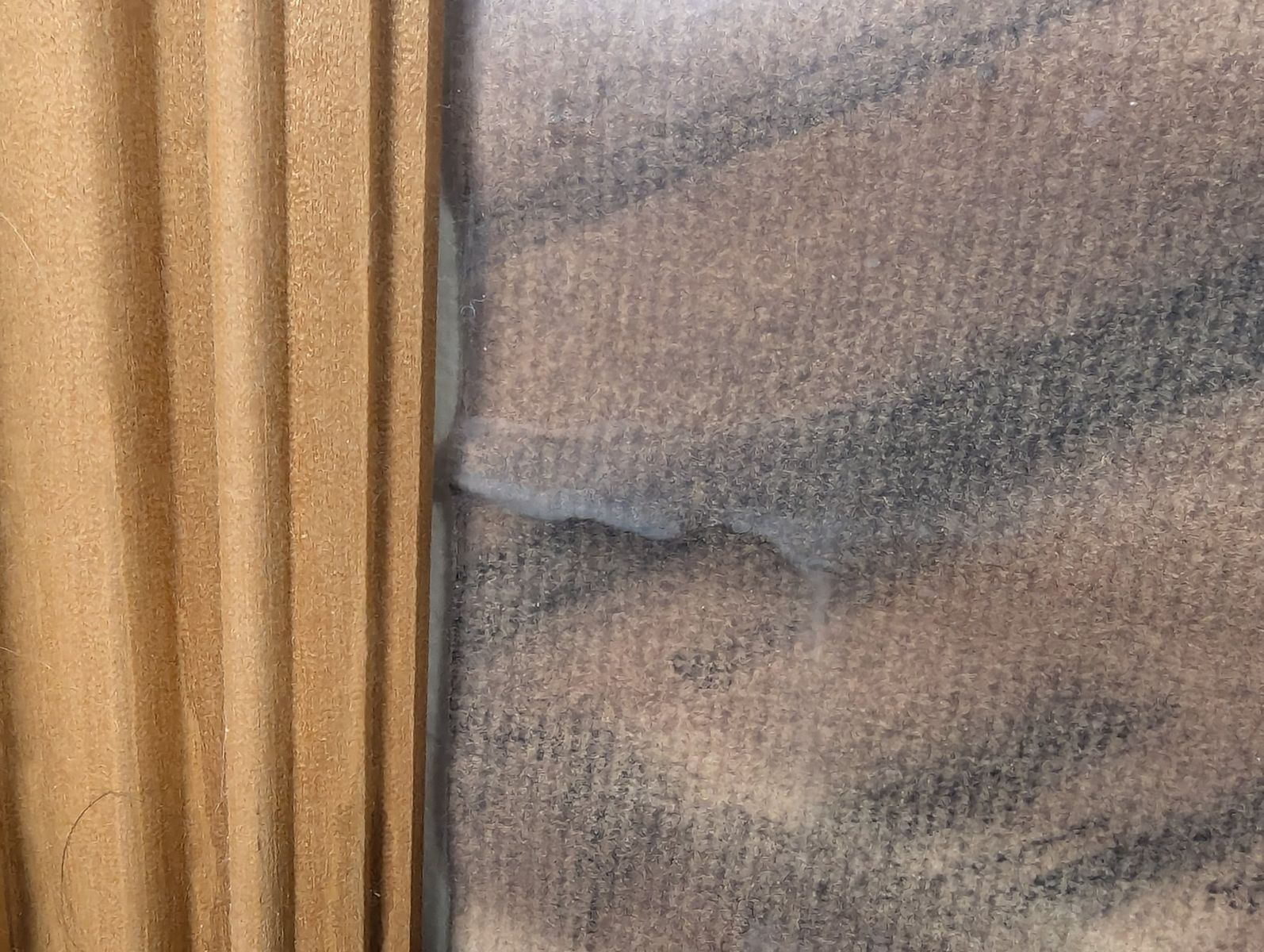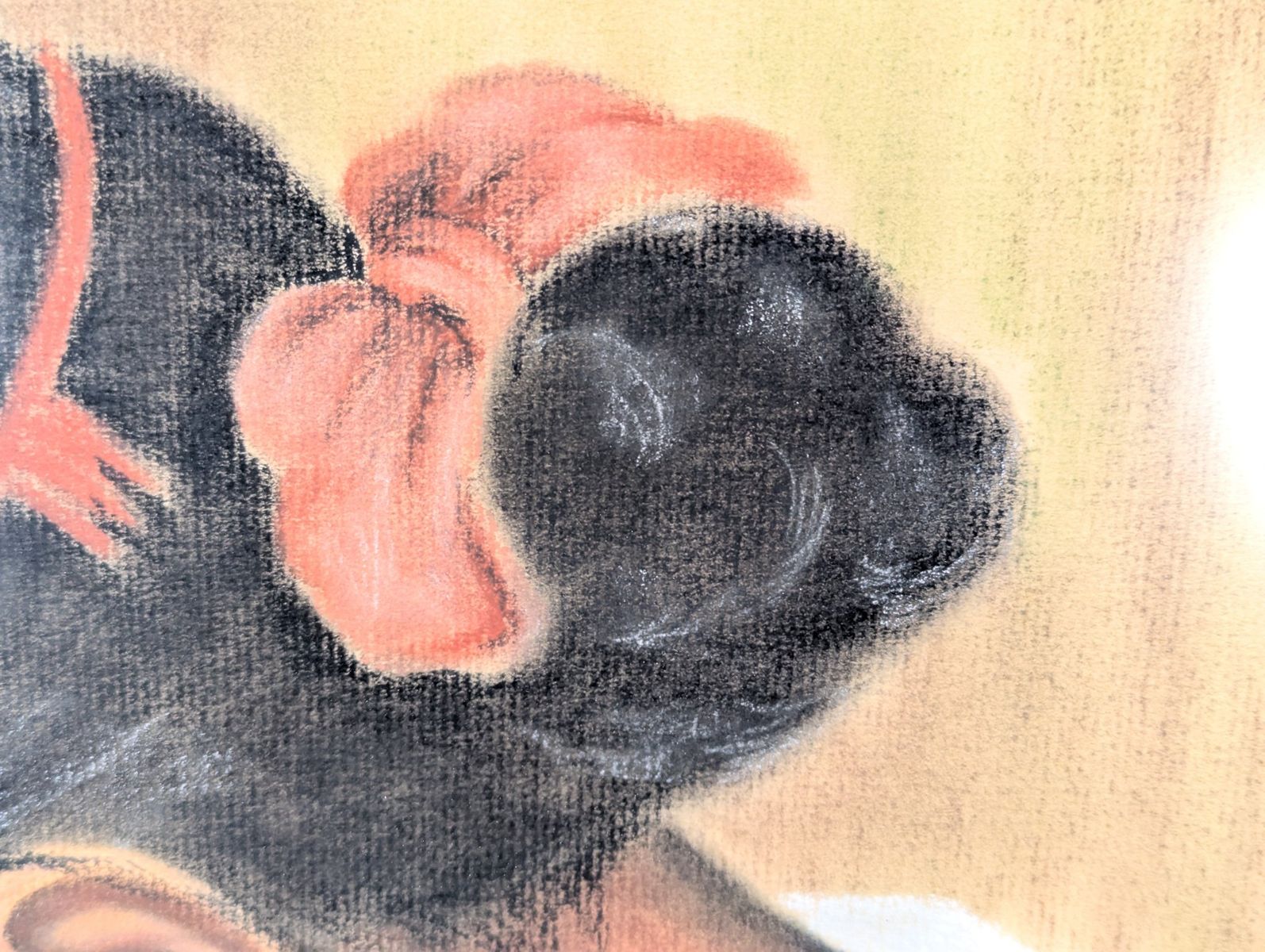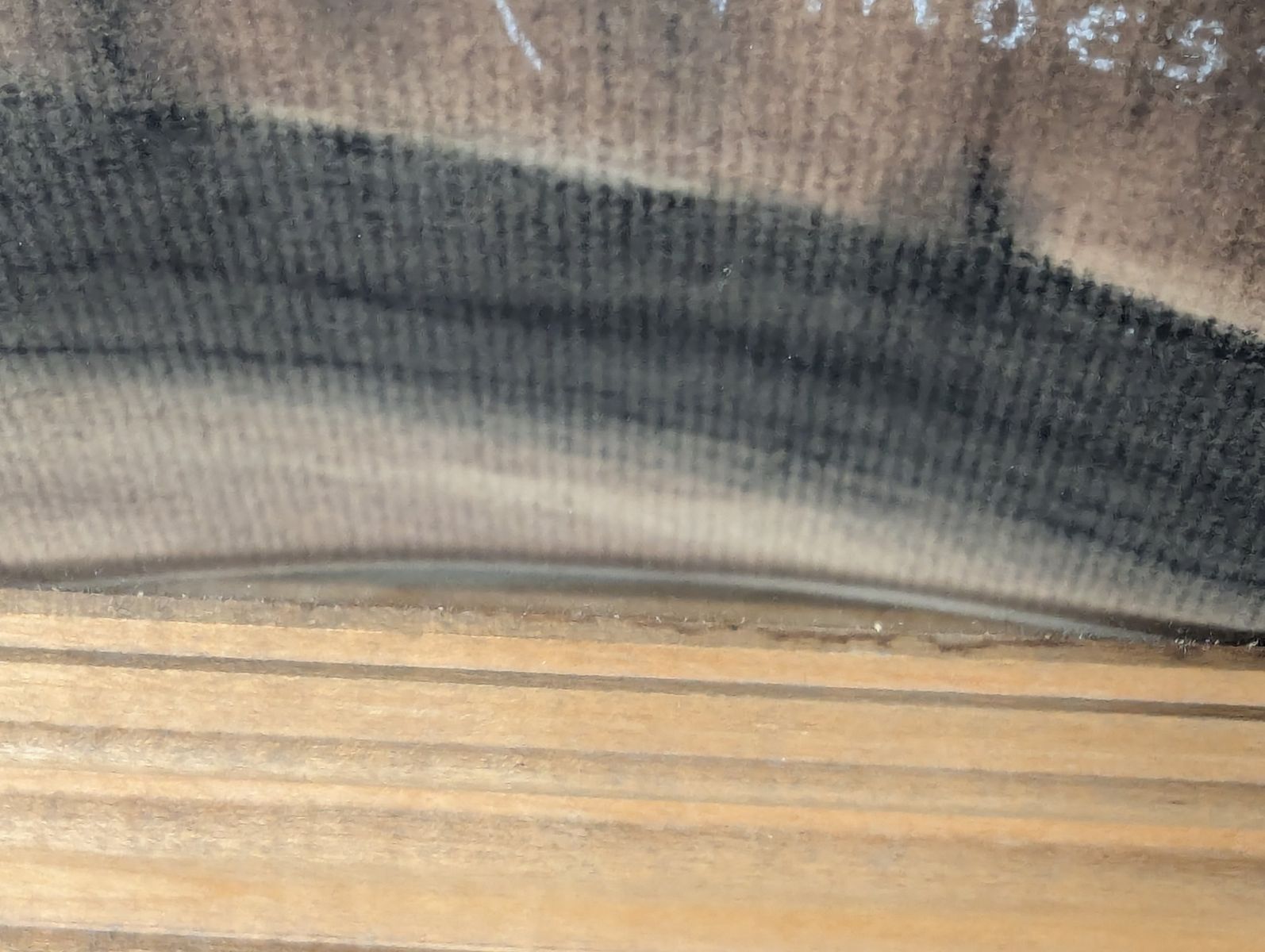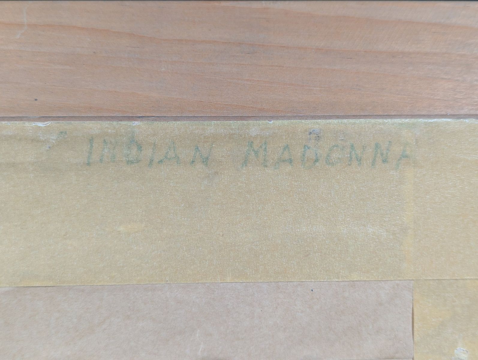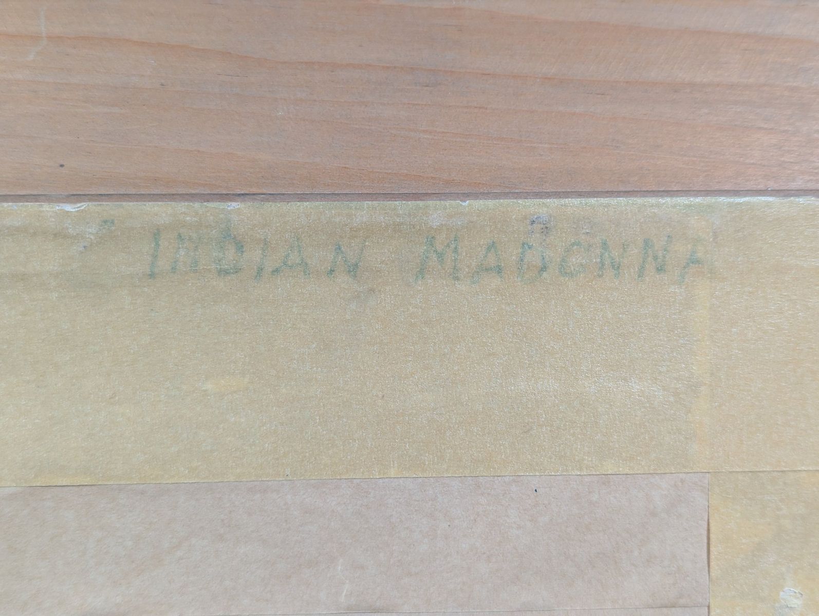 Good; the frame shows minor surface wear on the corners. The artwork exhibits potential water damage and warping on the lower portion of the drawing surface, and there is visible water staining on the paper backing. The artwork has not been removed from the frame to determine the full extent of the damage.