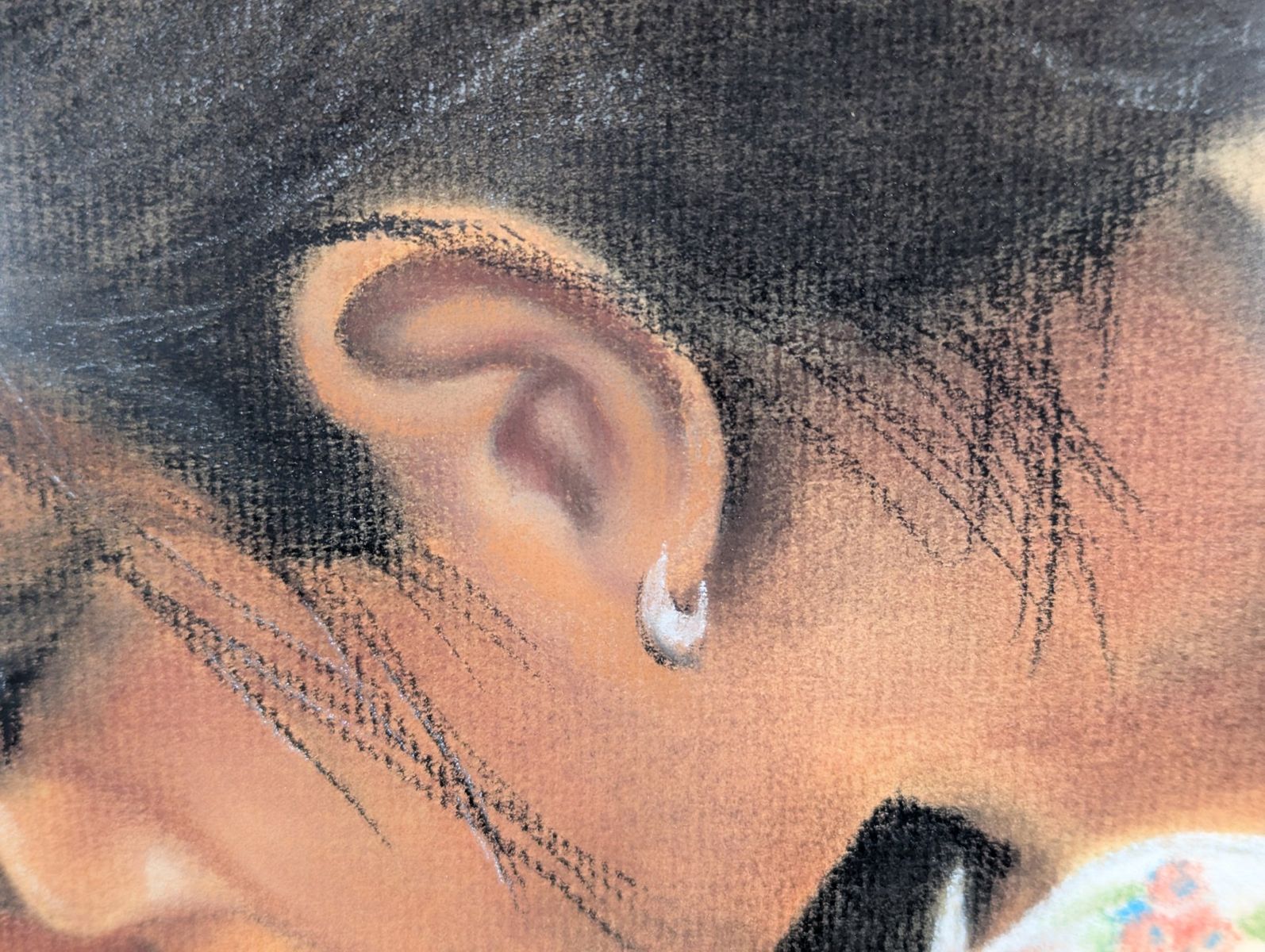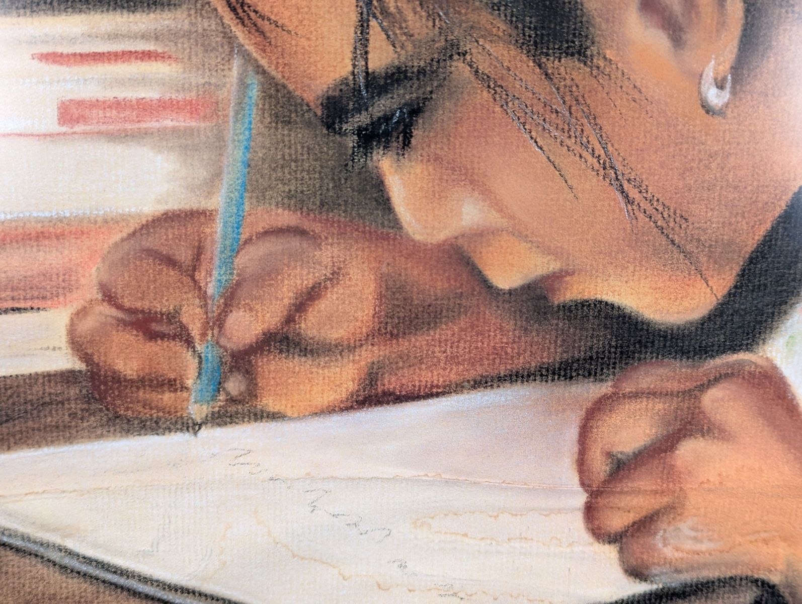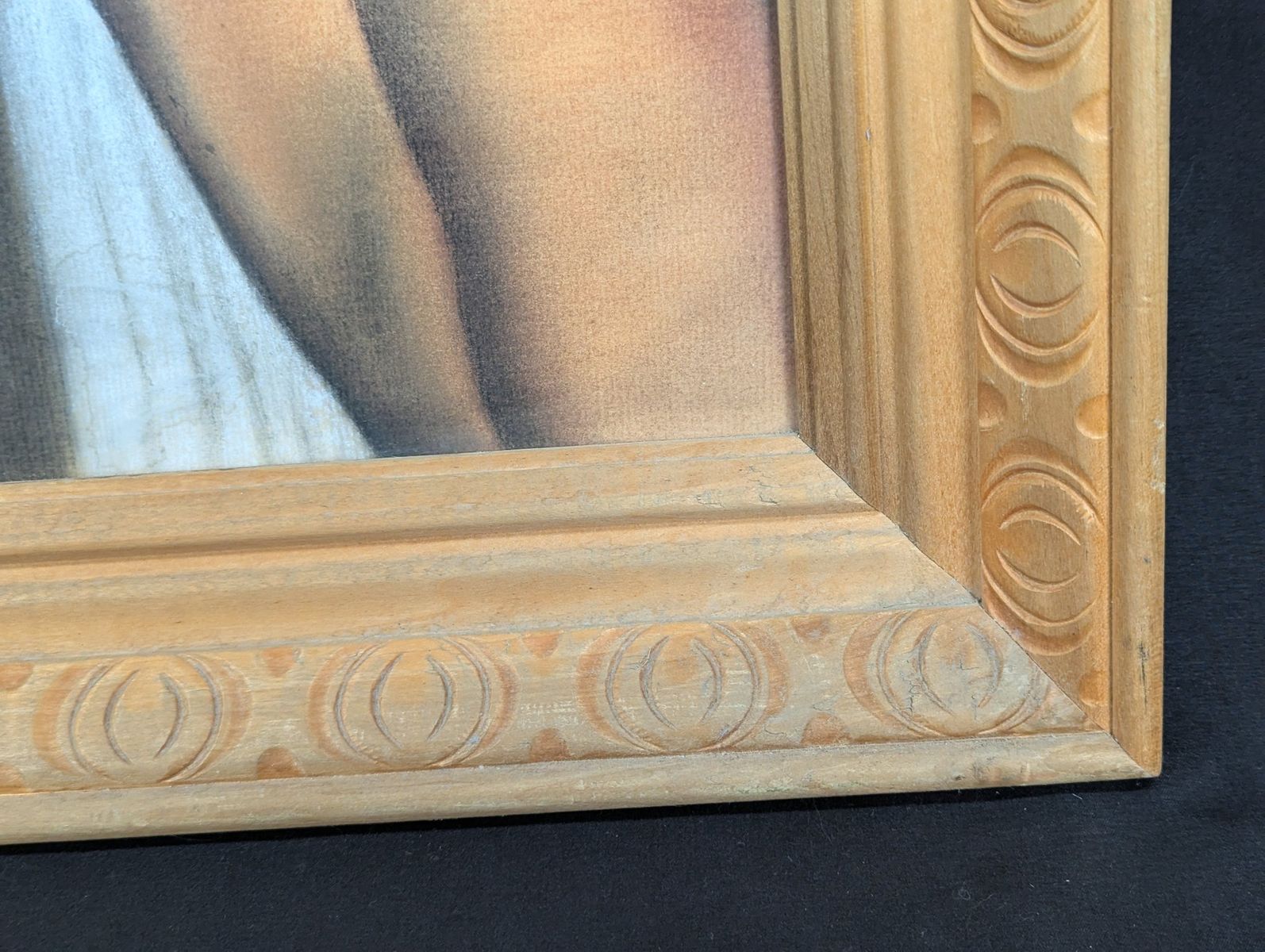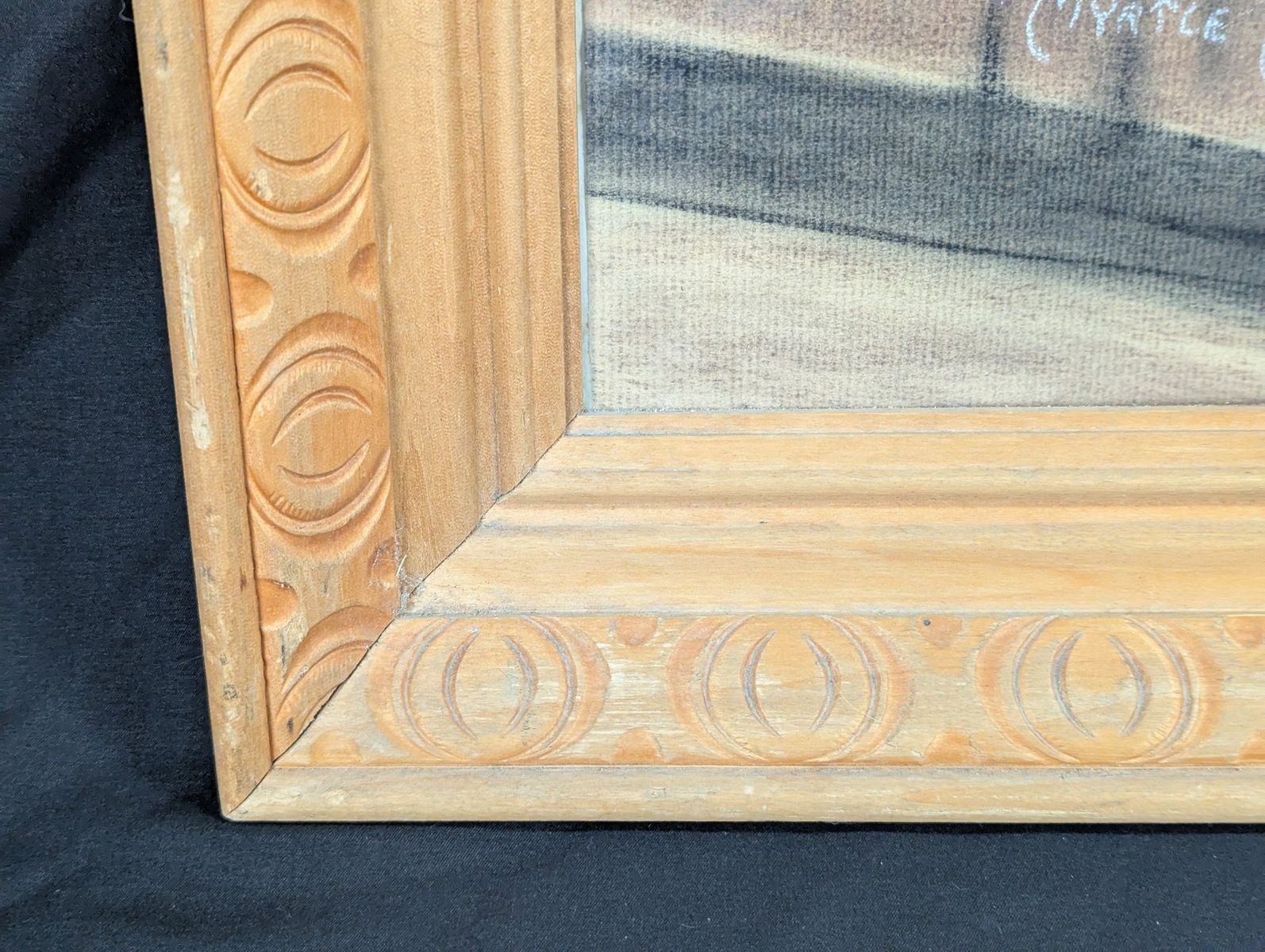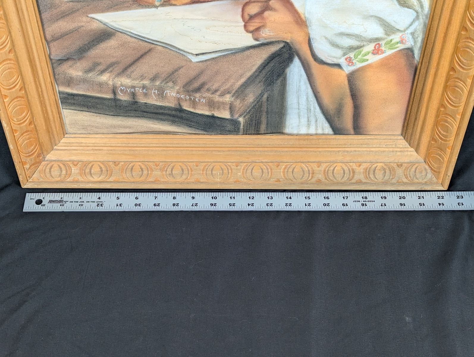 VenmoOriginal pastel portrait by artist Myrtle H. Troester, featuring a young girl writing at a desk. This mid-century aesthetic piece is housed in a vintage carved wooden frame with a circular pattern. The artwork is titled Indian Madonna on the reverse side.