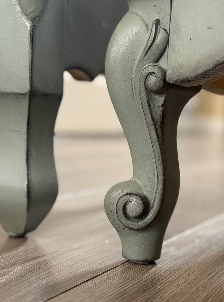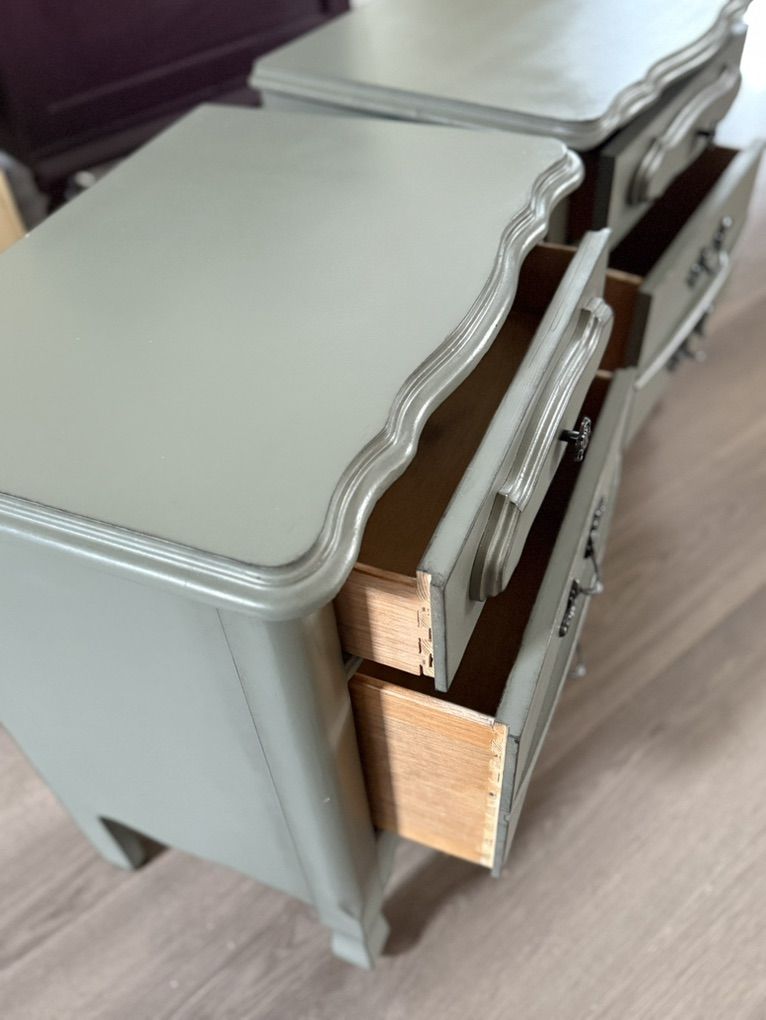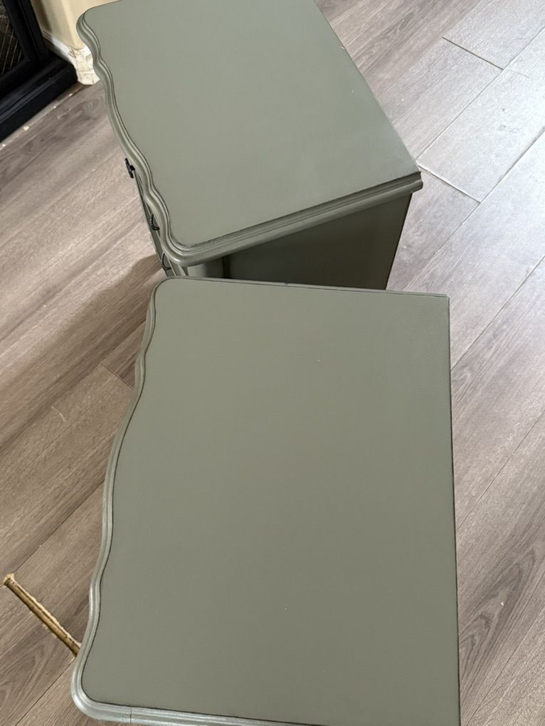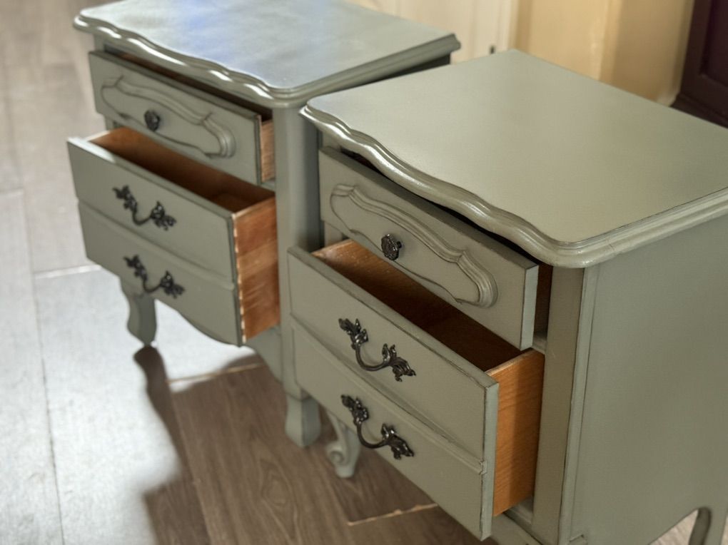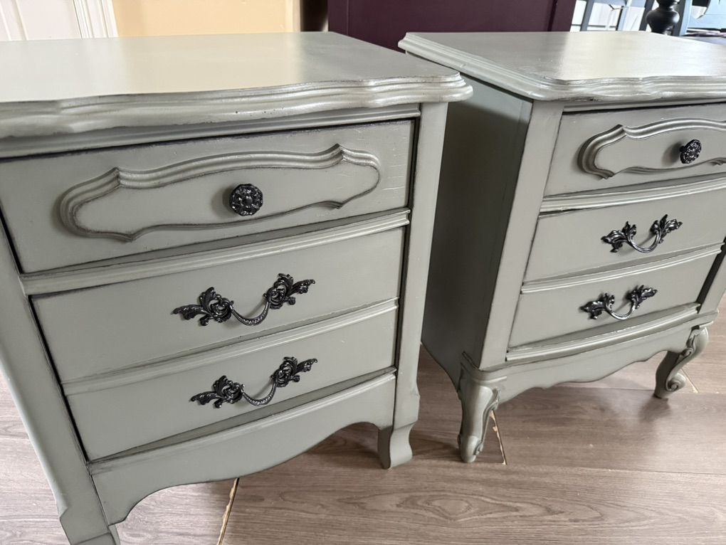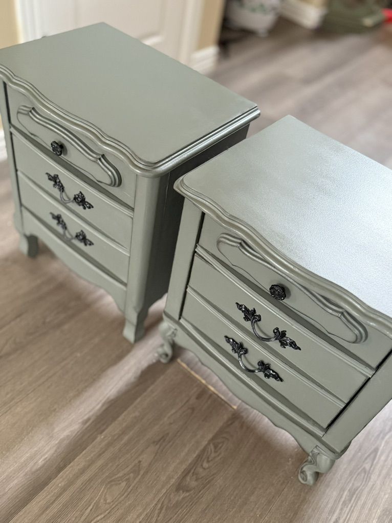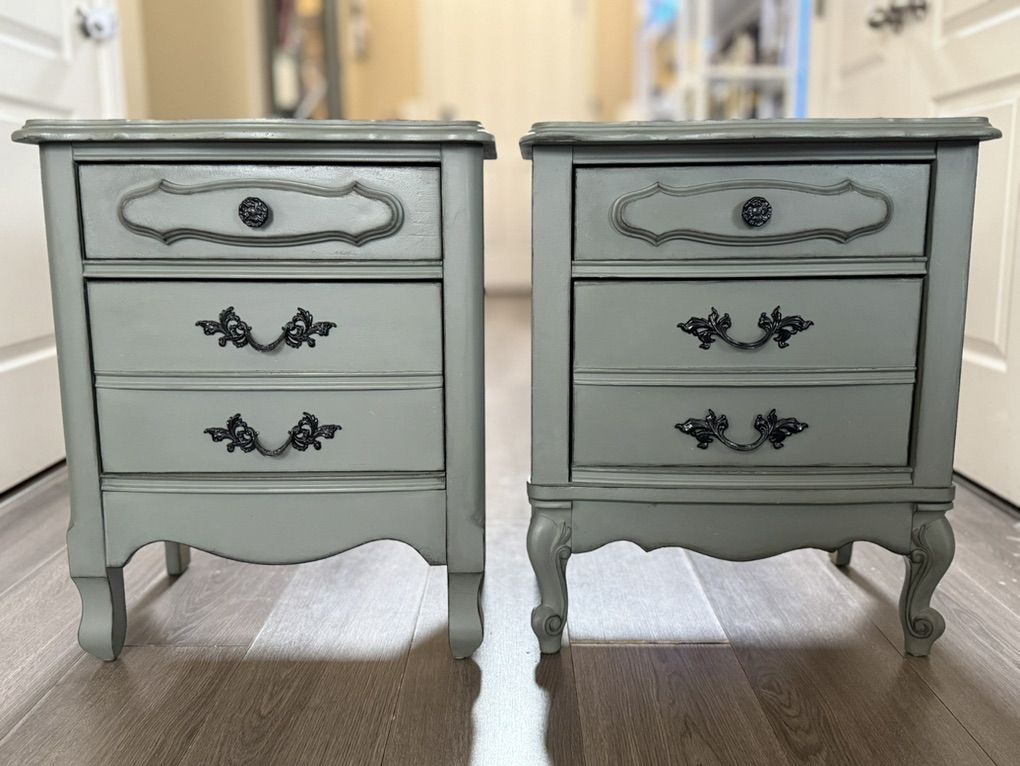 2 vintage French provincial nightstands finished in a very neutral pewter green.