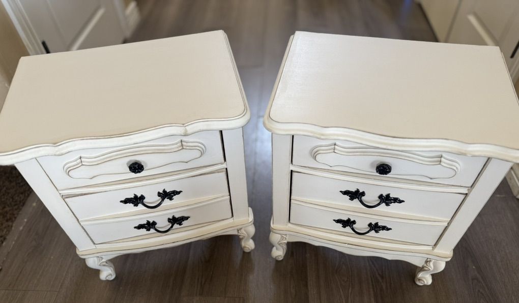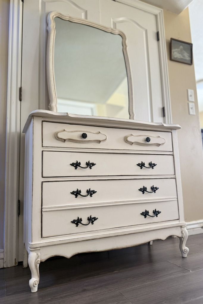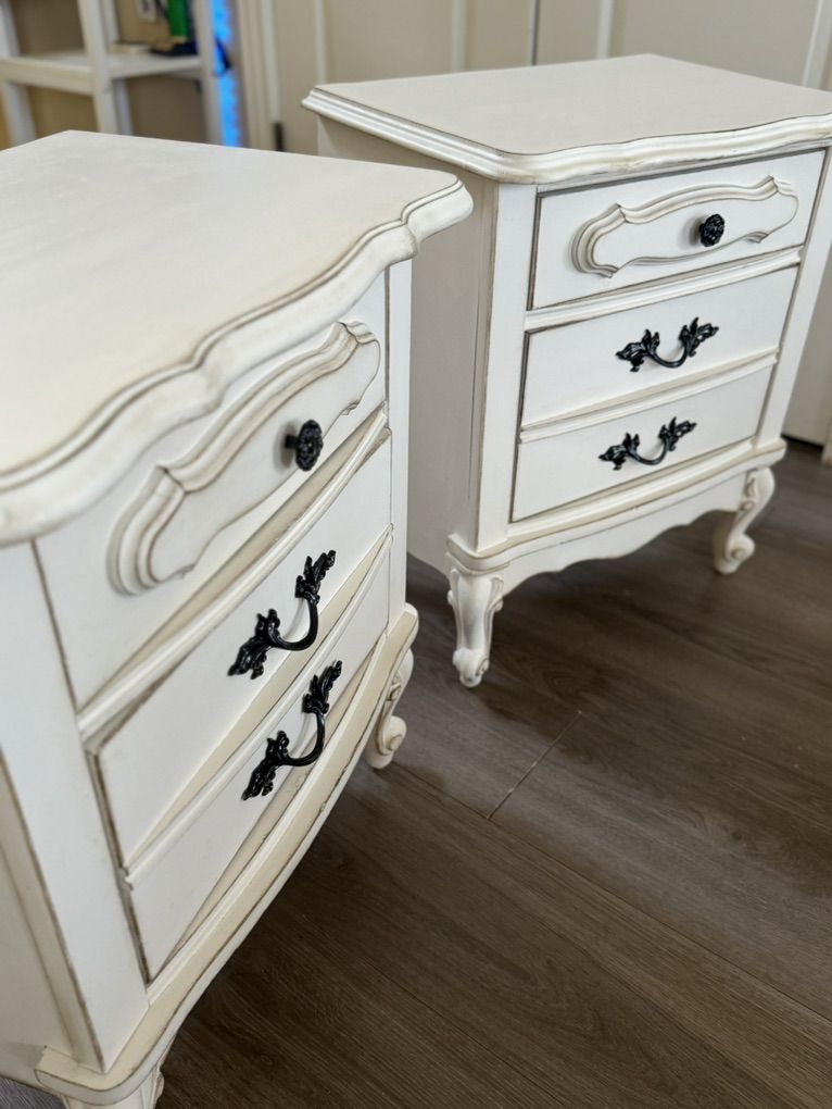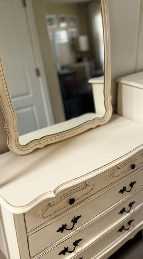 Finished in a really beautiful and neutral creamy antiqued white. 3 layers of top coats added for extra durability, all sanded well in between coats to feel buttery smooth! Subtle antiquing and very very soft distressing to really complete the high end vintage look. There is so much little pretty detail that is noticeable in person!!