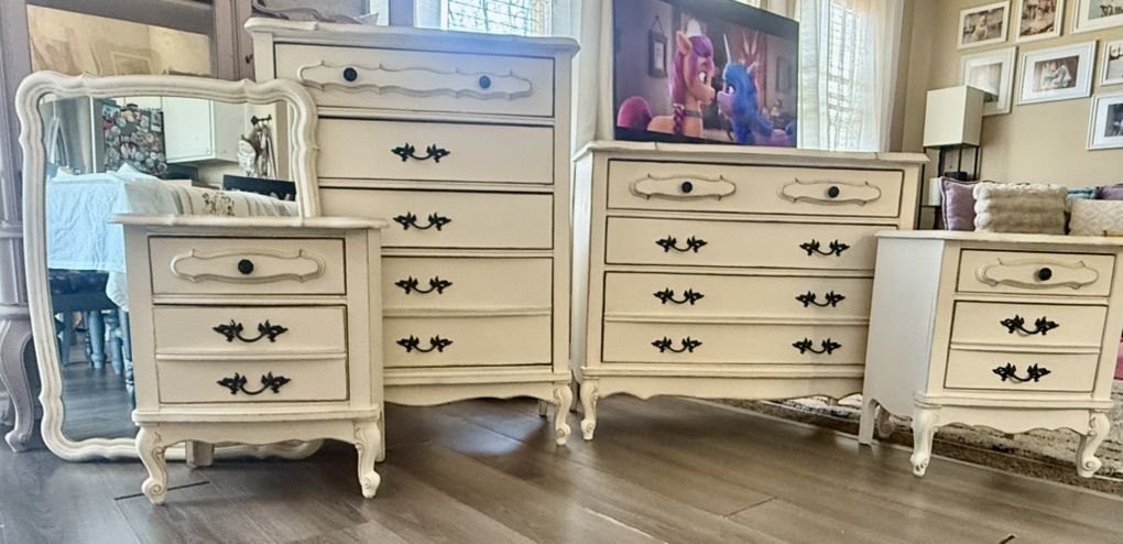 This set comes with; Mirror Tall dresser Shorter wide dresser 2 end tables All pieces/hardware original to this specific vintage set