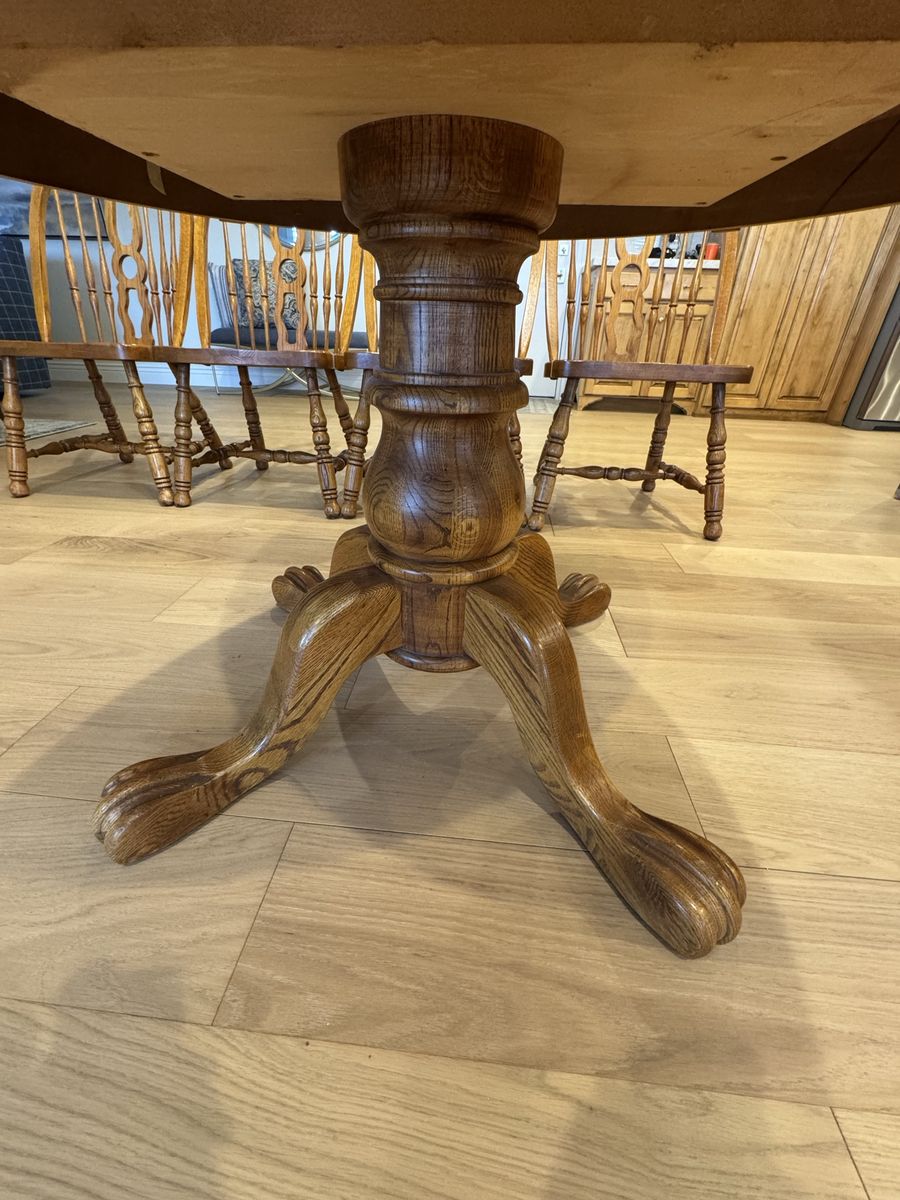 Keller heirloom round oak dinning table with 4 chairs and 2 leafs. The table has a 4 leg pedestal with claw feet, rounds, and coves. The chairs have a formed seat bottom, semi- solid back and lathe turned ornate spindles.