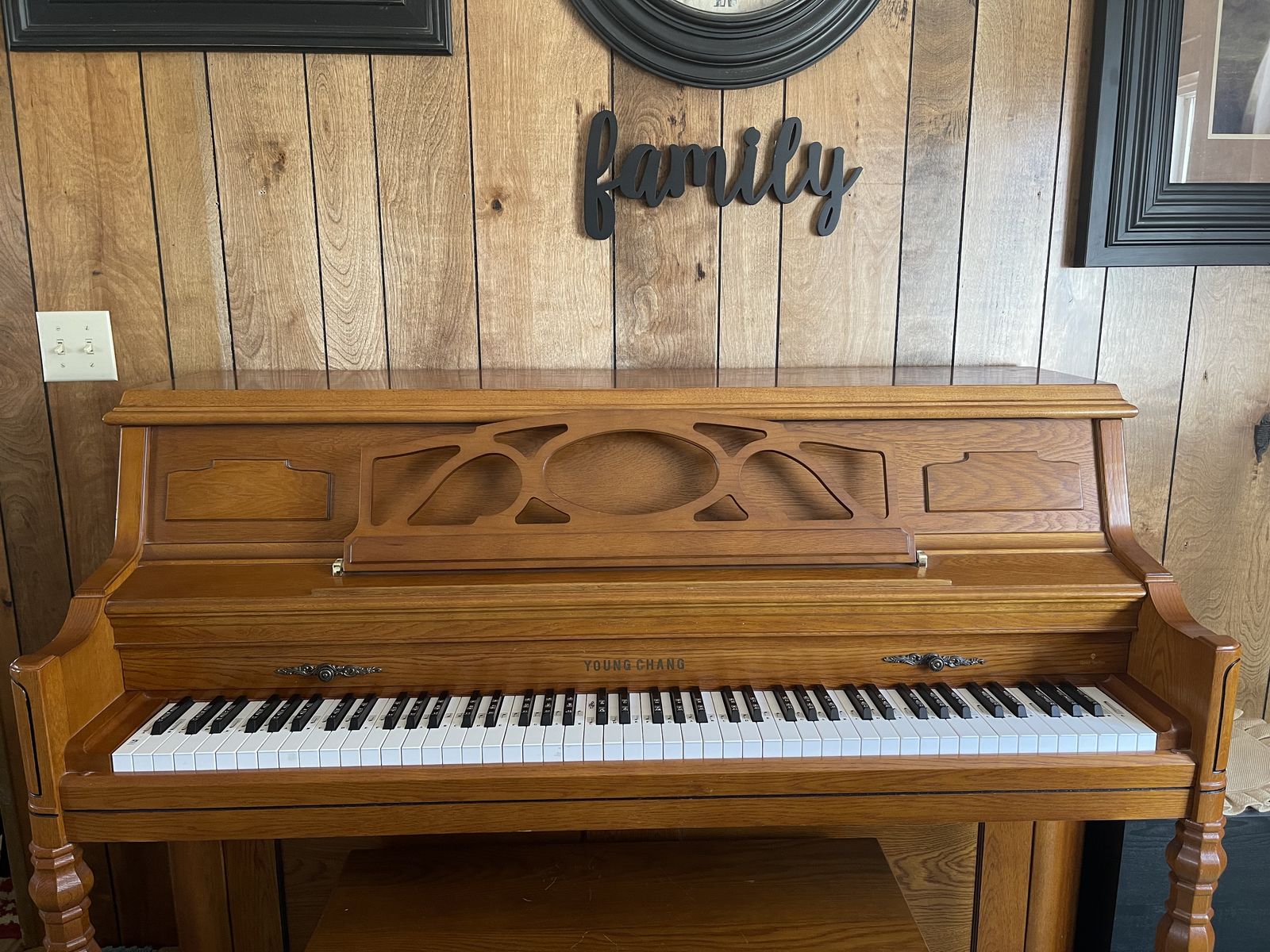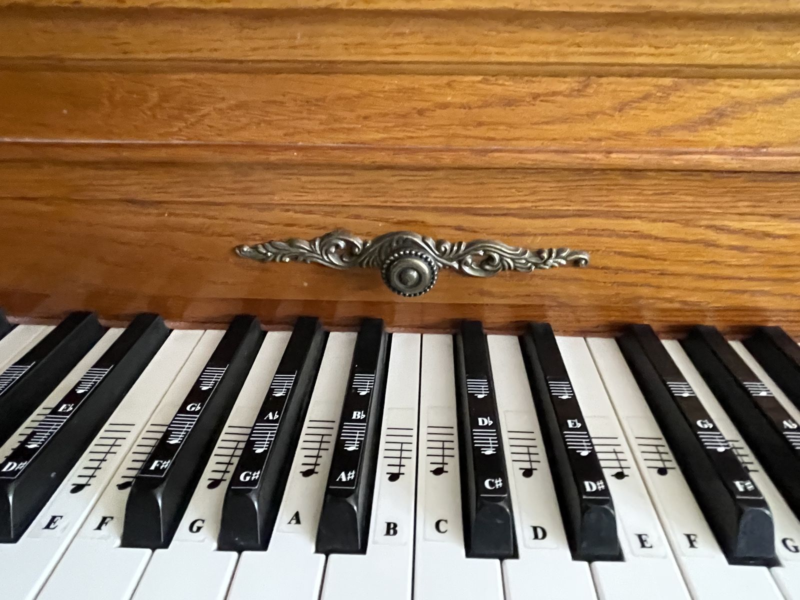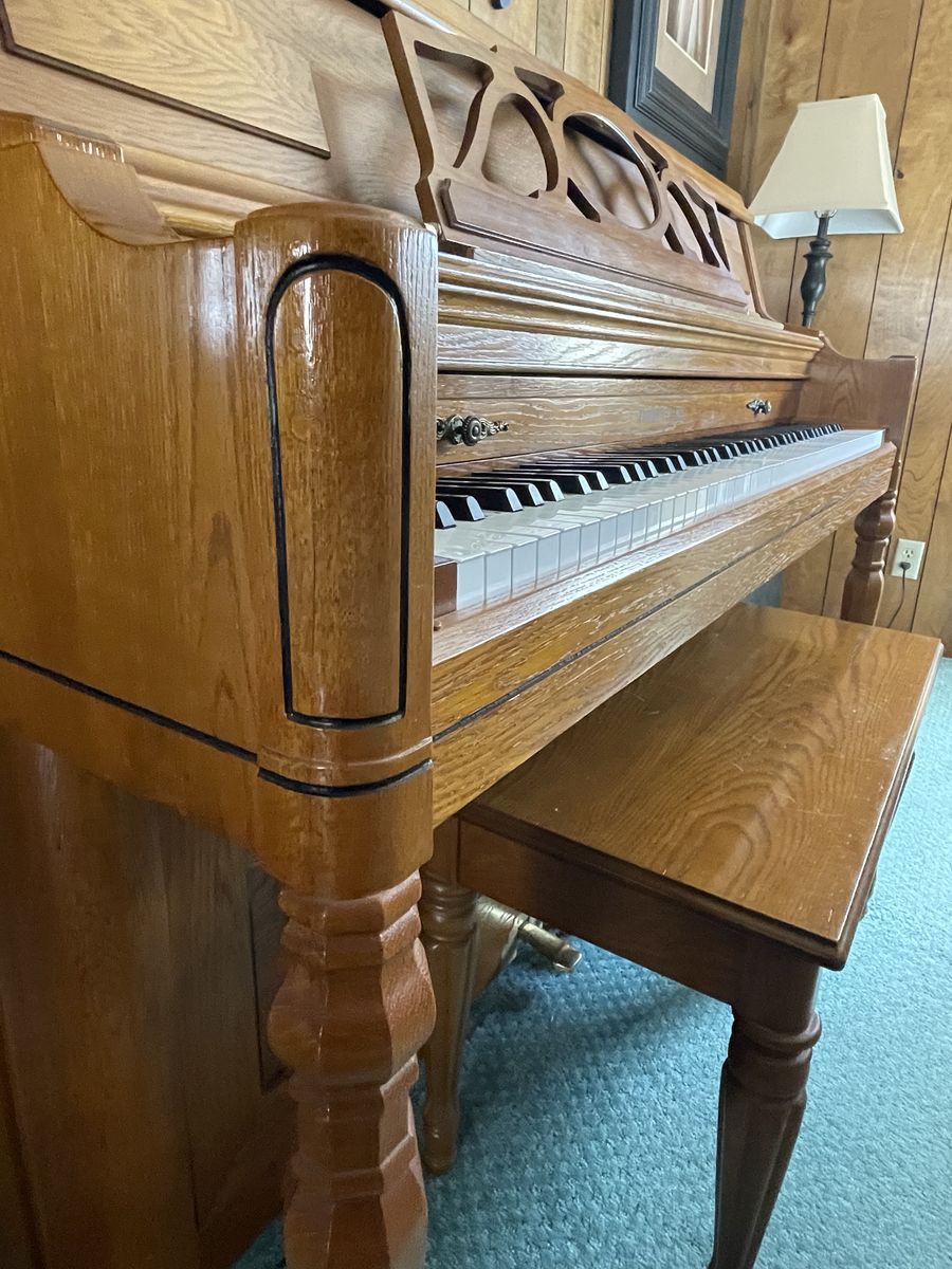 ApplePayThis beautiful oak piano is in good condition the keys play well and it has great sound. It was last tuned about a year and a half ago, the petals all work. The only part that has some wear is the bench, it had some scratches when I bought it from a piano dealer in Ogden. The bench holds lots of sheet music. The keys do have clear stickers on them for beginner pianists but they are easily removable. The lid closes without any issues. Measurments are listed in photos.
