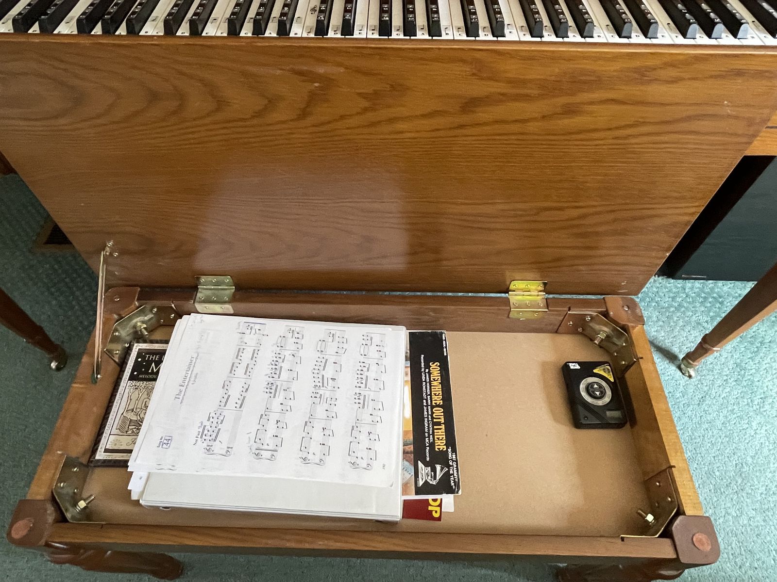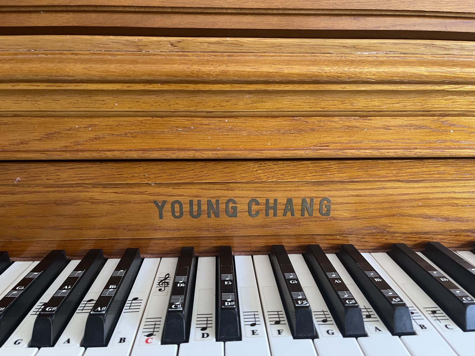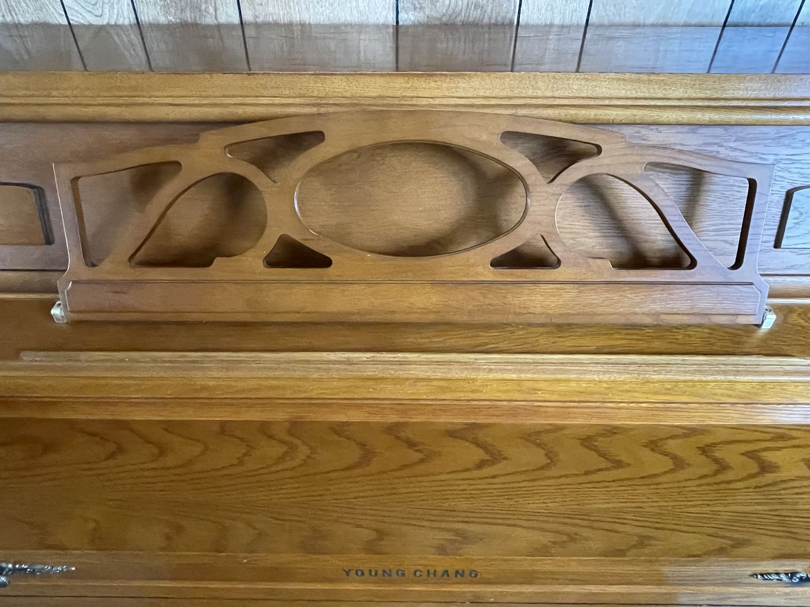 ApplePayThis beautiful oak piano is in good condition the keys play well and it has great sound. It was last tuned about a year and a half ago, the petals all work. The only part that has some wear is the bench, it had some scratches when I bought it from a piano dealer in Ogden. The bench holds lots of sheet music. The keys do have clear stickers on them for beginner pianists but they are easily removable. The lid closes without any issues. Measurments are listed in photos.